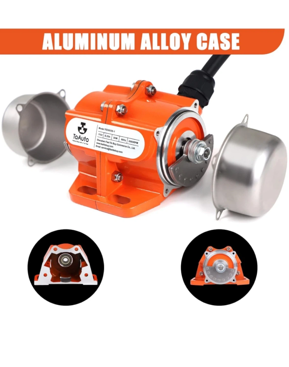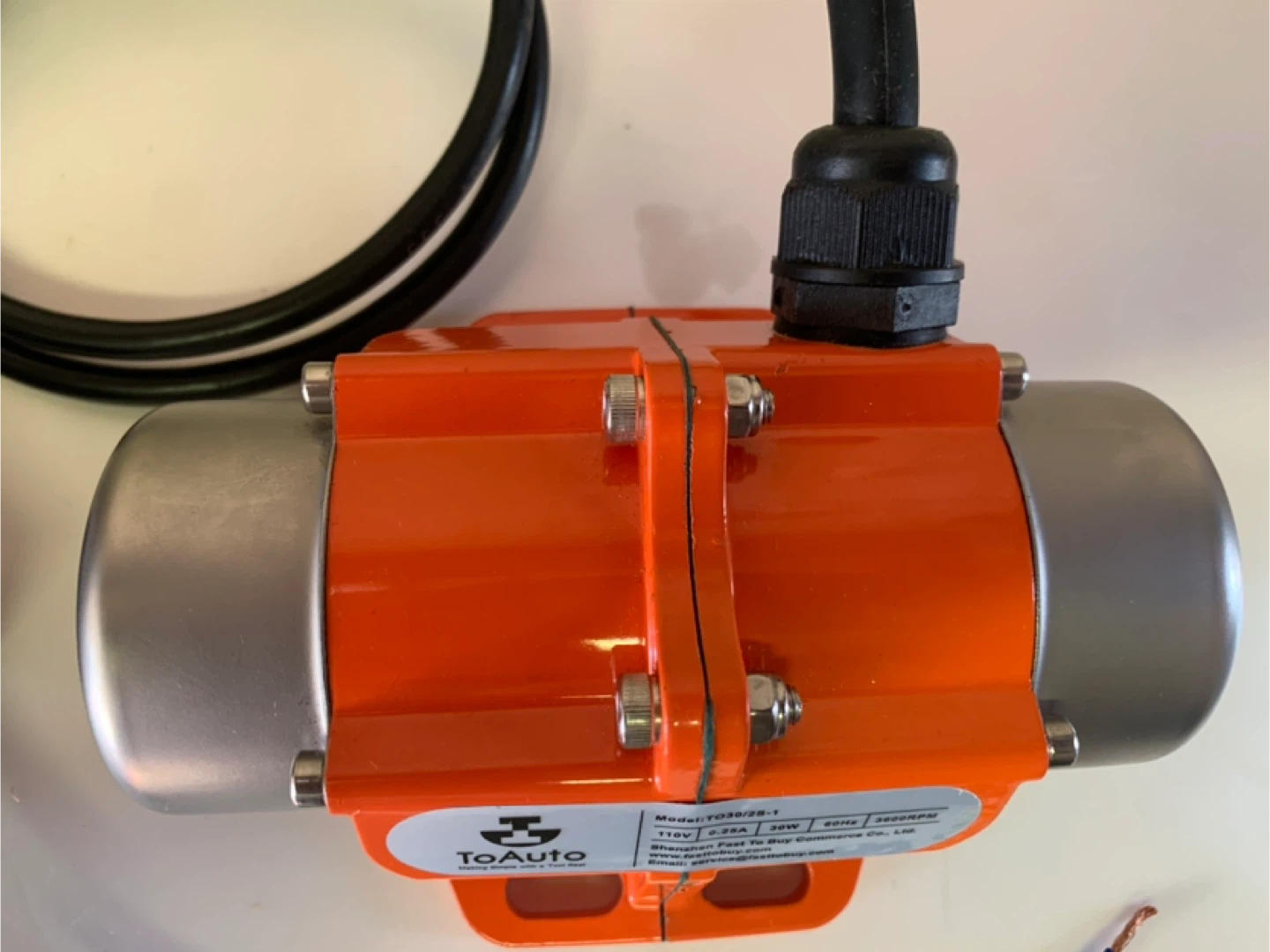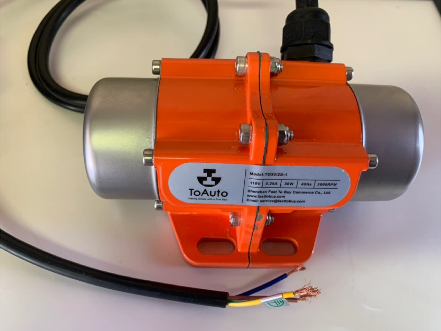 Selling a ToAuto vibratory motor, model TO30/2S-1. It operates at 110V, 0.25A, 30W, and 60Hz, with a speed of 3600RPM. Great for various applications!