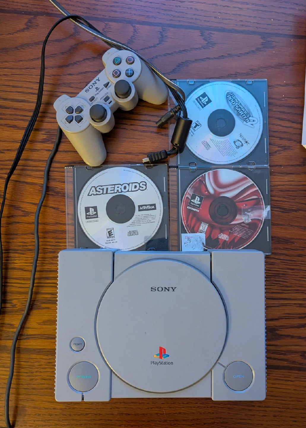 I have a working PlayStation 1. It will come with 1 gray DualShock controller. I have 3 games in very basic CD cases: Twisted Metal 2, Tony Hawk's Pro Skater 2, and Asteroids. I tested this today as shown in the pictures and it works great. No memory card included. Will include the AV cords that will hook it up to the TV and the AC adapter.