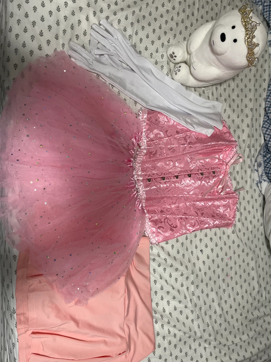Inspired on princess Aurora simple costume that includes an adjustable corset, bright pink tutu, and an extract pink skirt to layer up with the tutu or adjust for another look includes princess like long white gloves and a golden tiara perfect for a simple and cute costume this year all included (bear is for display) make for M/L sizes as it’s stretchy and adjustable.