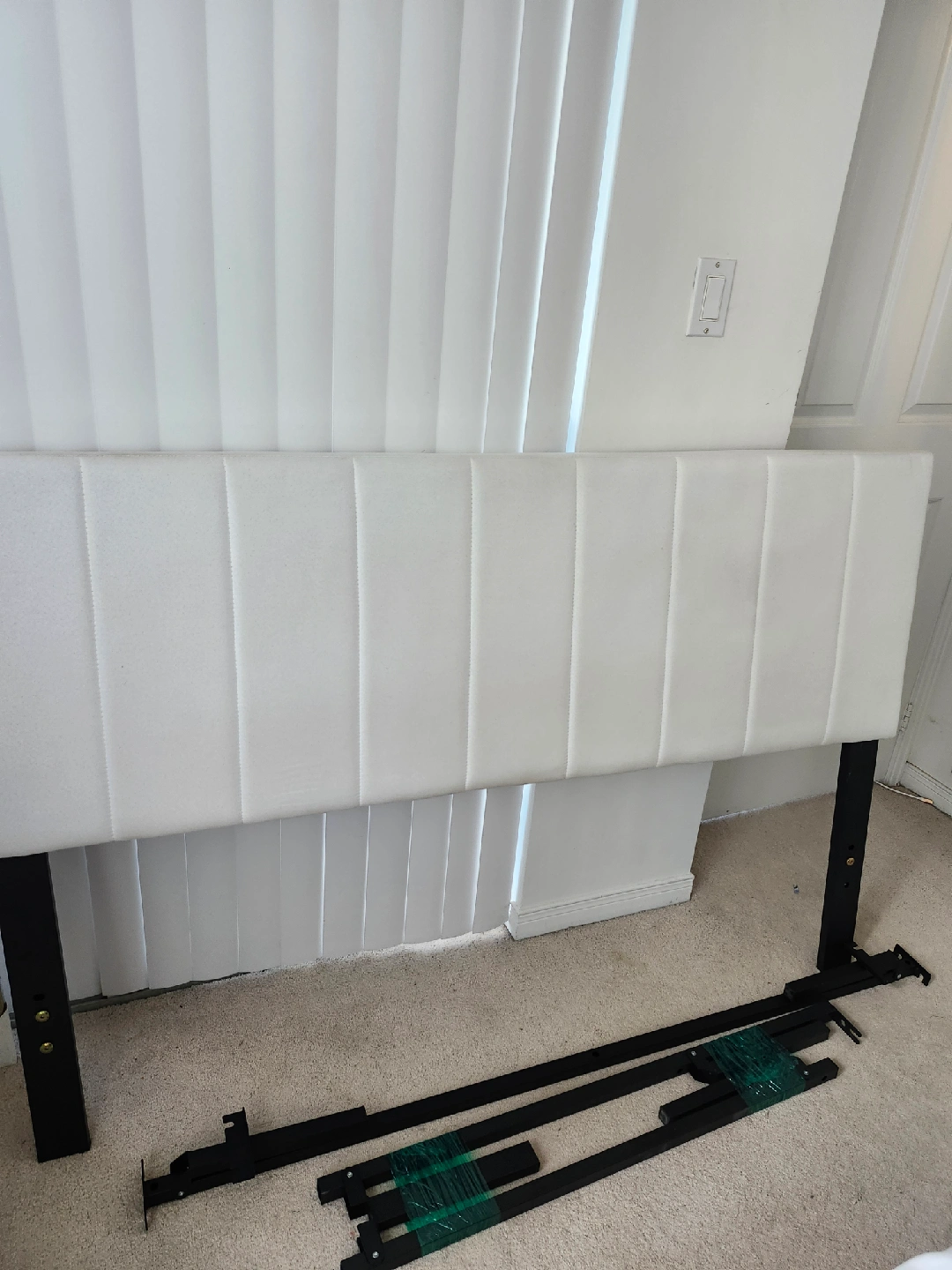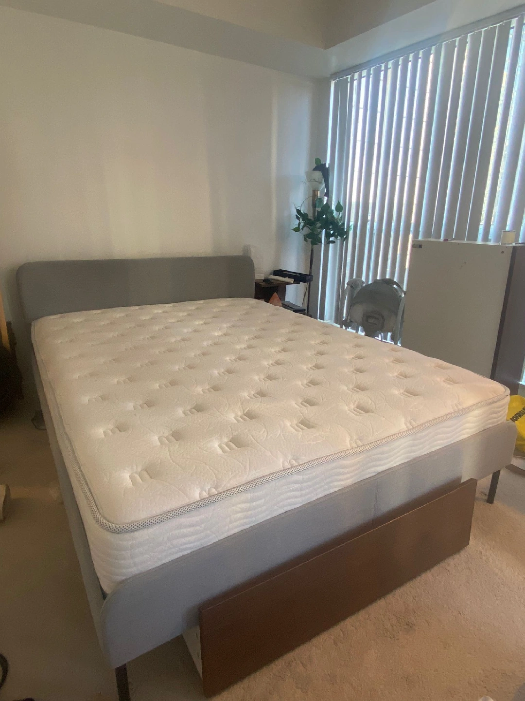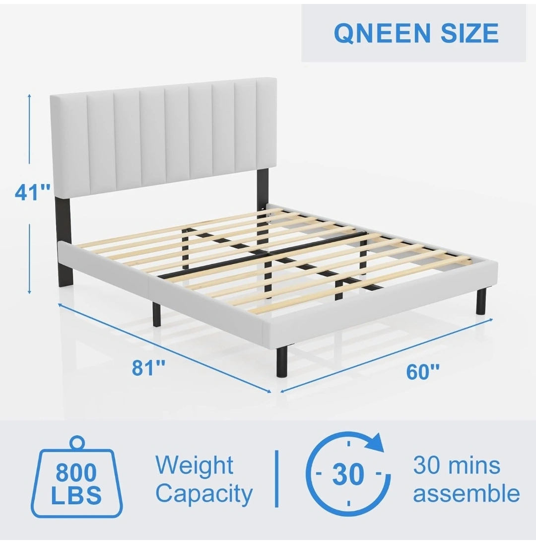 Selling a queen size platform bed frame. It features a white upholstered headboard and a black metal frame with wooden slats. The dimensions are approximately 81" x 60" with a 41" headboard height. It can support up to 800 lbs and takes about 30 minutes to assemble