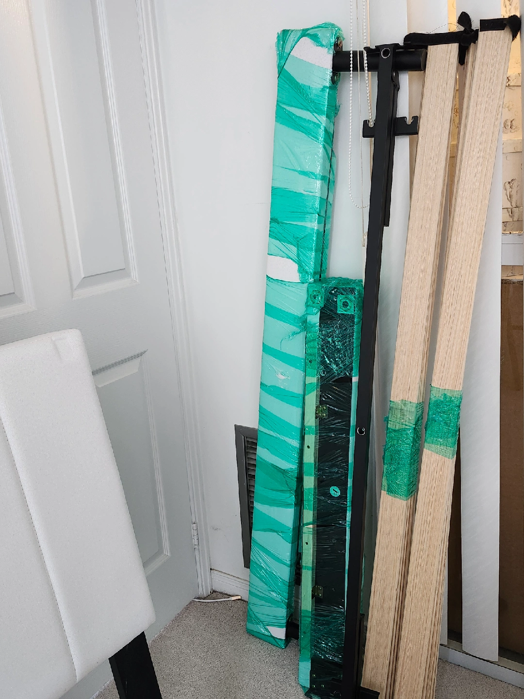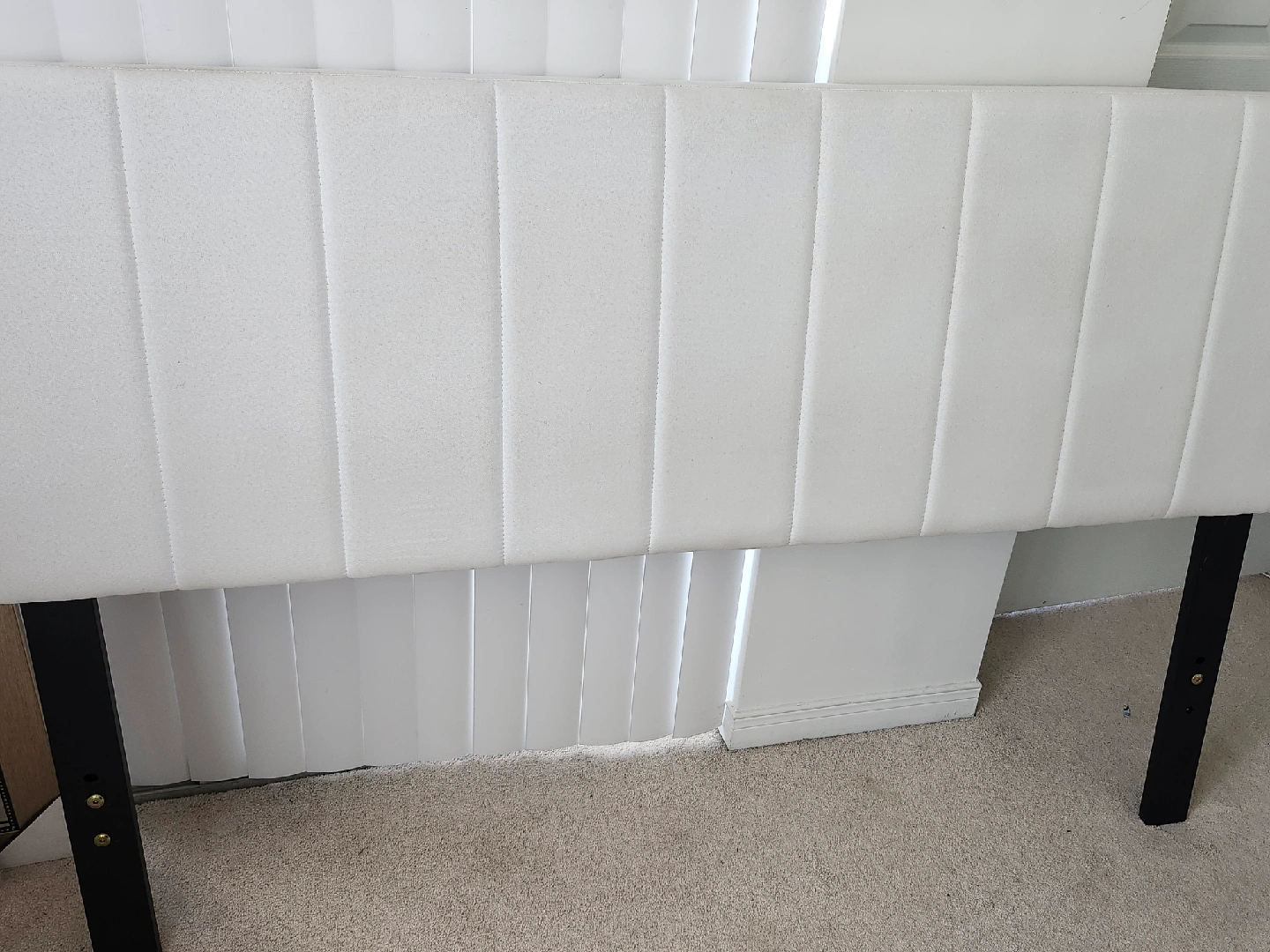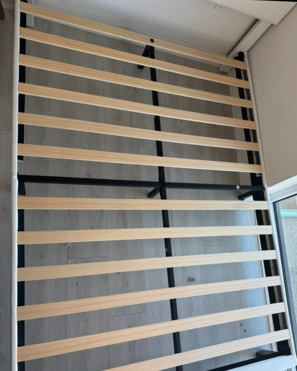 Selling a queen size platform bed frame. It features a white upholstered headboard and a black metal frame with wooden slats. The dimensions are approximately 81" x 60" with a 41" headboard height. It can support up to 800 lbs and takes about 30 minutes to assemble