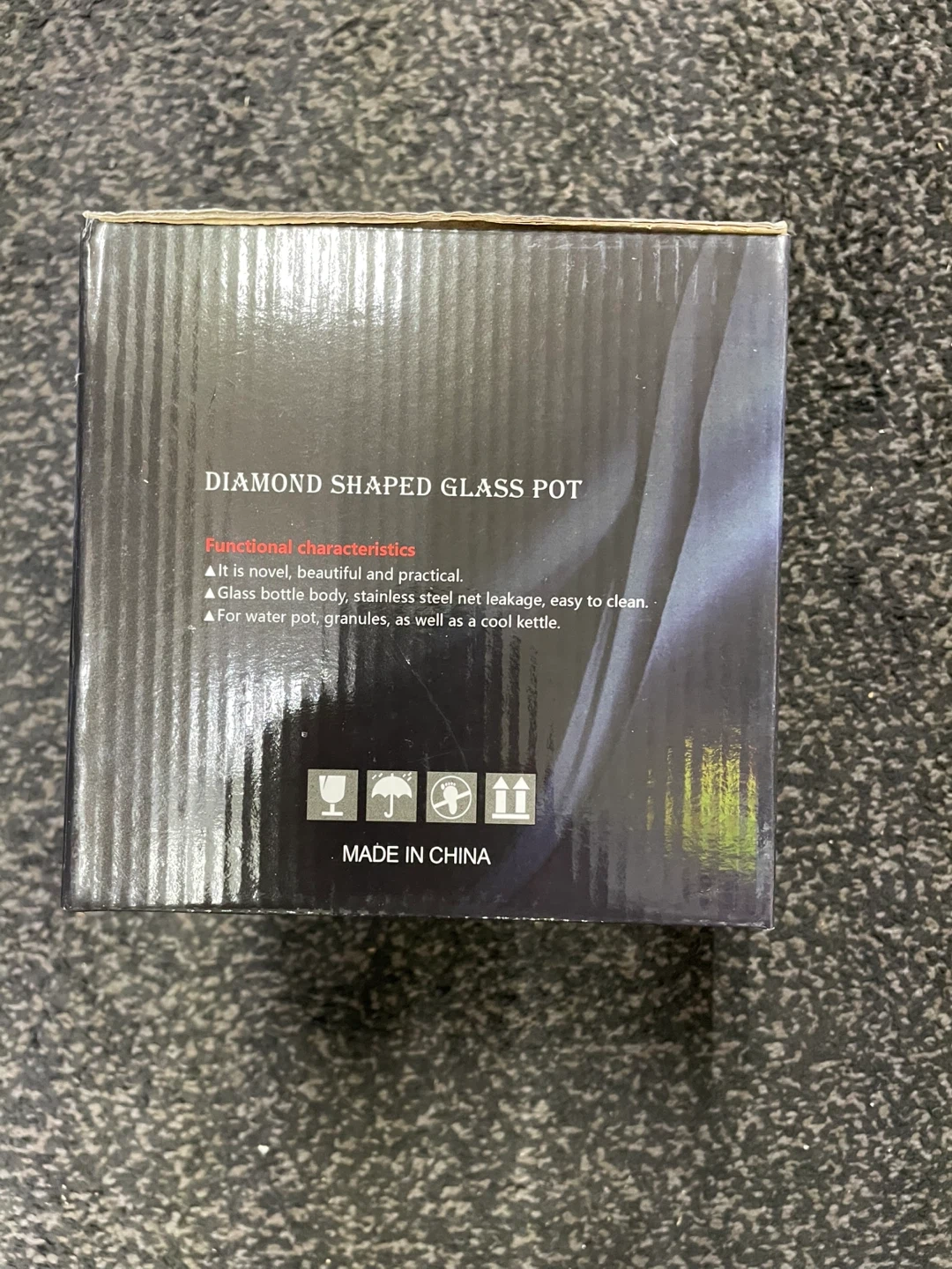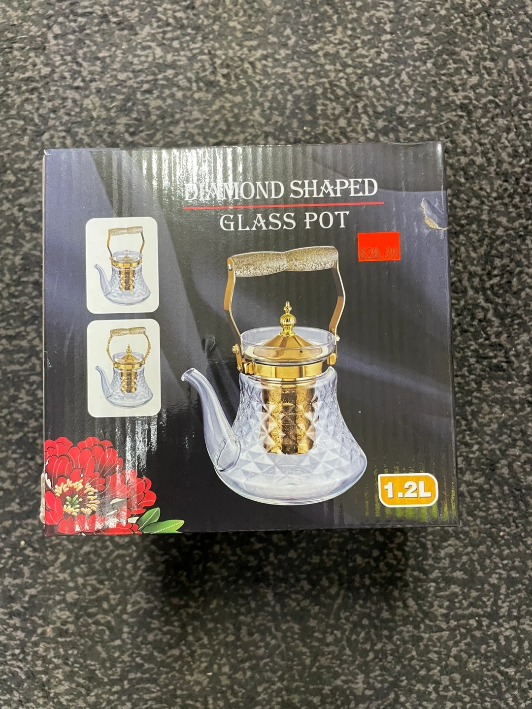 I'm selling a diamond shaped glass pot with a 1.2L capacity. It features a glass bottle body and a stainless steel net for easy cleaning and prevents leakage. It's suitable for water, granules, or even as a cool kettle. The original price was $25.99. It's a novel, beautiful, and practical addition to your kitchen