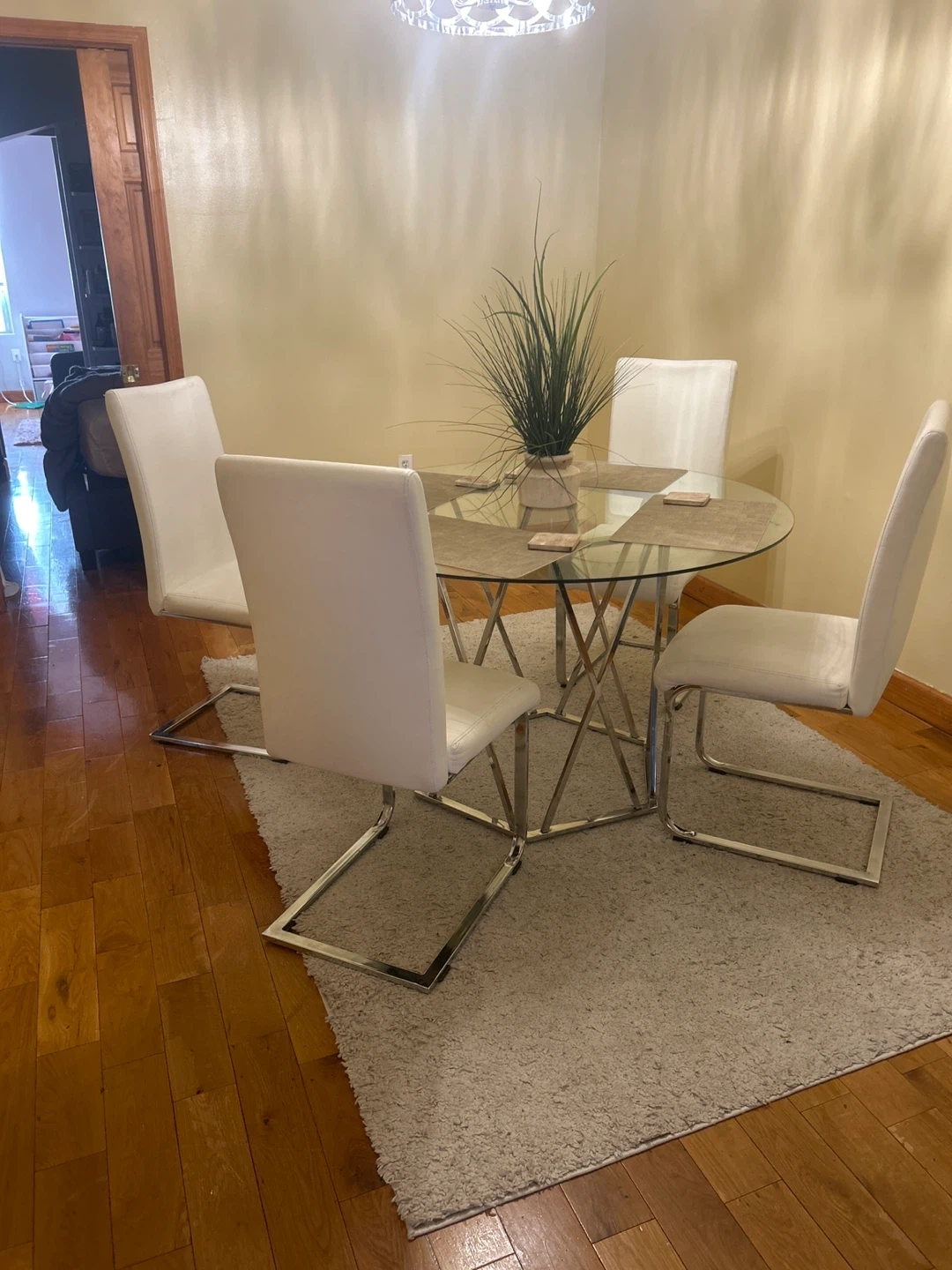 Selling a dining table set that includes a round glass top table and four white chairs. The table features a unique, modern base, and the chairs complement it nicely. Perfect for a smaller dining area!