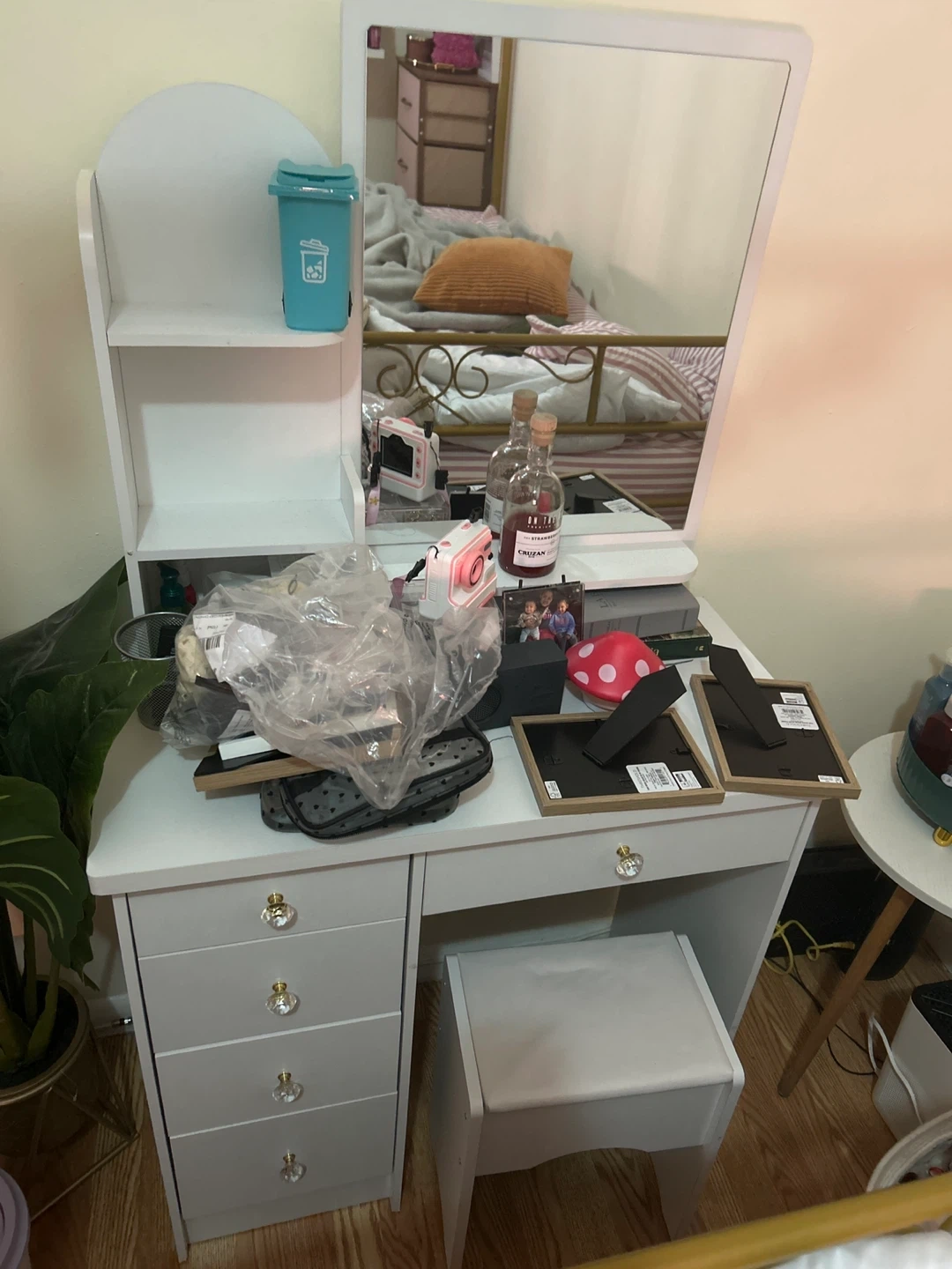 Selling a vanity table with a mirror and stool. It features a white finish, drawers with crystal-style knobs, and a built-in shelf. The set includes the vanity table, mirror, and matching stool.