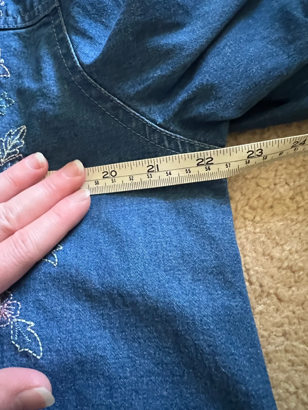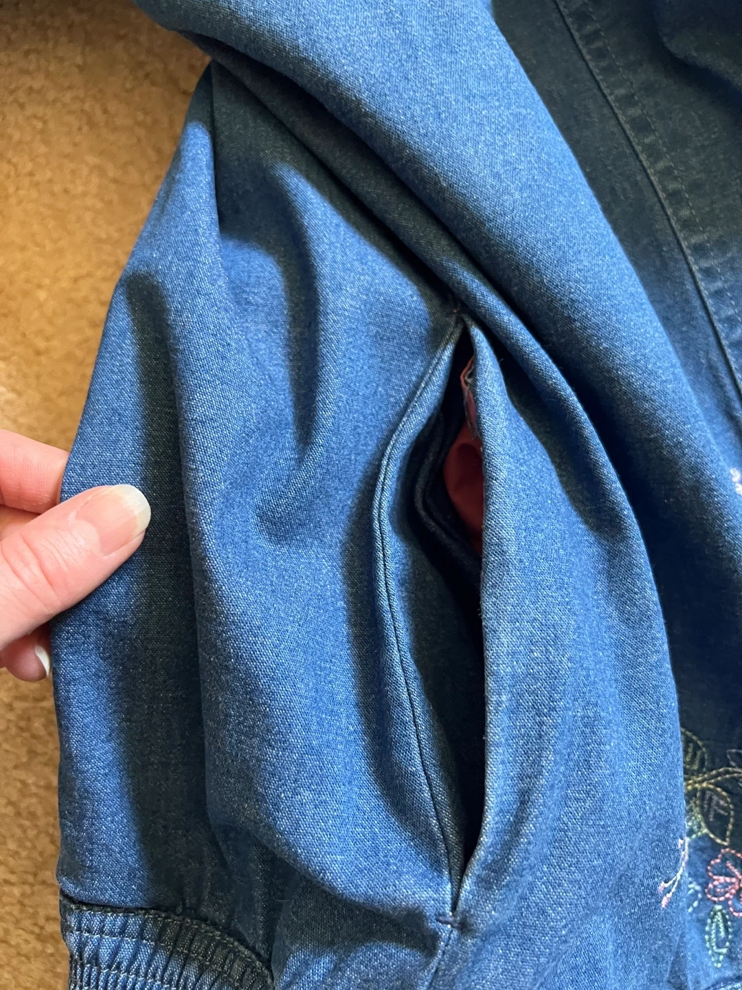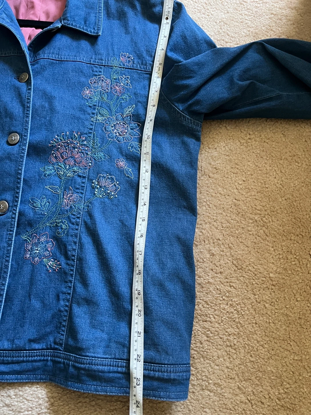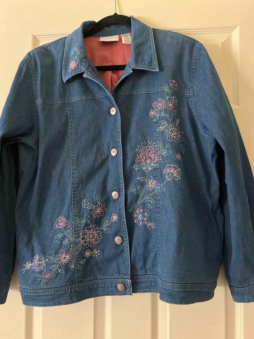 This is a lovely Alfred Dunner denim jacket with beautiful floral embroidery. It's a classic denim blue colour and features a collared neckline and button-down closure. Perfect for adding a touch of charm to any outfit!