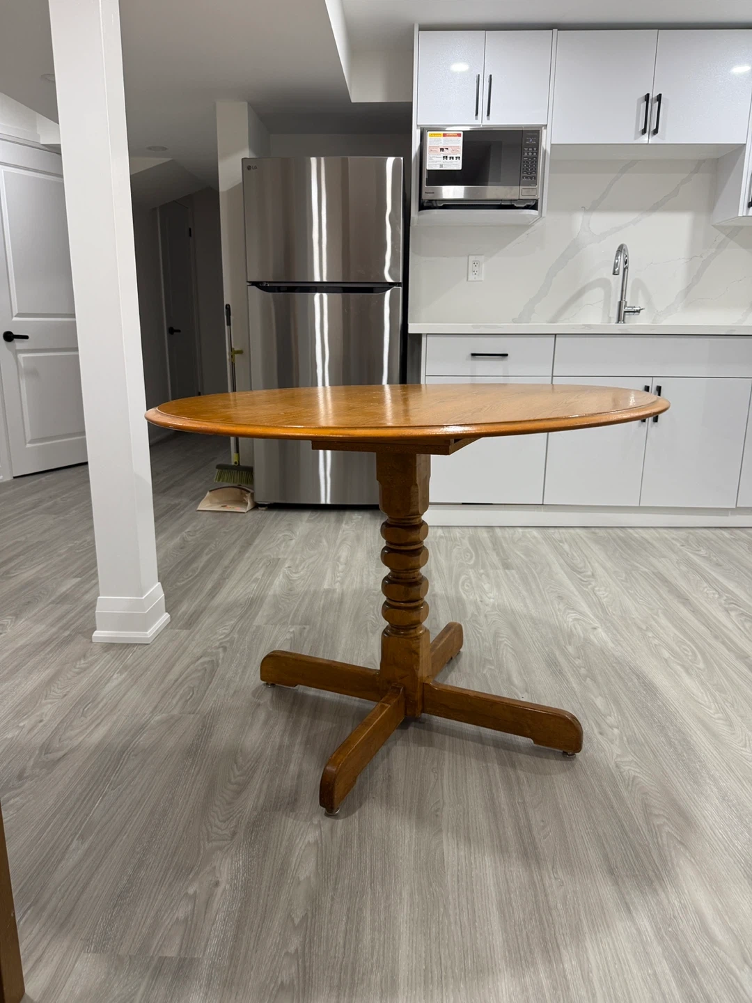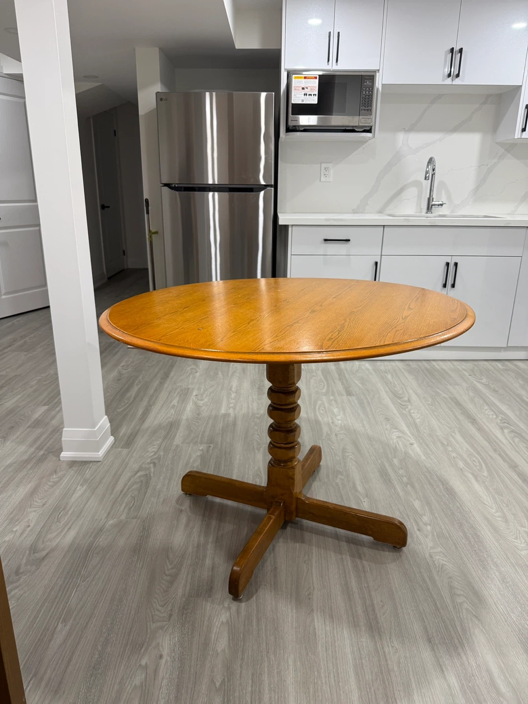 Round wooden table in good condition! The diameter of the table is approximately 42 inches (106 cm) It's a sturdy piece that would look great in any dining room or kitchen