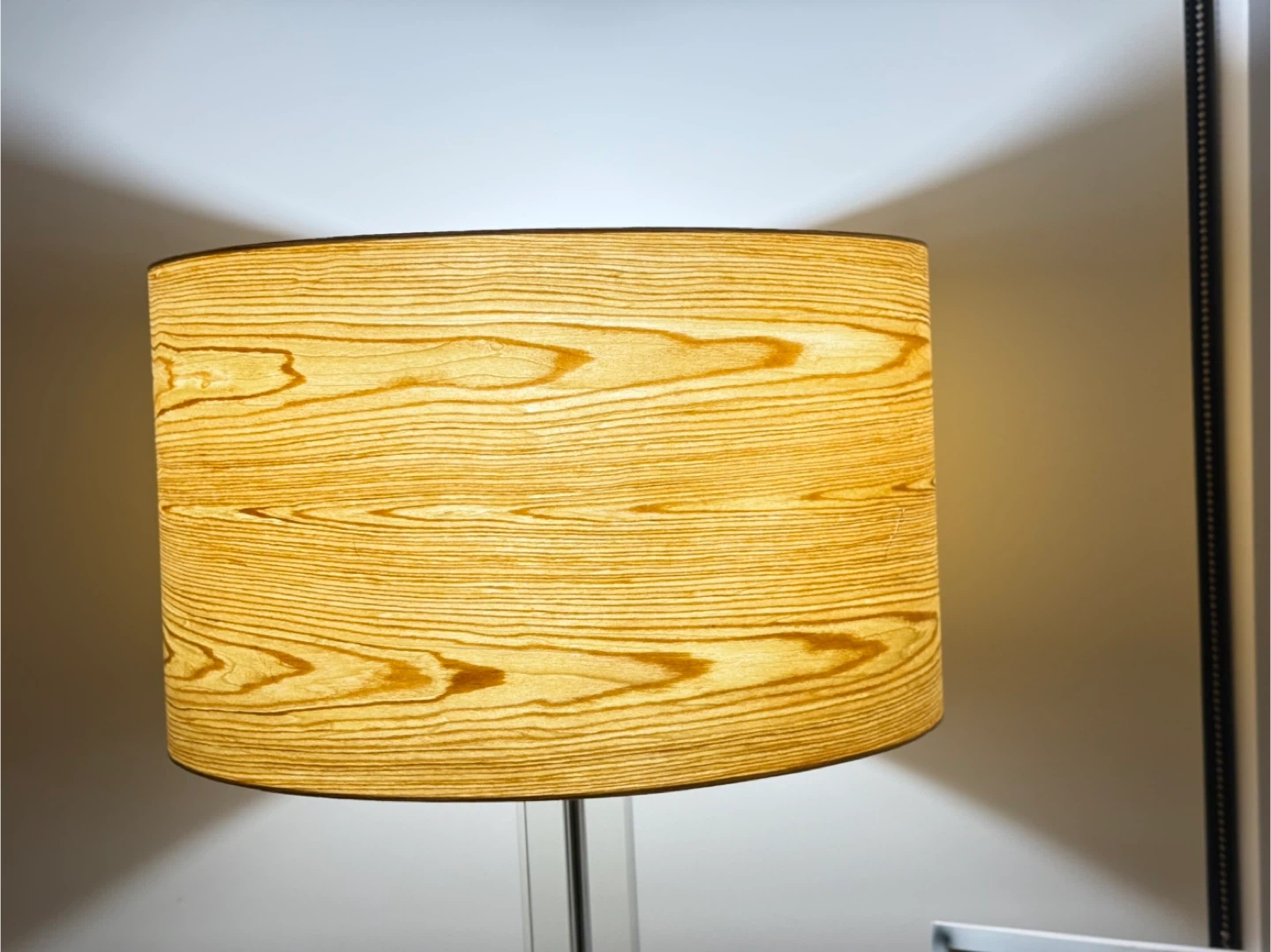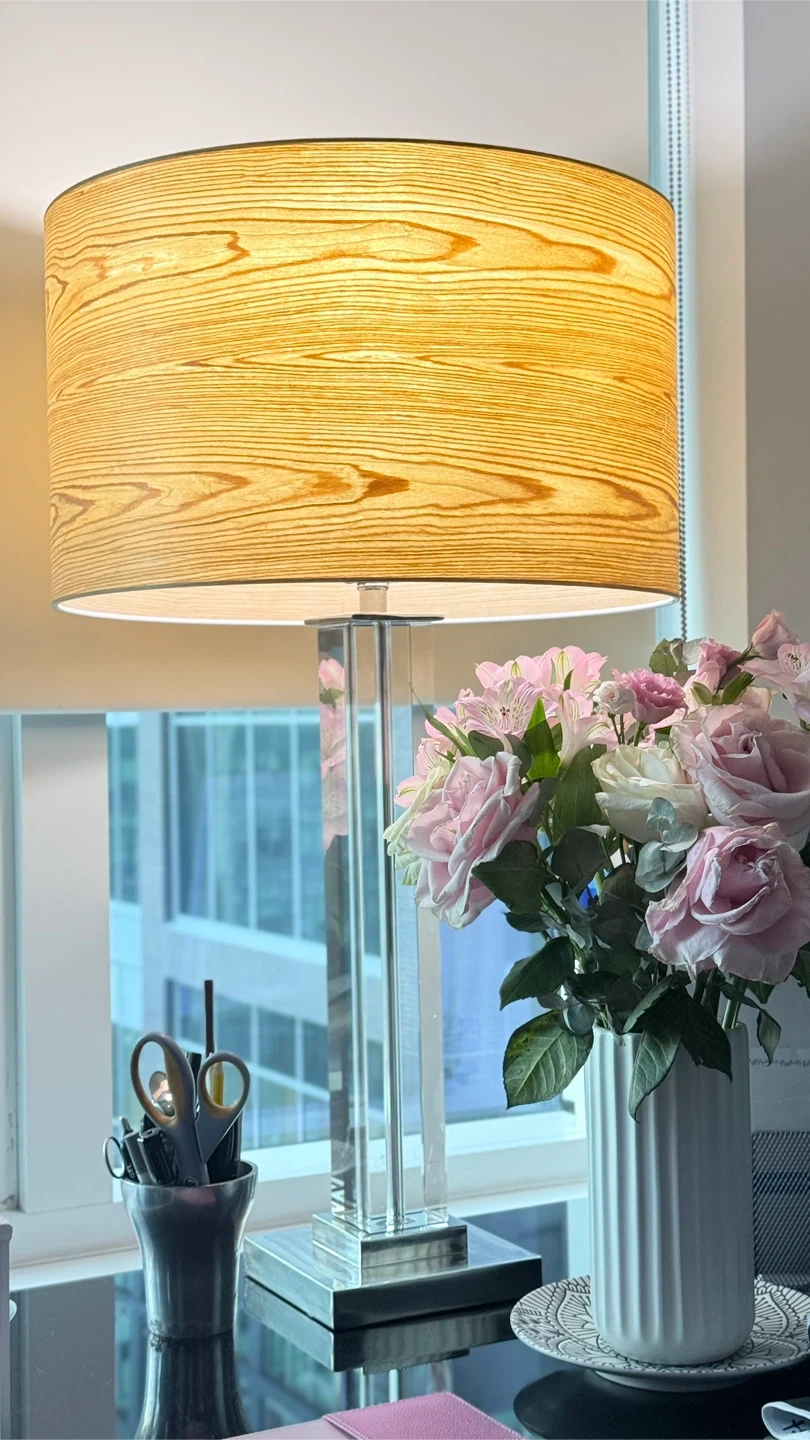 This is a nice real wood grain lamp shade. It has a couple of blemishes 17 1/2”D x 10 1/2”H Images show a warp in one area and a crack in another. I turn the blemish to the wall and can’t see it from the front 🦉 It’s still super cool lamp shade and real it’s wood🙏