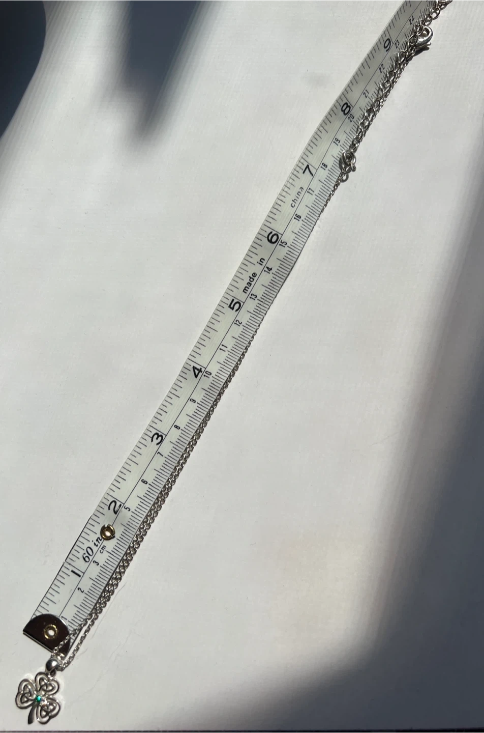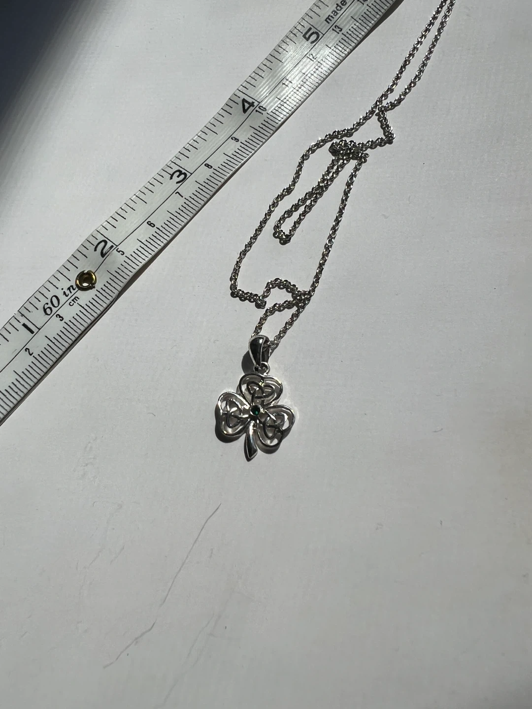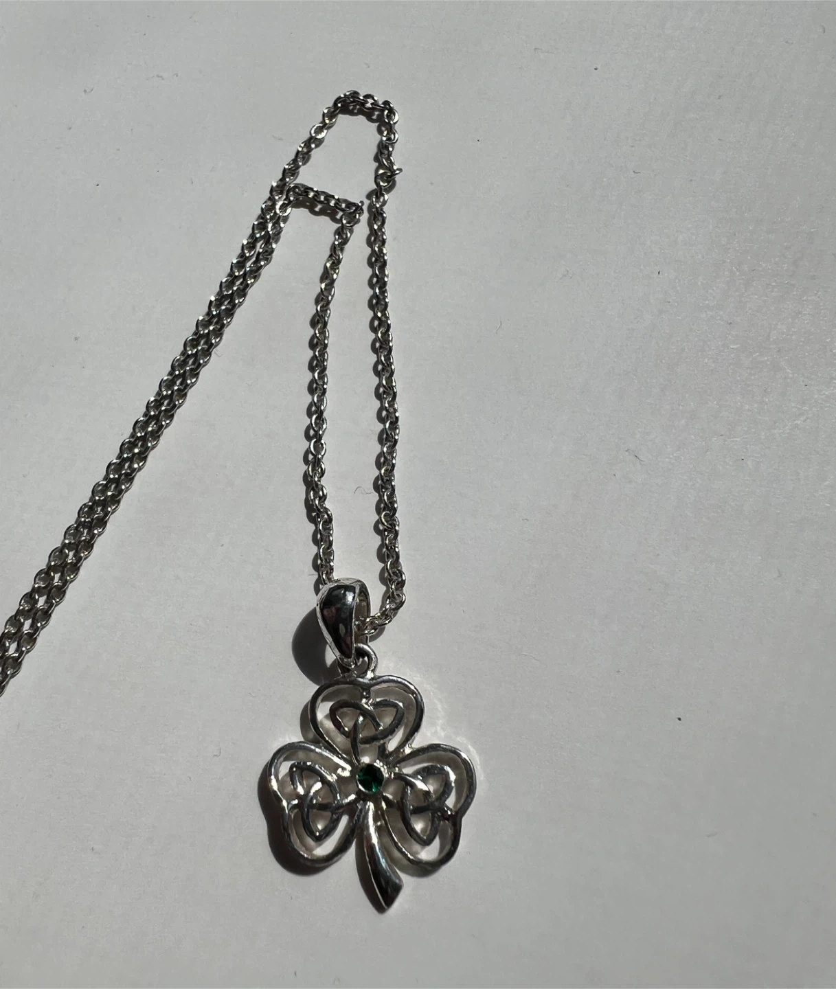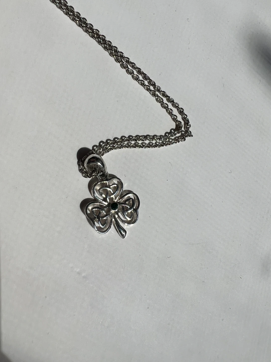 Cute silver necklace with a shamrock pendant! The chain is approximately 18 inches long. The shamrock has a small green stone in the center. Perfect for adding a touch of Irish charm to your outfit!