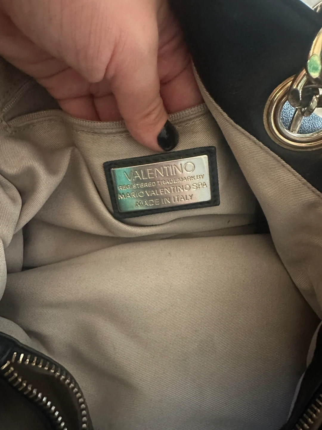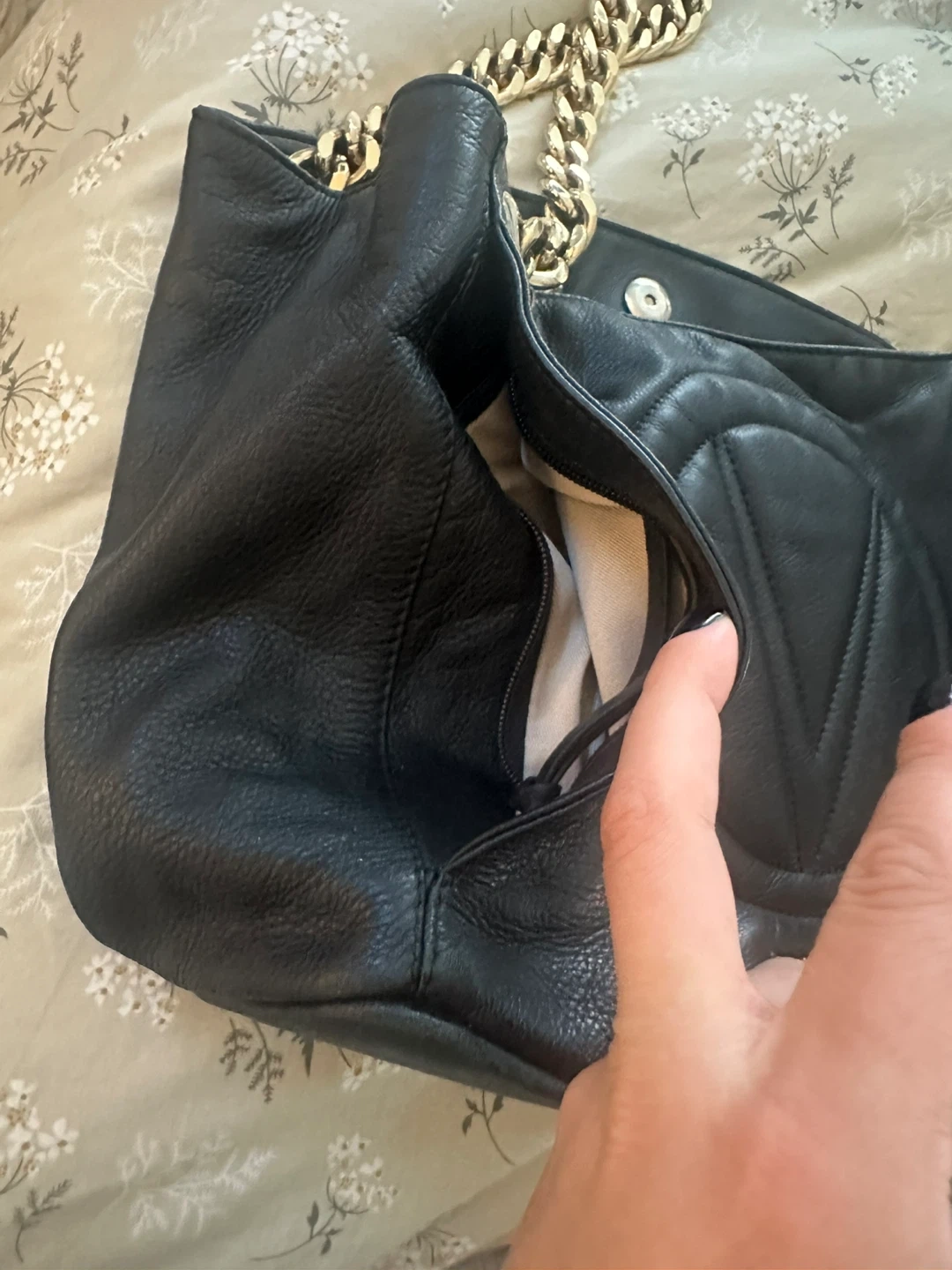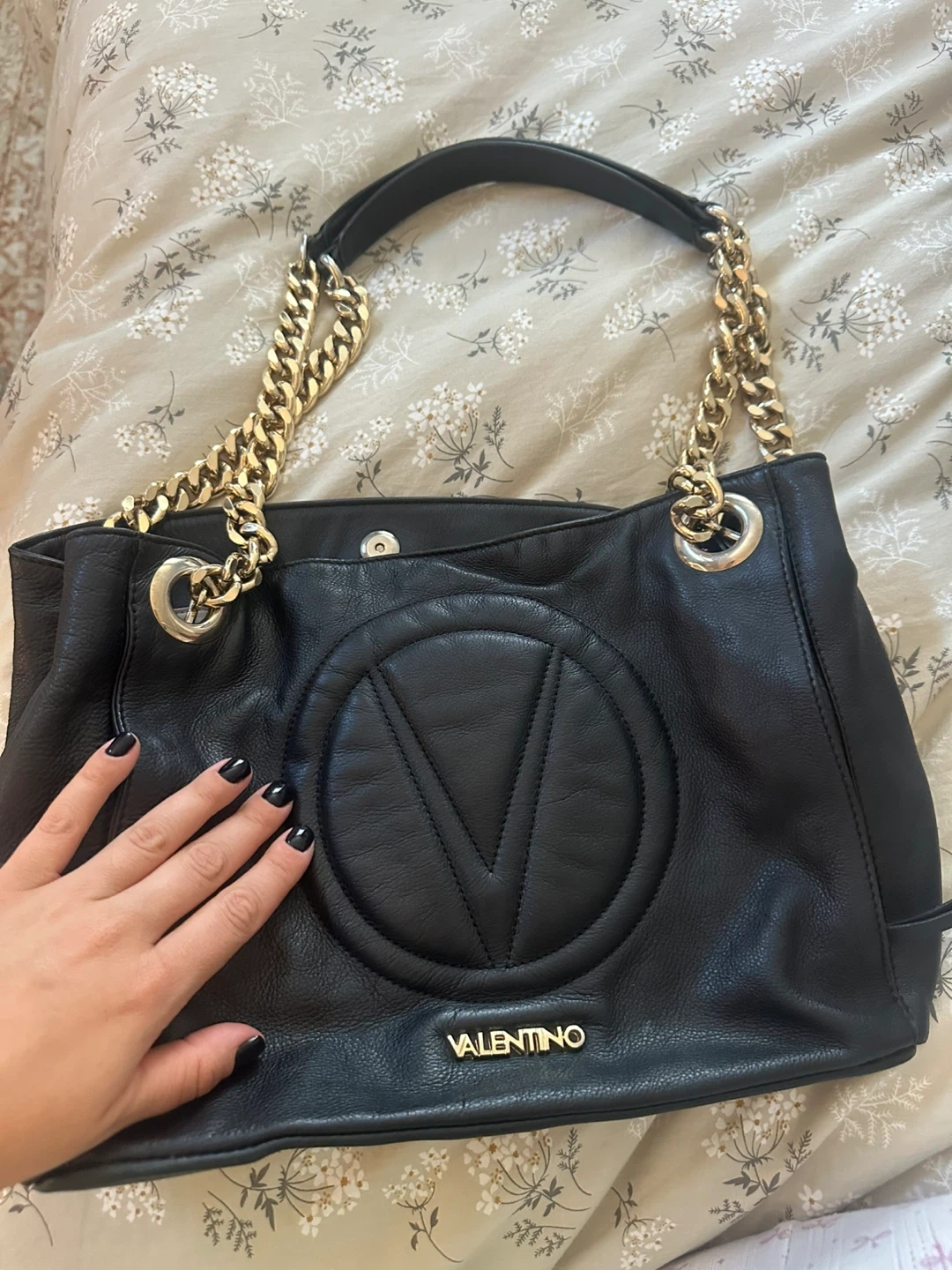 Selling a beautiful Valentino black leather shoulder bag with a gold chain strap. It features a large 'V' logo on the front and a tassel detail. Perfect for adding a touch of luxury to any outfit!