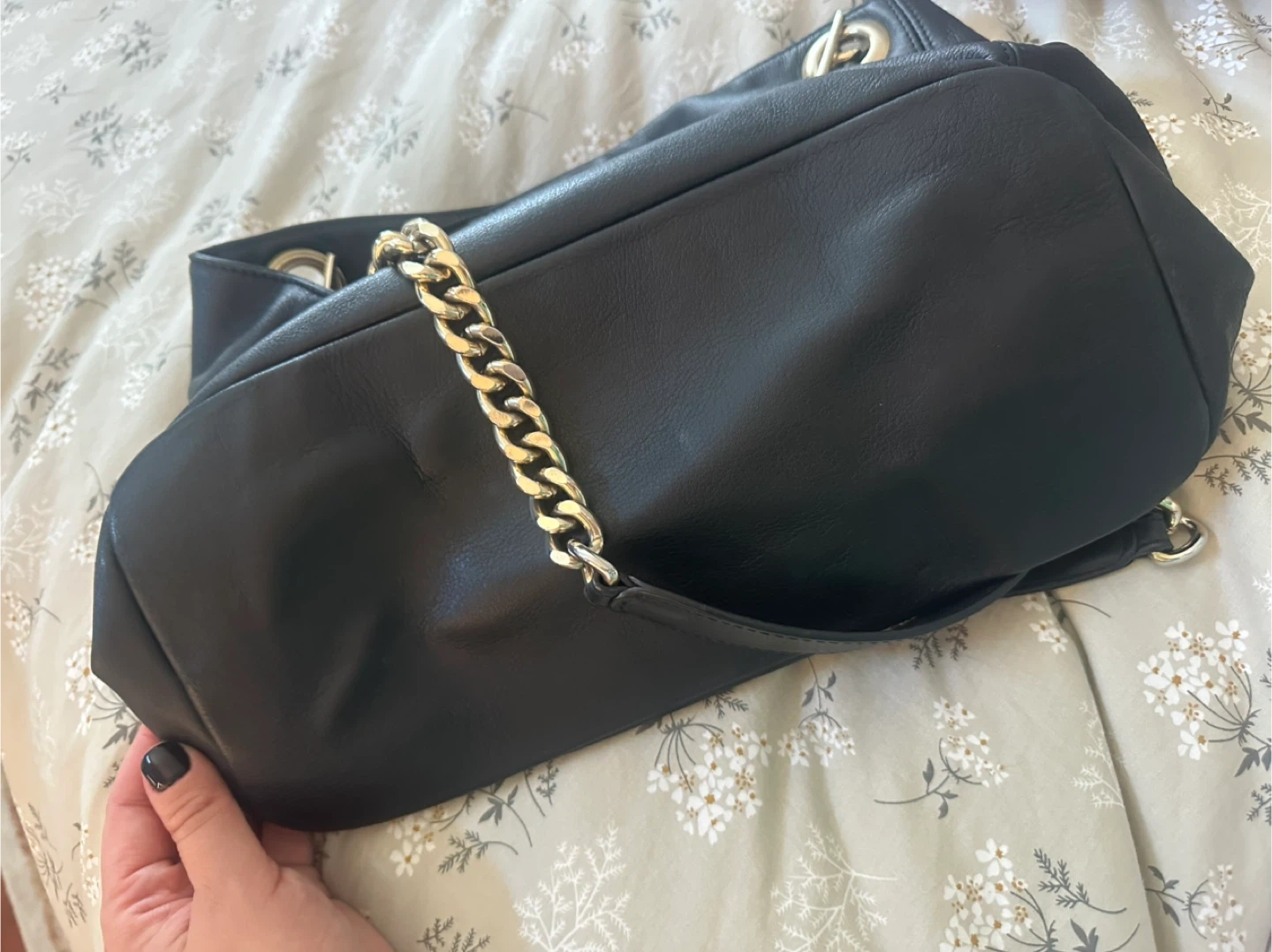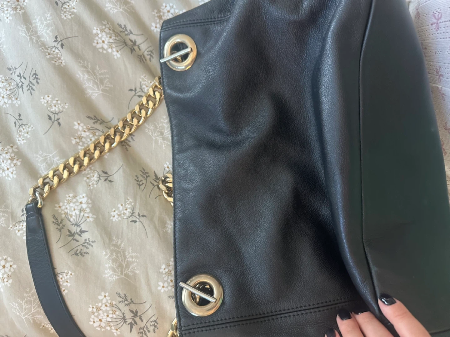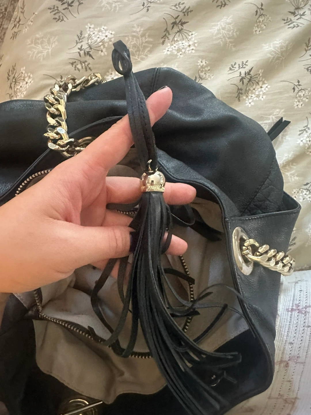 Selling a beautiful Valentino black leather shoulder bag with a gold chain strap. It features a large 'V' logo on the front and a tassel detail. Perfect for adding a touch of luxury to any outfit!