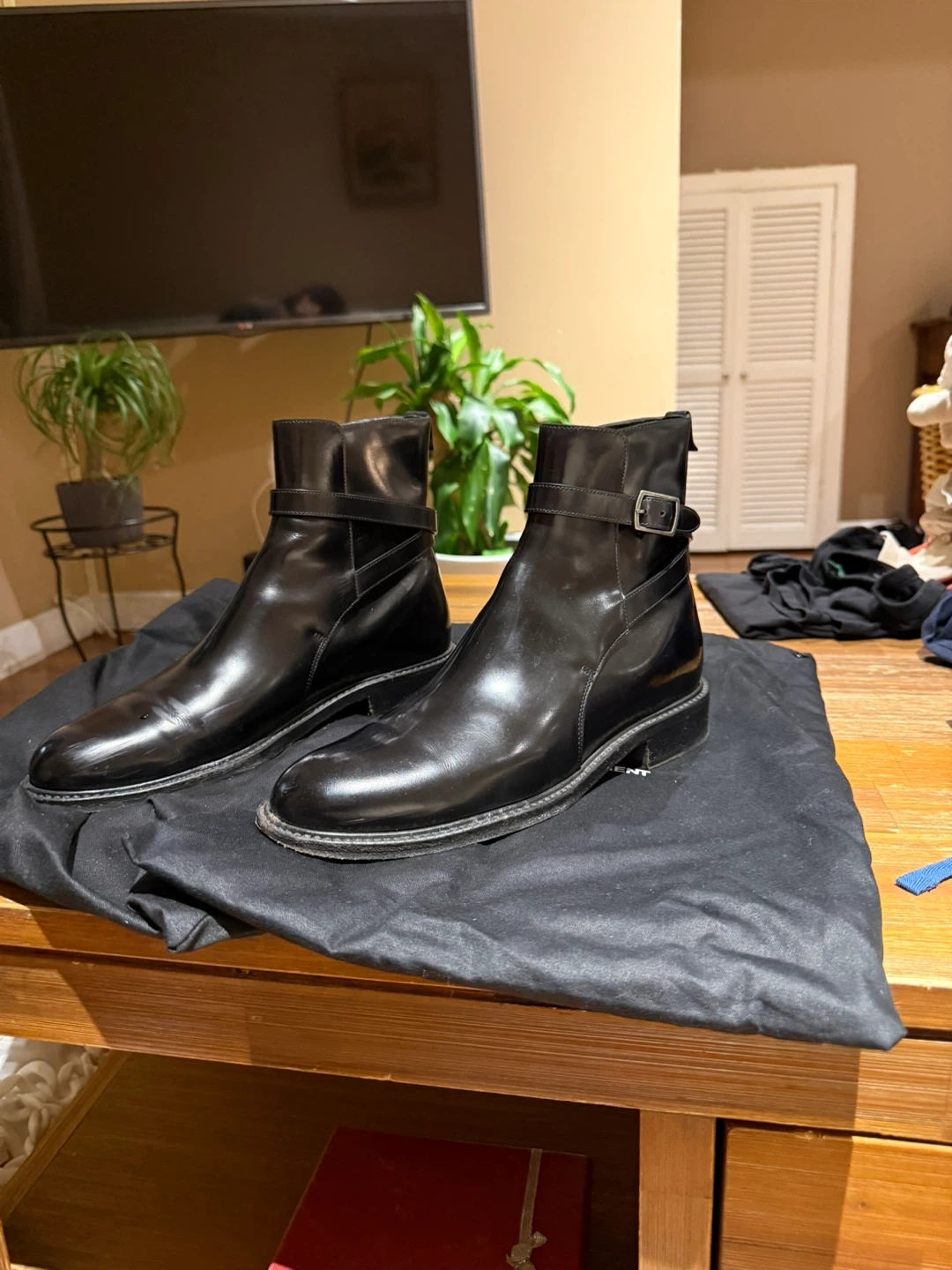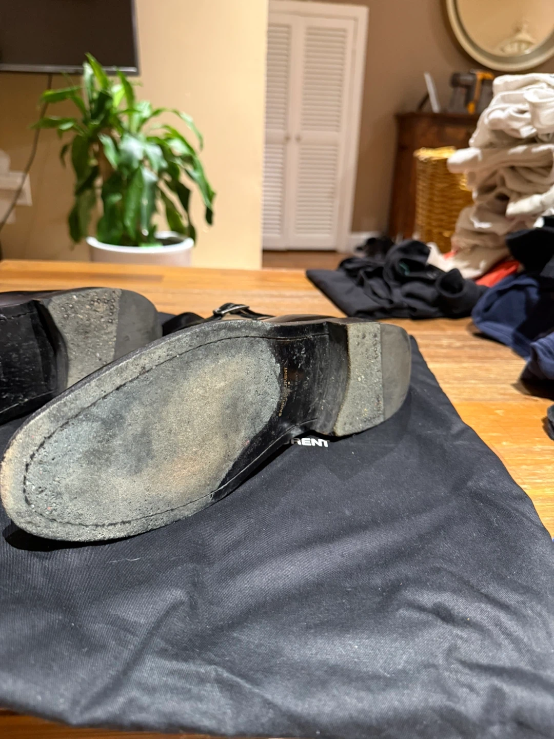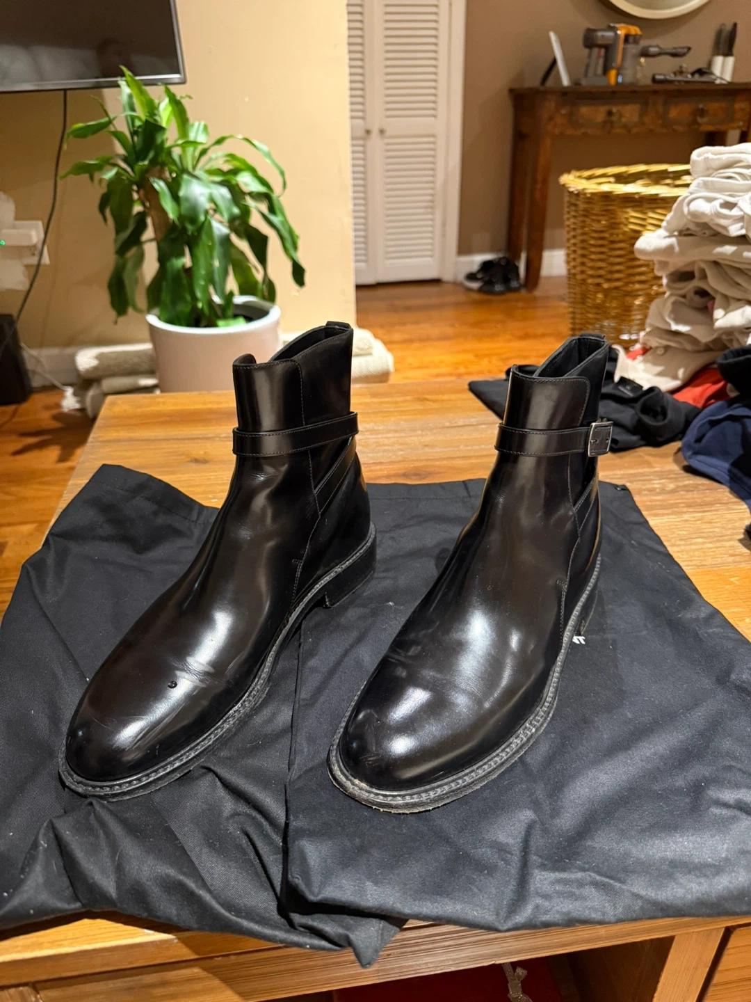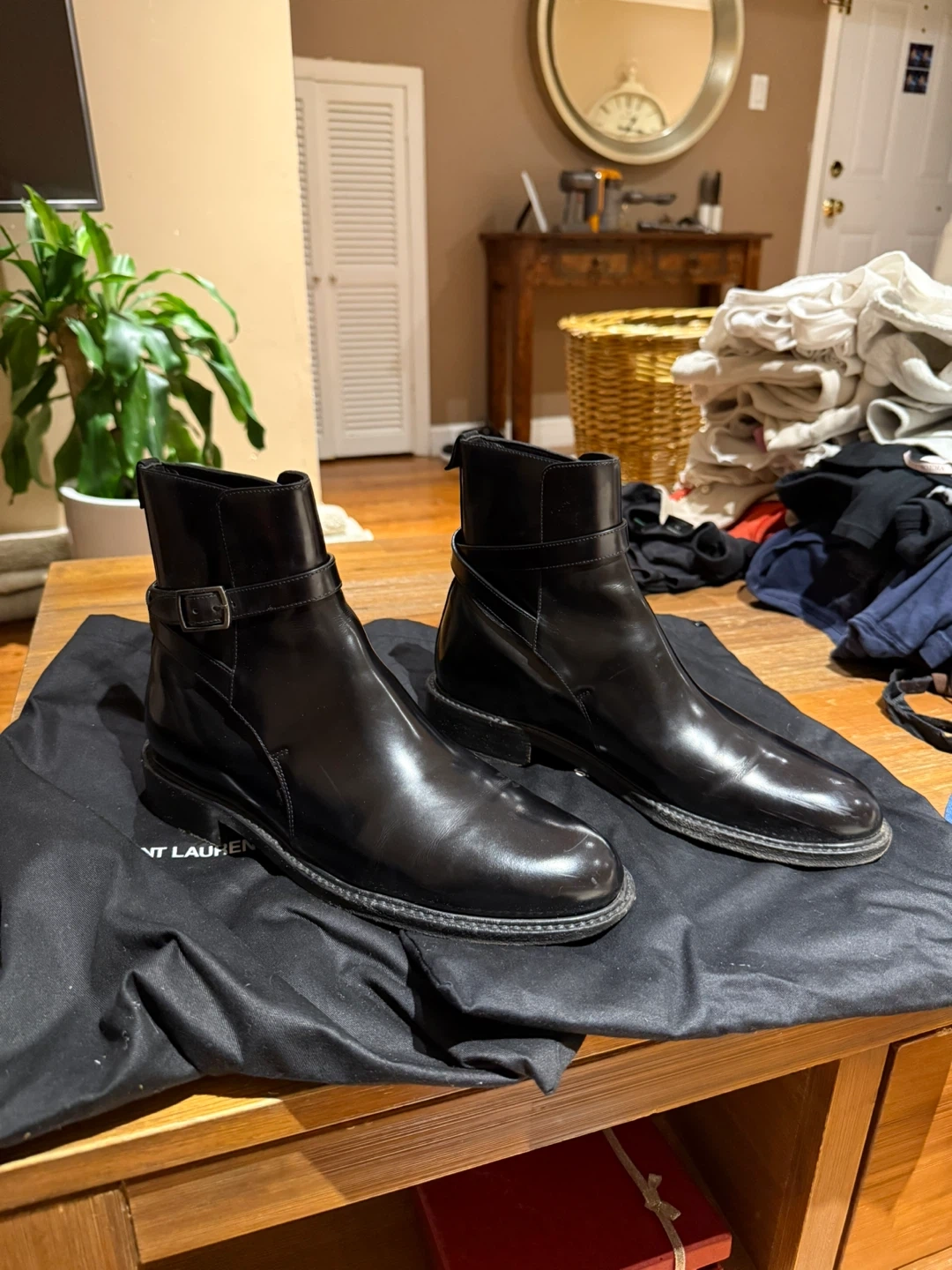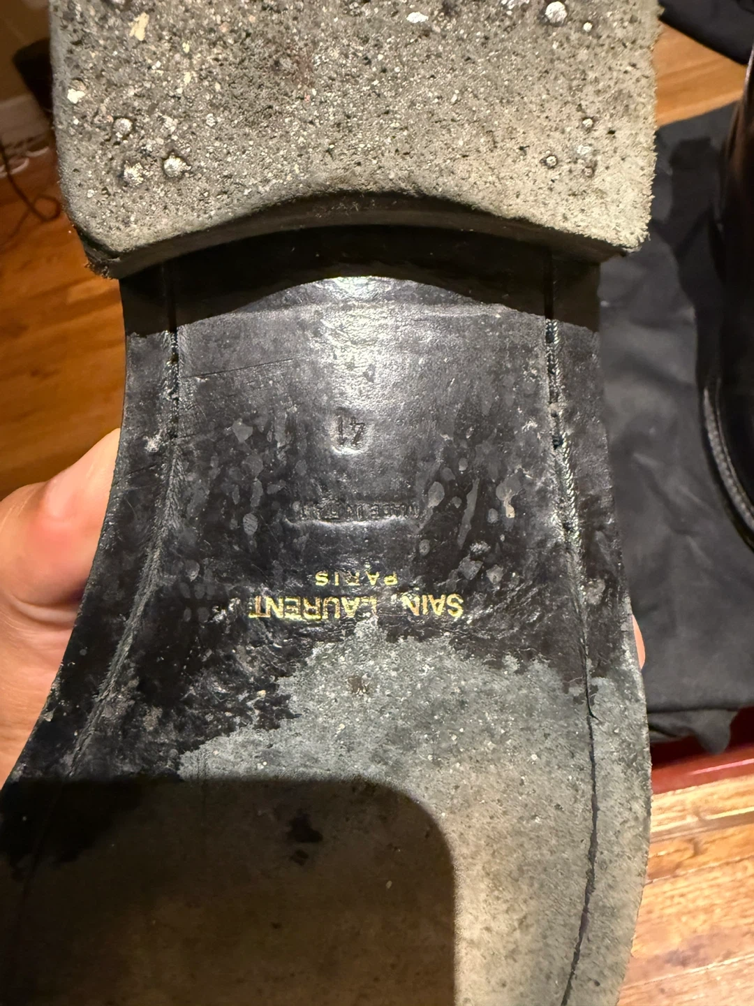 Selling a pair of Saint Laurent Paris boots in size 41. They show signs of wear on the soles, but the uppers are in good condition. Comes with the original dust bag