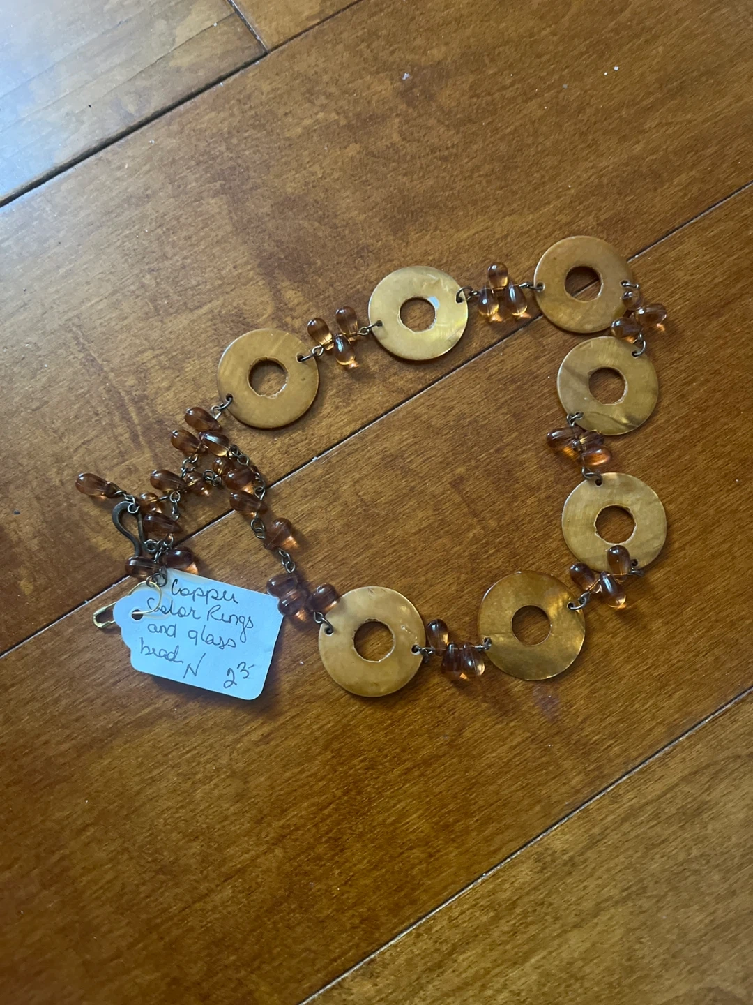 Selling a necklace featuring copper-coloured rings and glass beads. It's a unique and stylish piece to add to your collection!