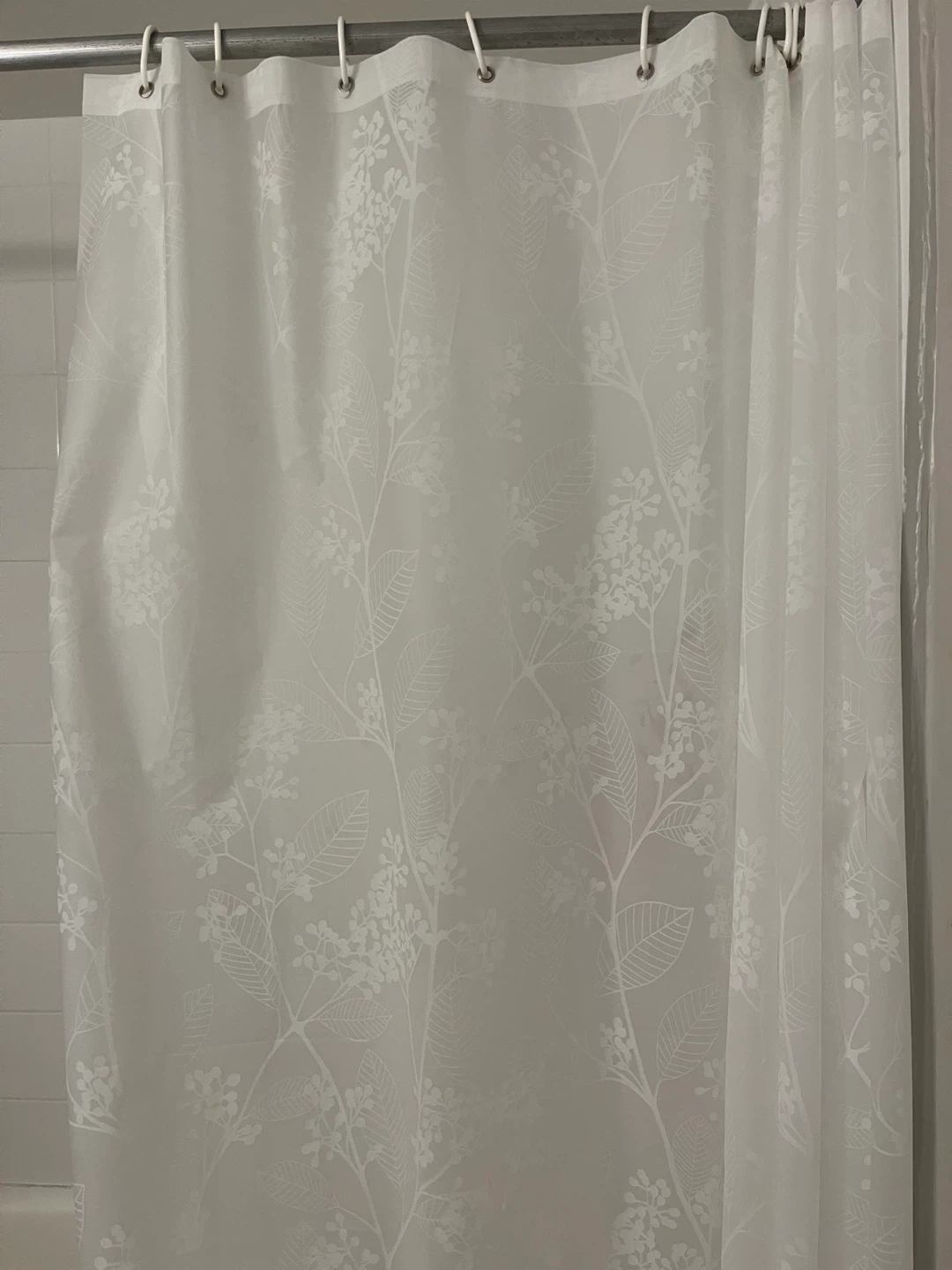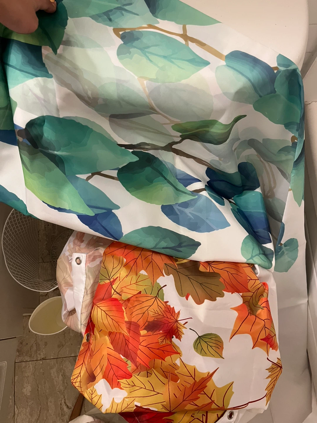 Selling three shower curtains. One with a green leaf design, another with fall leaves, and a white one with a floral pattern. Includes shower curtain rings and includes liner curtains as well. Price is for all 3