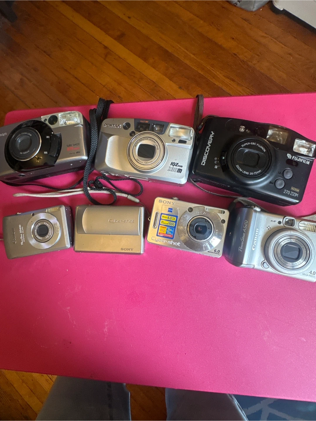 Selling a collection of vintage point and shoot cameras! Includes models from Canon (Sure Shot, PowerShot A520, SSD630), Sony (Cyber-shot), Pentax (IQZoom 130m), and Fujifilm (Discovery 270 Zoom). Great for collectors or anyone looking to experiment with film photography. Full disclosure: 3 cameras take rolls of film, doesn’t come with cords to charge. Rest of the cameras are digital and have batteries, but the batteries need to be charged.
