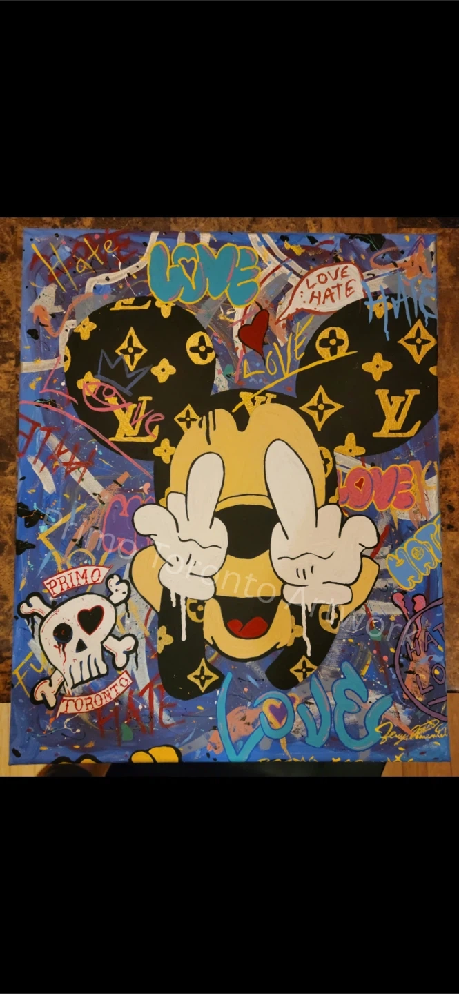 Original Mickey Mouse inspired graffiti art piece. It features a unique design with vibrant colours and a mix of street art elements. Perfect for adding a pop of urban style to any room!