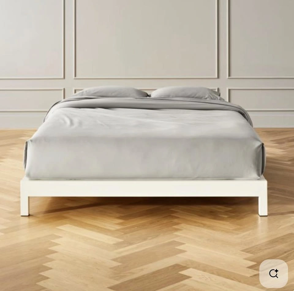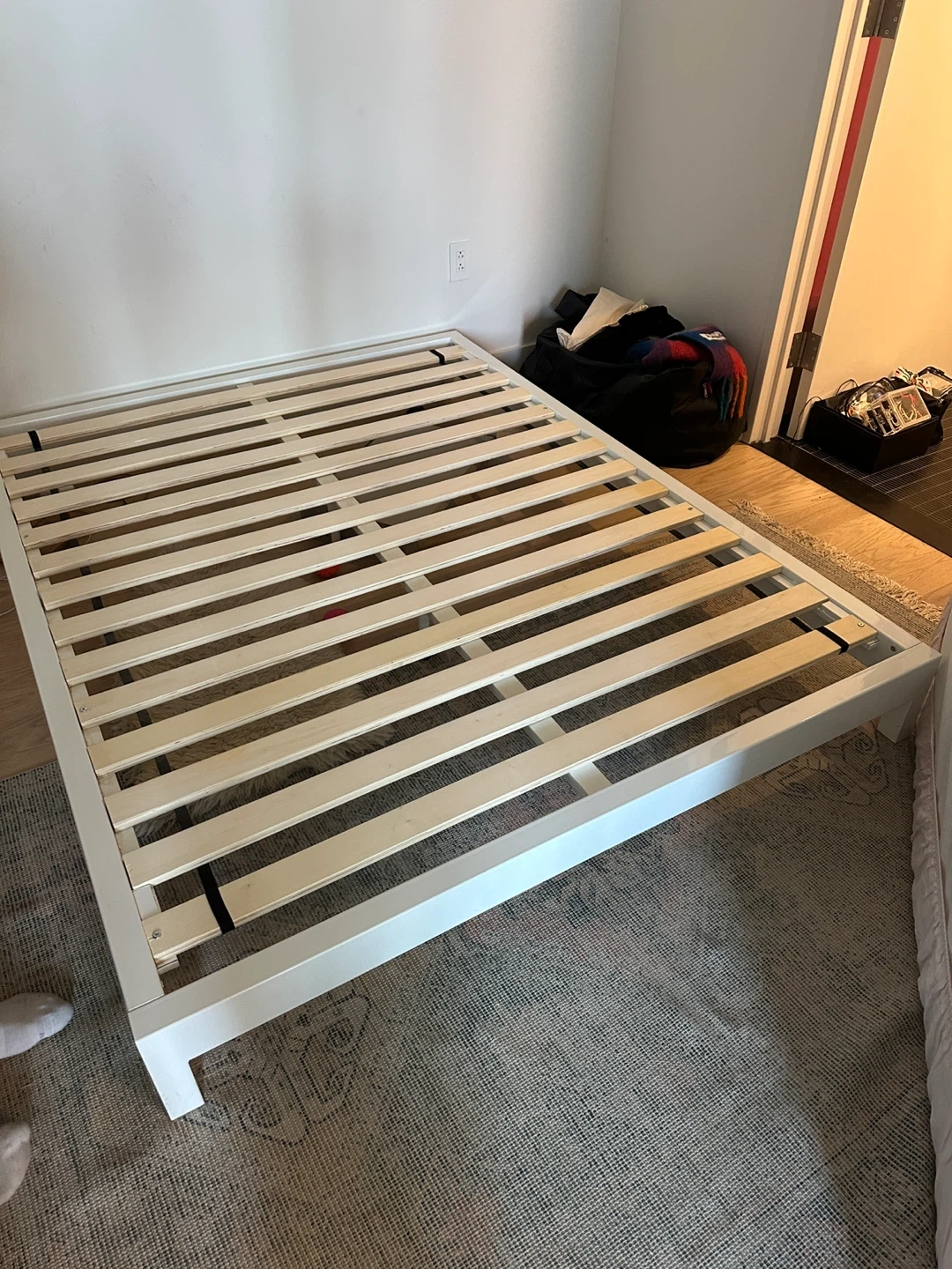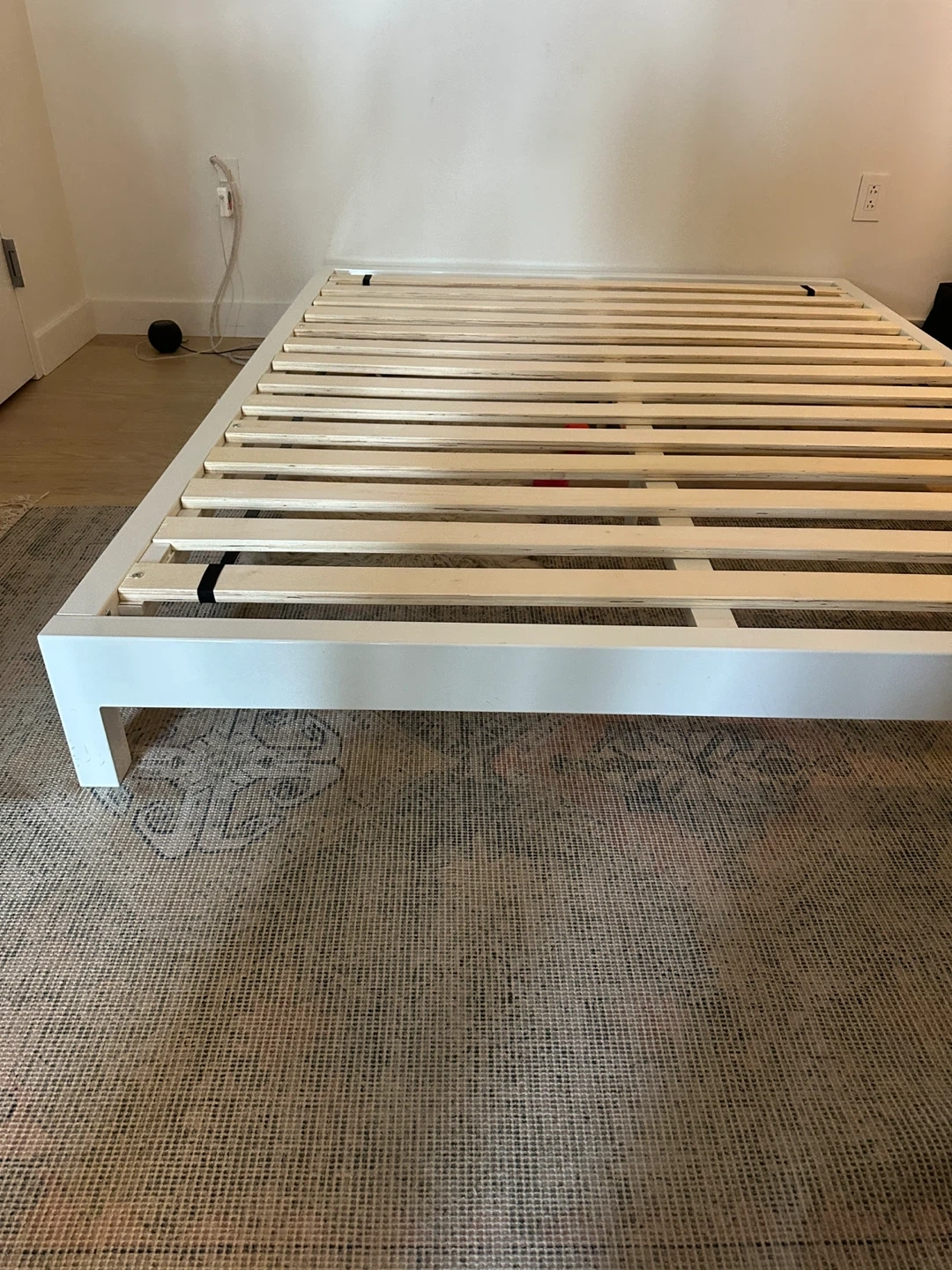 Selling my CB2 Simple White Metal Bed Base (queen size). Minimalist design with glossy white powder-coated iron and pine wood slats. Sturdy, clean-lined, and versatile — works with or without a headboard.