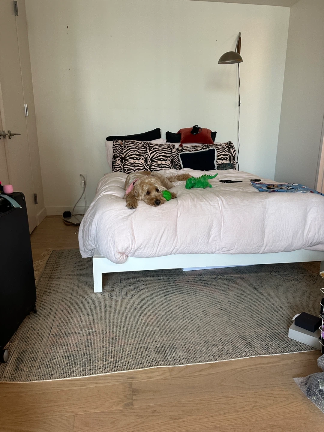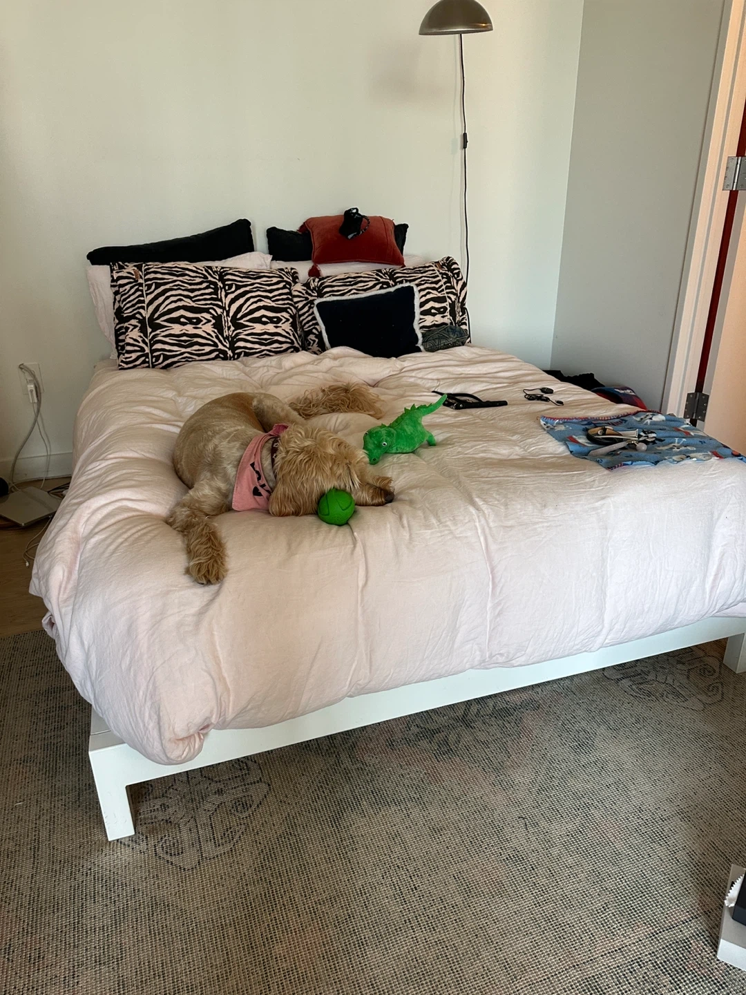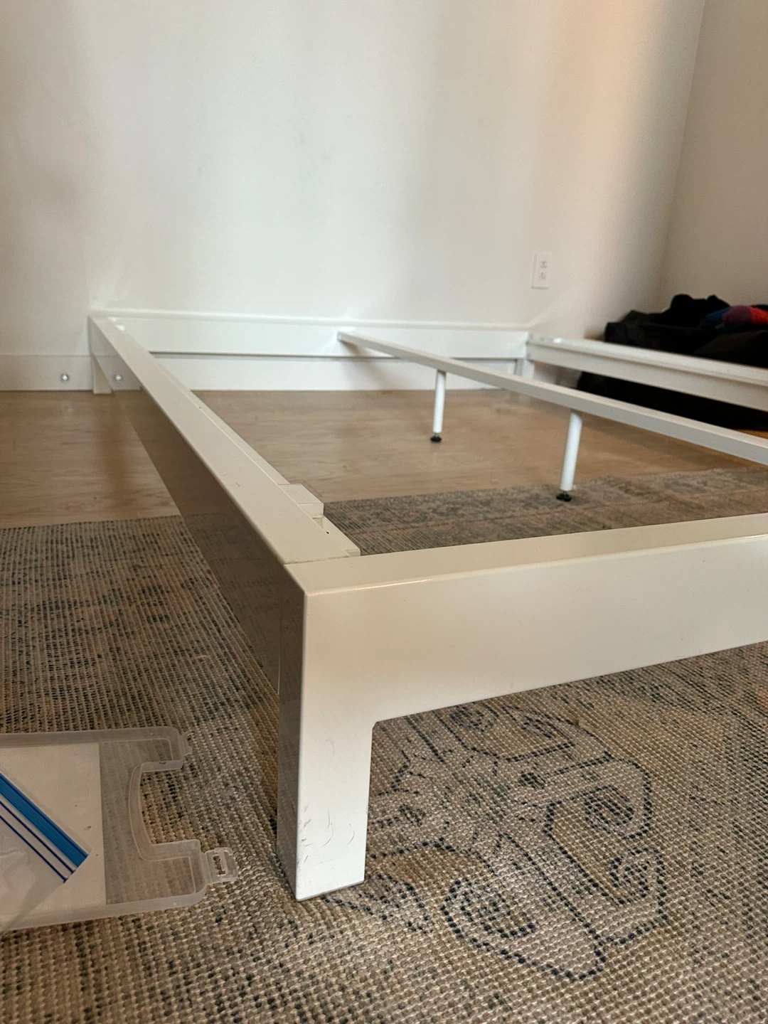 Selling my CB2 Simple White Metal Bed Base (queen size). Minimalist design with glossy white powder-coated iron and pine wood slats. Sturdy, clean-lined, and versatile — works with or without a headboard.
