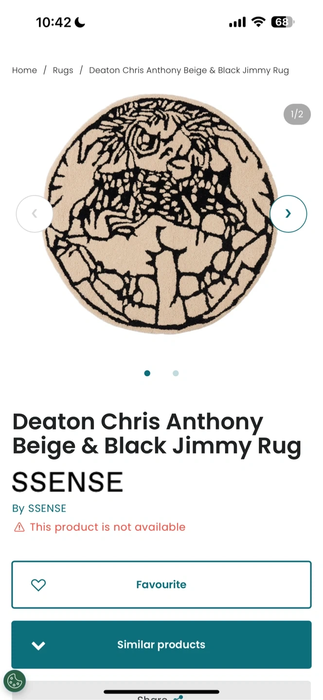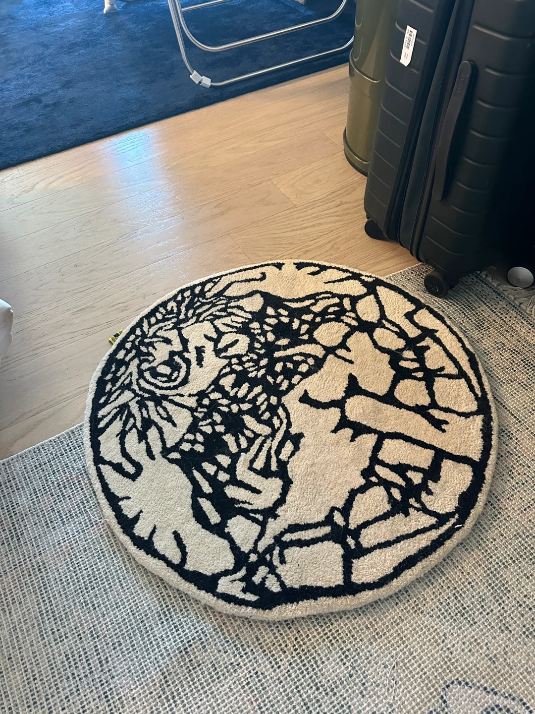 Selling a Deaton Chris Anthony Jimmy Rug from SSENSE. It's a beige and black round rug with a unique design. Perfect for adding a touch of style to any room!