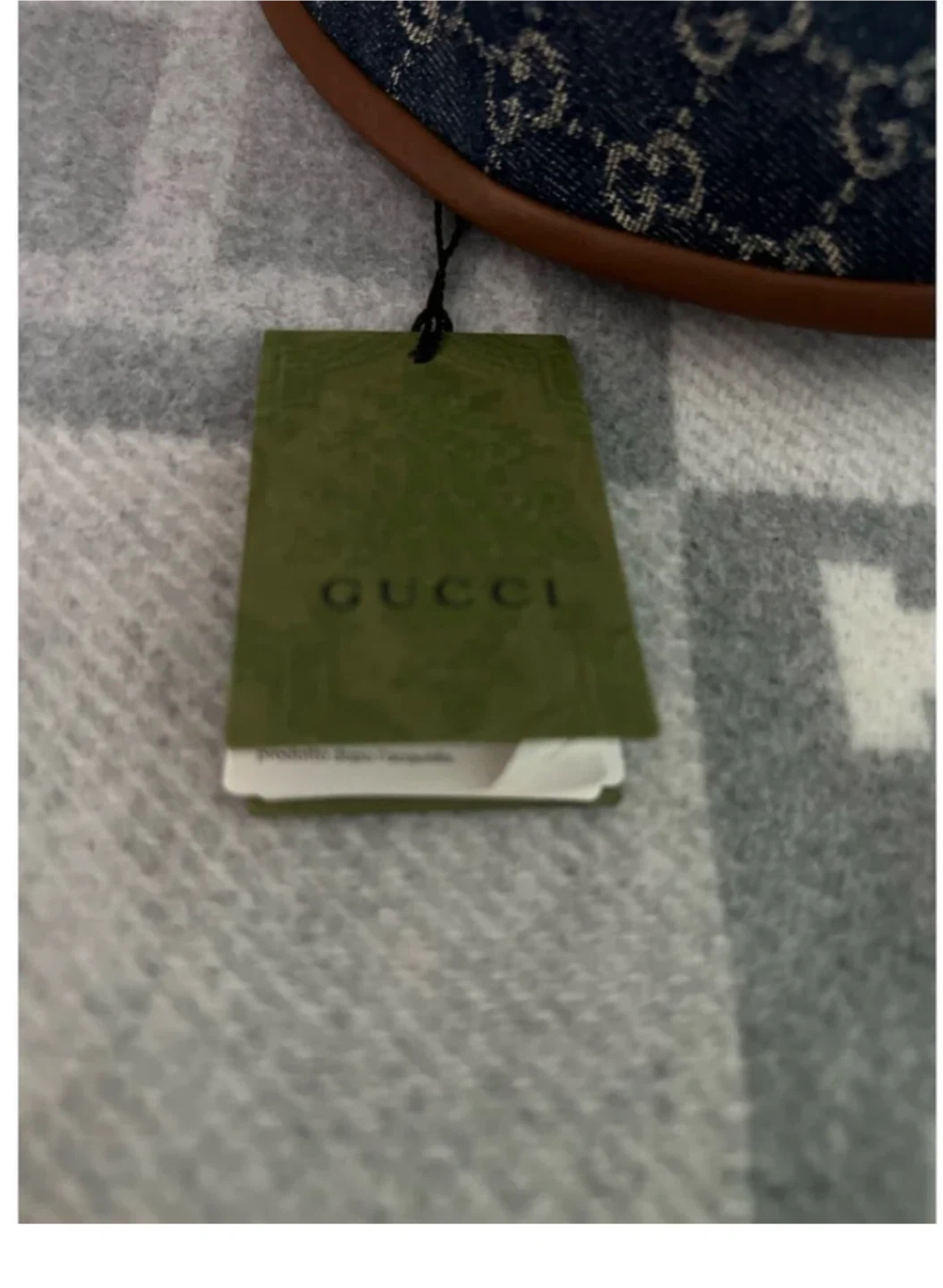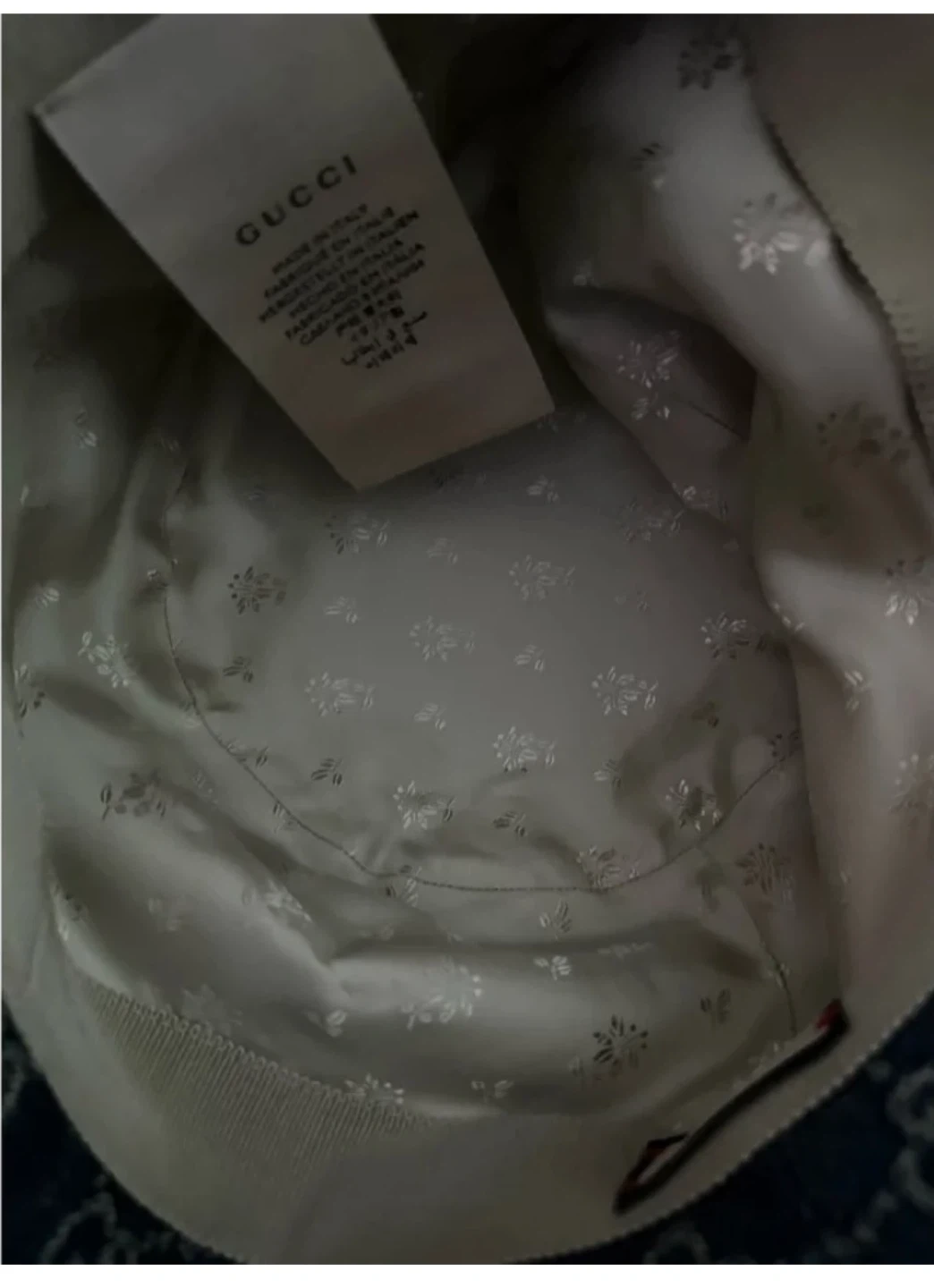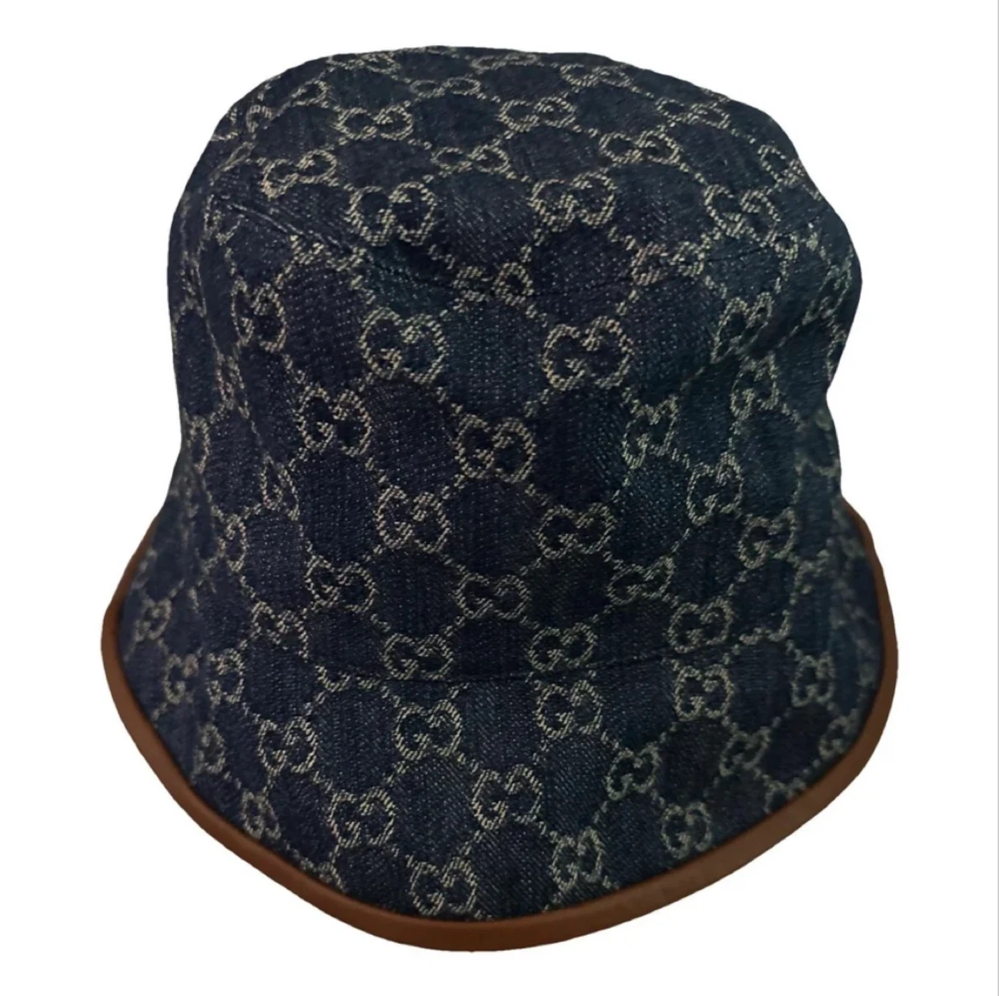 Selling a stylish Gucci denim bucket hat! It features the iconic Gucci pattern and a brown leather trim. Perfect for adding a touch of luxury to your everyday look