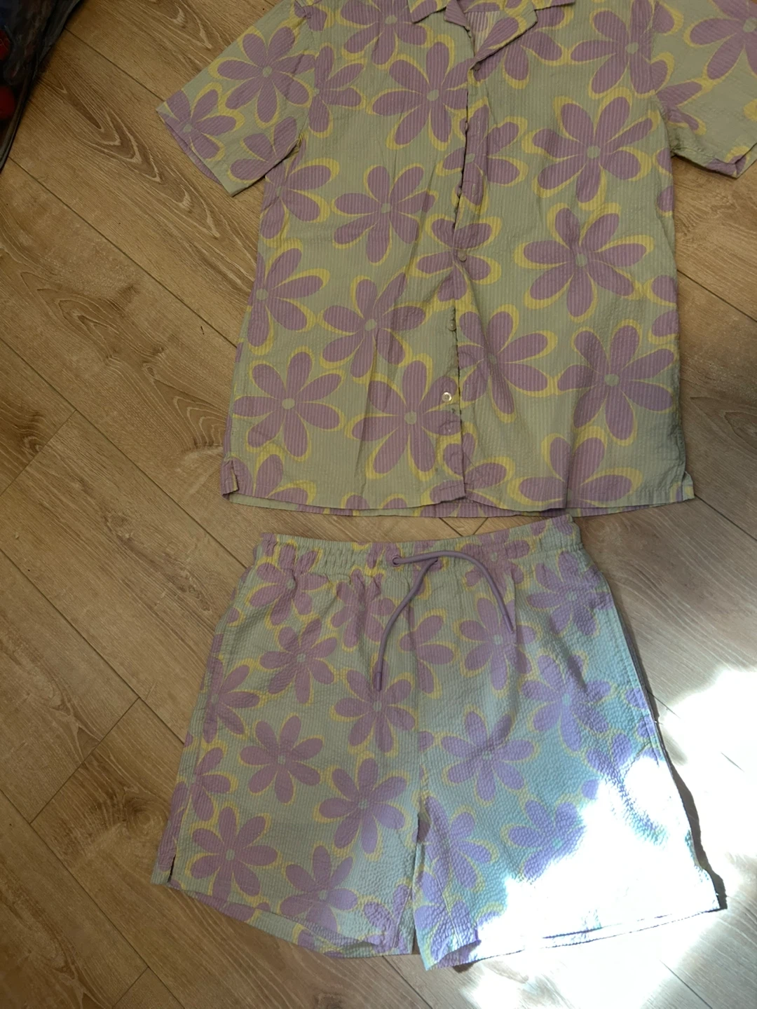 Selling a cute Primark shirt and shorts set with a fun floral pattern! The set is in great condition and perfect for summer. The material has a nice texture to it. A great addition to your wardrobe!