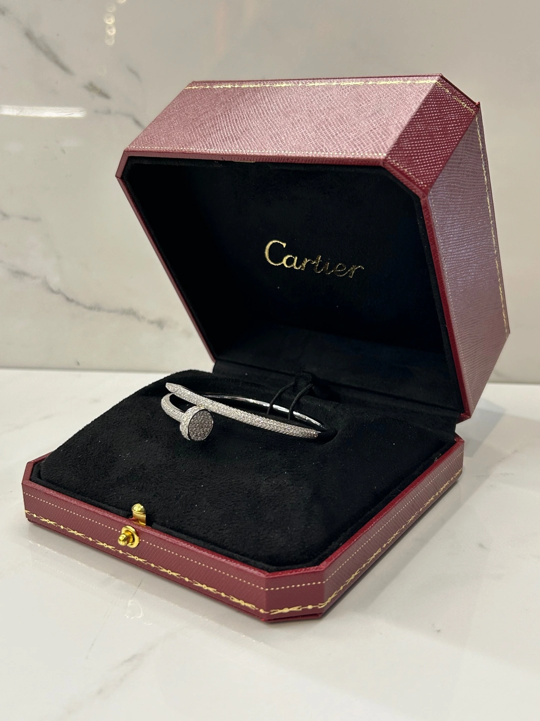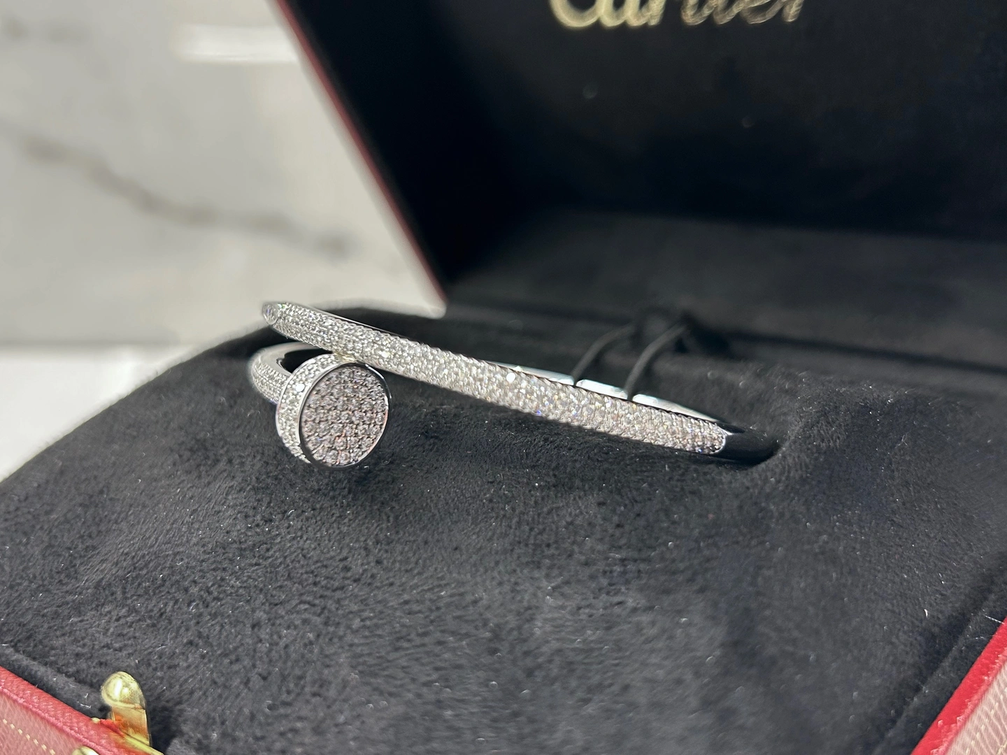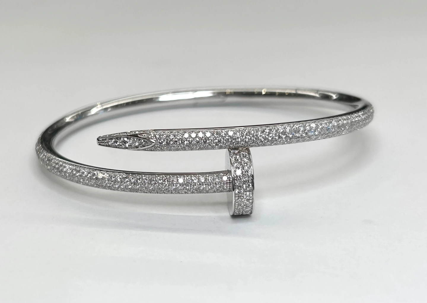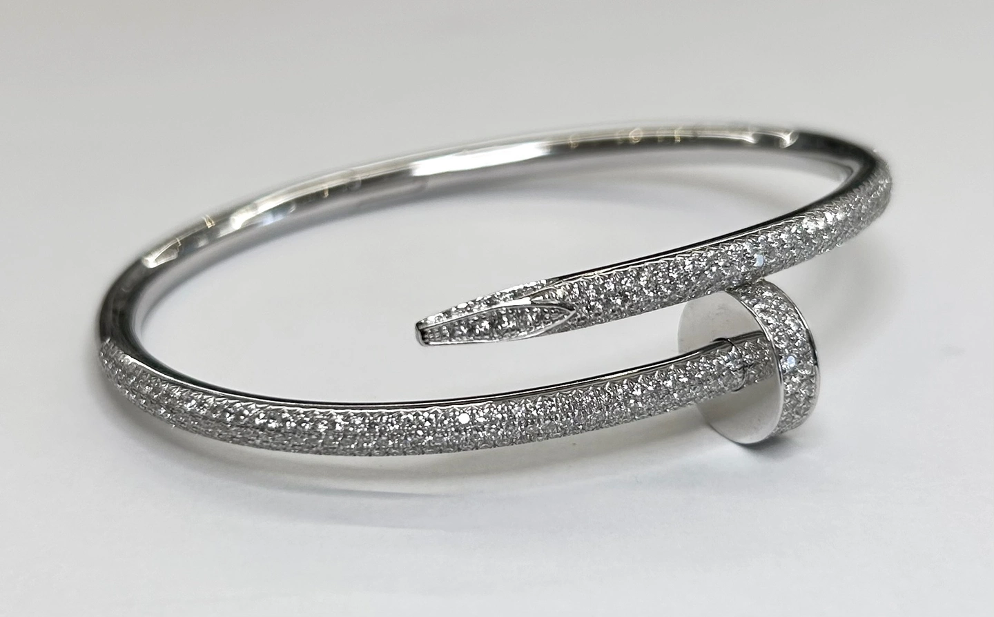 Cartier Replica / Inspired Juste Un Clou 18K White Gold Diamond Paved Bracelet - 30.5g - Please notice that item is a REPLICA of the Cartier Juste Un Clou made with 18K white gold and diamonds Comes as seen in photos $9,000 (before taxes) Available at 4 Seasons Pawn Shop & Gold Buyer Newton Location at 7155 King George Blvd, Surrey, BC, Canada Store Hours: Monday – Saturday: 9:30 AM – 6:00 PM Sunday: 10:00 AM – 6:00 PM We accept multiple forms of payment including cash, e transfer, debit, visa, Mastercard, American Express, certified bank. Layaway Plan Available! Ask us about our interest-free layaway options, perfect for budgeting your purchase. Call us at 604-592-0223 for more information, or visit us in store. Thank you for your interest we look forward to helping you find your next great deal! #101912487