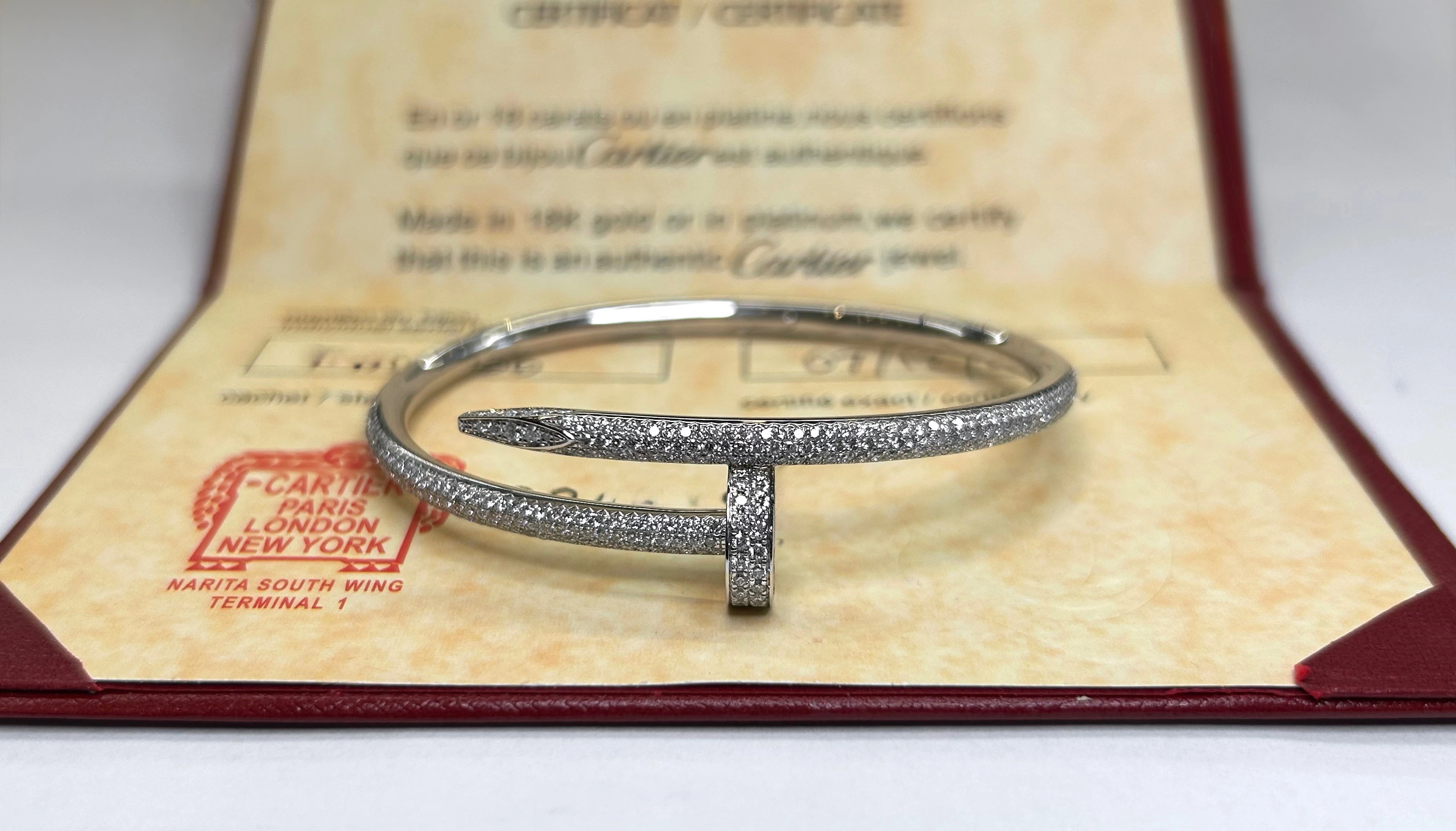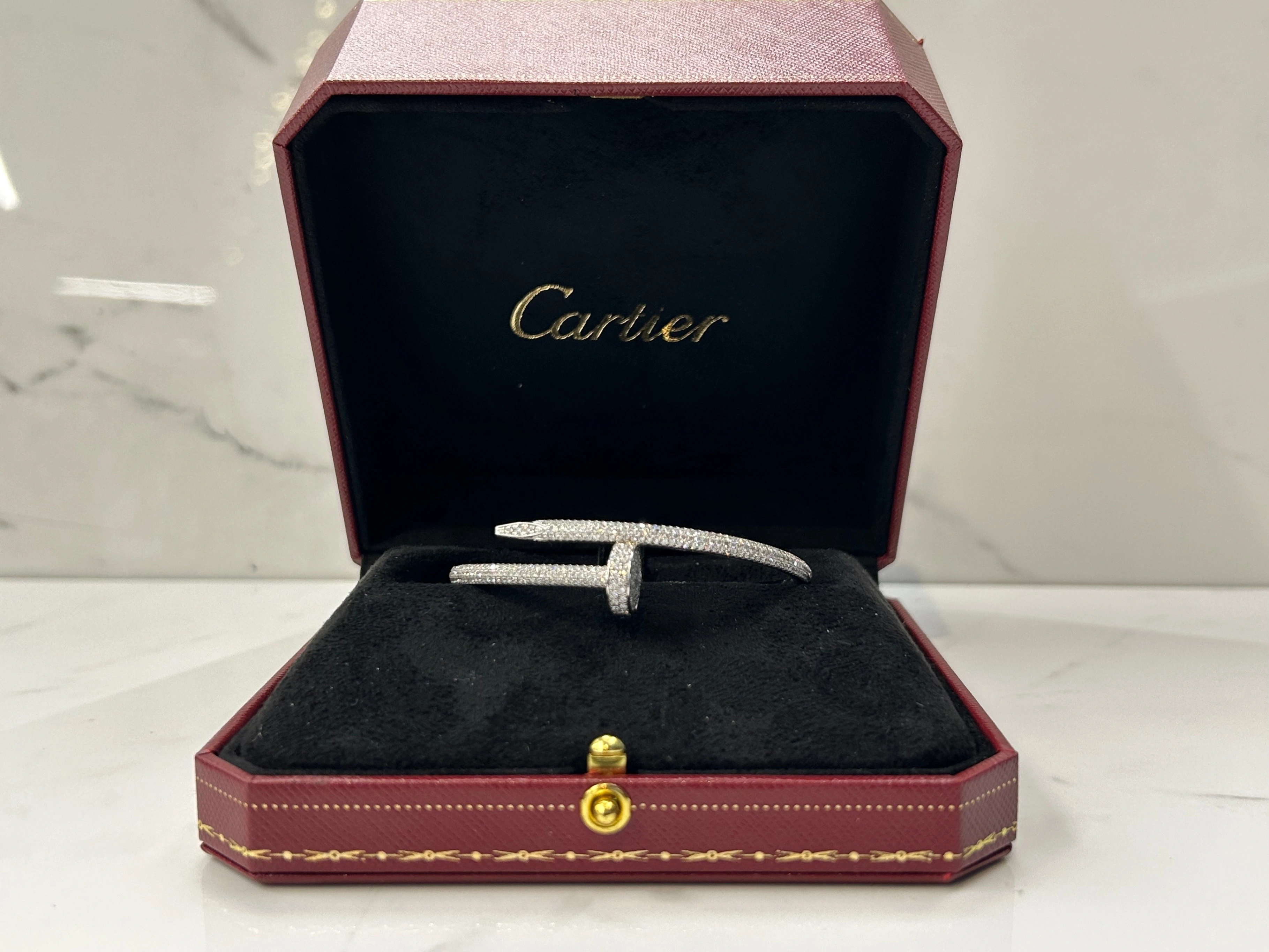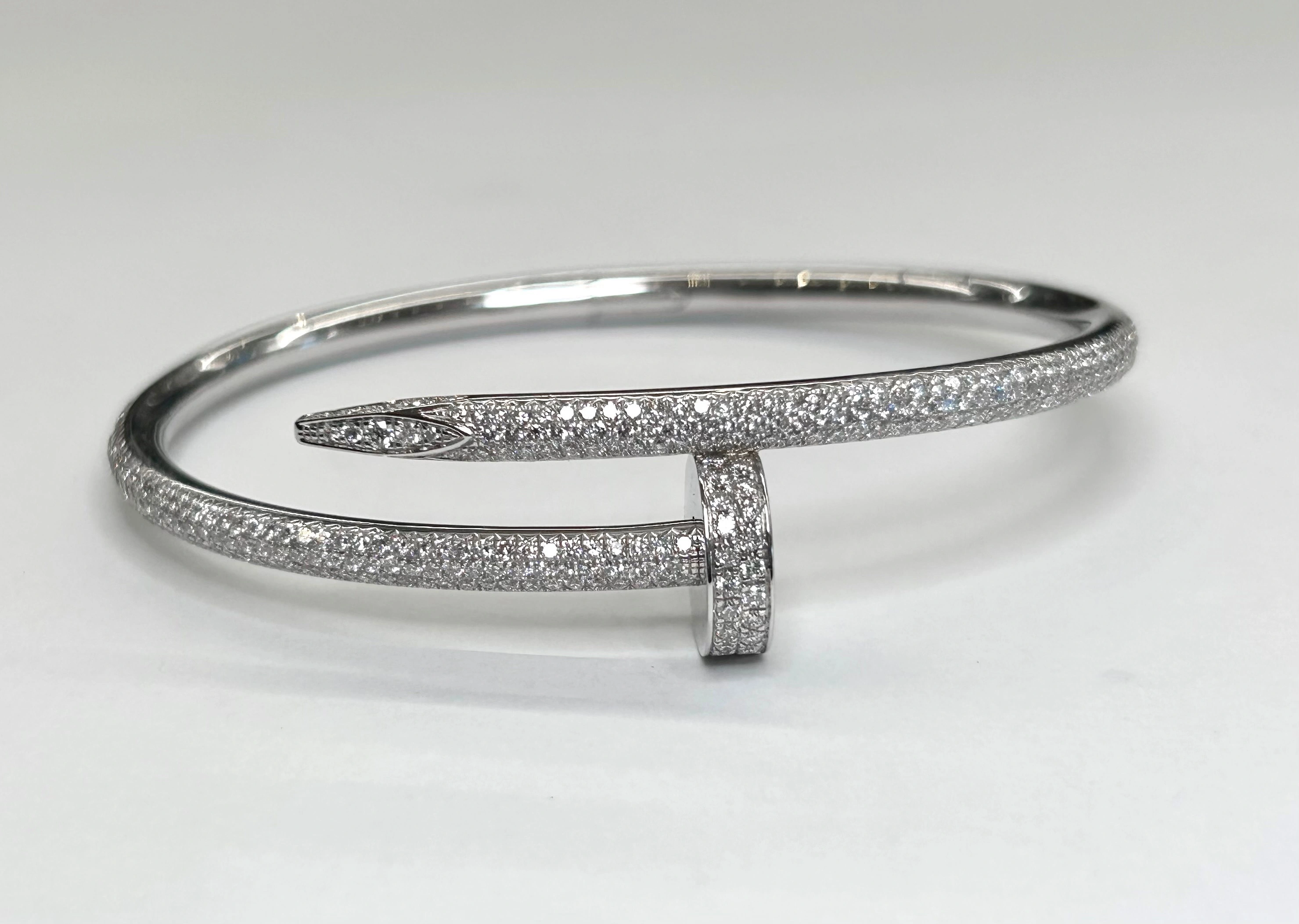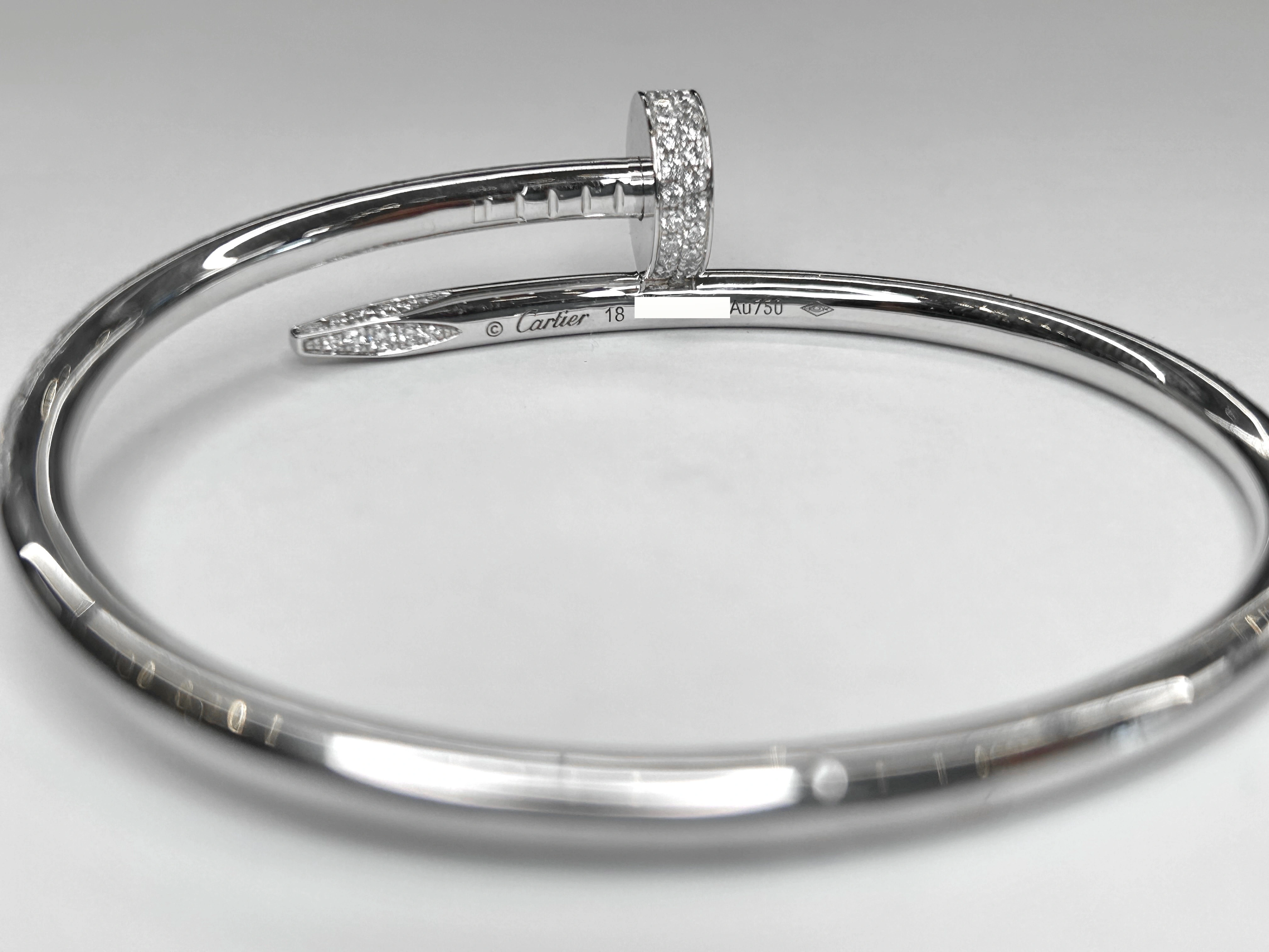 Cartier Replica / Inspired Juste Un Clou 18K White Gold Diamond Paved Bracelet - 30.5g - Please notice that item is a REPLICA of the Cartier Juste Un Clou made with 18K white gold and diamonds Comes as seen in photos $9,000 (before taxes) Available at 4 Seasons Pawn Shop & Gold Buyer Newton Location at 7155 King George Blvd, Surrey, BC, Canada Store Hours: Monday – Saturday: 9:30 AM – 6:00 PM Sunday: 10:00 AM – 6:00 PM We accept multiple forms of payment including cash, e transfer, debit, visa, Mastercard, American Express, certified bank. Layaway Plan Available! Ask us about our interest-free layaway options, perfect for budgeting your purchase. Call us at 604-592-0223 for more information, or visit us in store. Thank you for your interest we look forward to helping you find your next great deal! #101912487