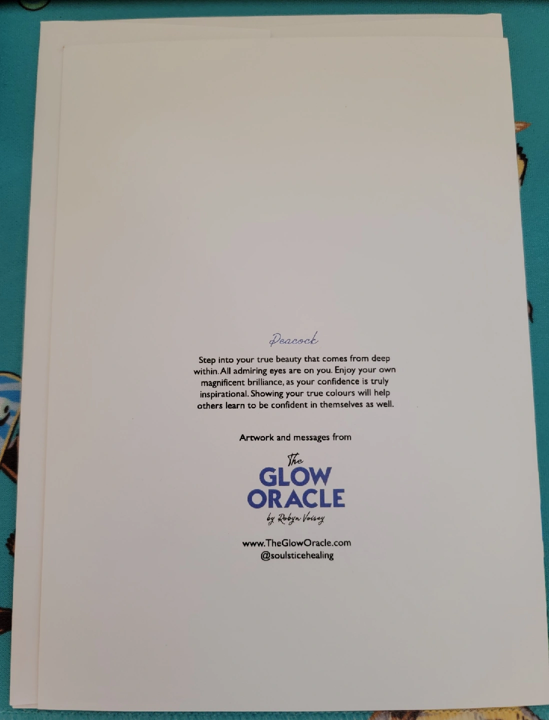 A beautiful Peacock card from The Glow Oracle by Robyn Veasey. The artwork and messages from The Glow Oracle encourage you to step into your true beauty that comes from deep within. All admiring eyes are on you. Enjoy your own magnificent brilliance; your confidence is truly inspirational. Showing your true colours will help others learn to be confident in themselves as well.