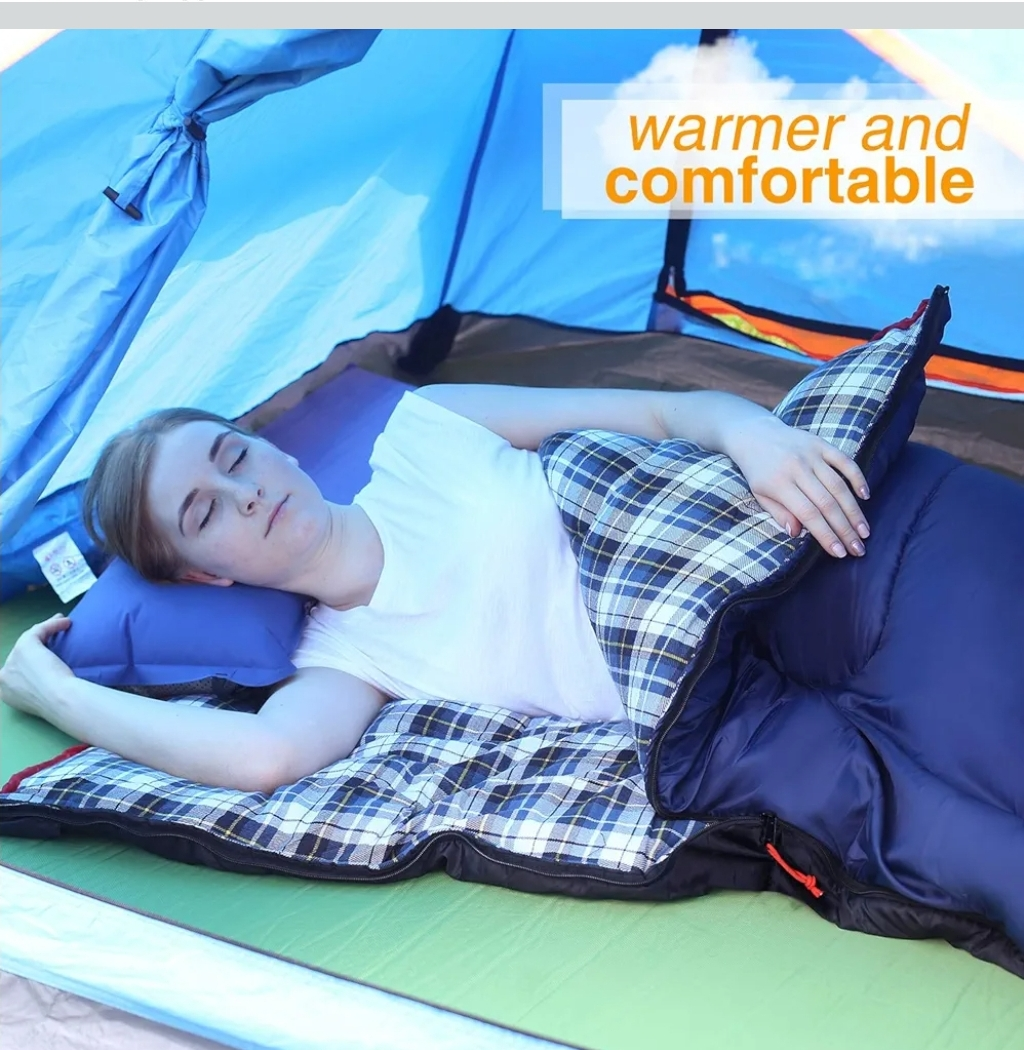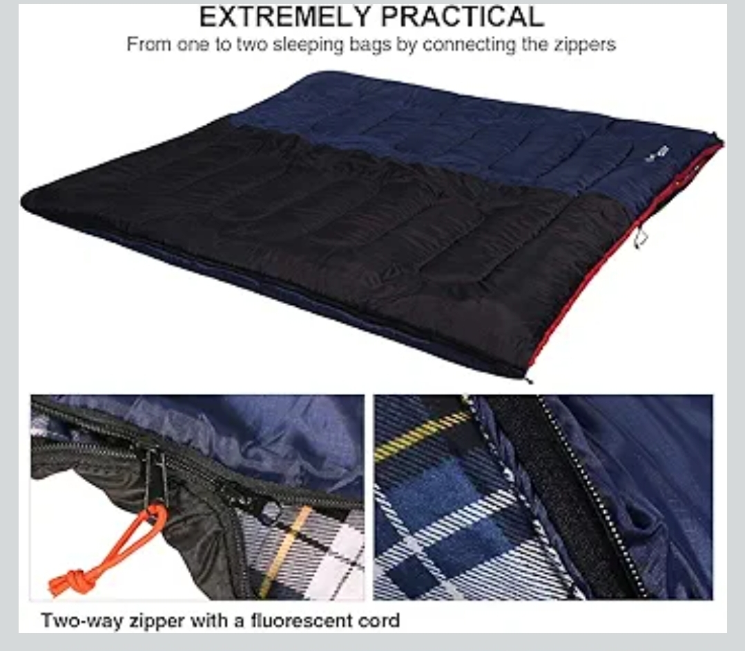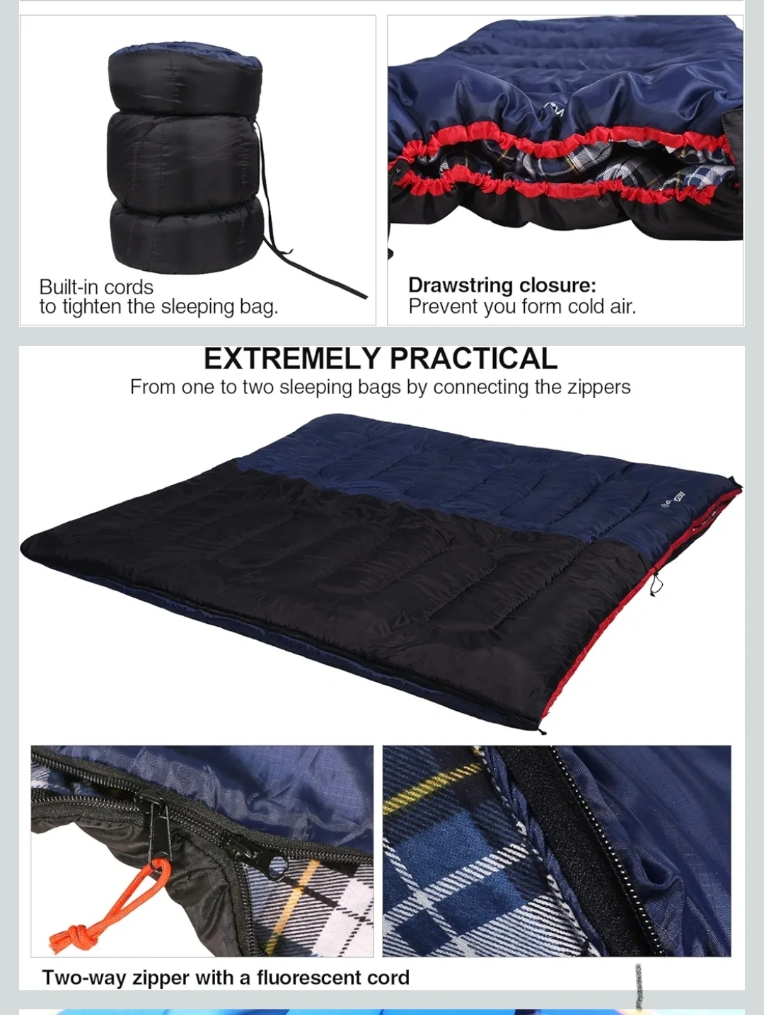 This sleeping bag features built-in cords to tighten it, and a drawstring closure to prevent cold air from getting in. It also has a two-way zipper with a fluorescent cord for easy use