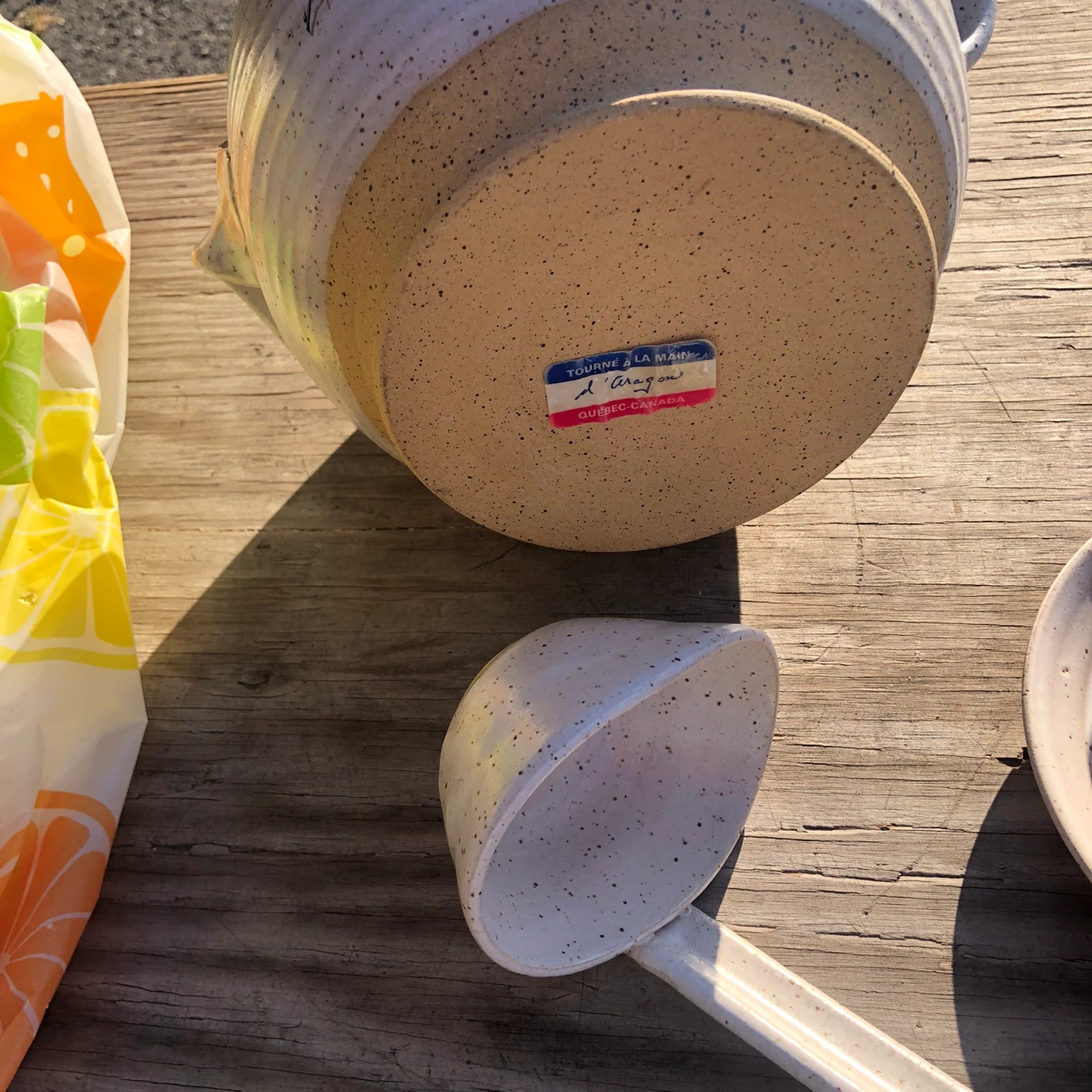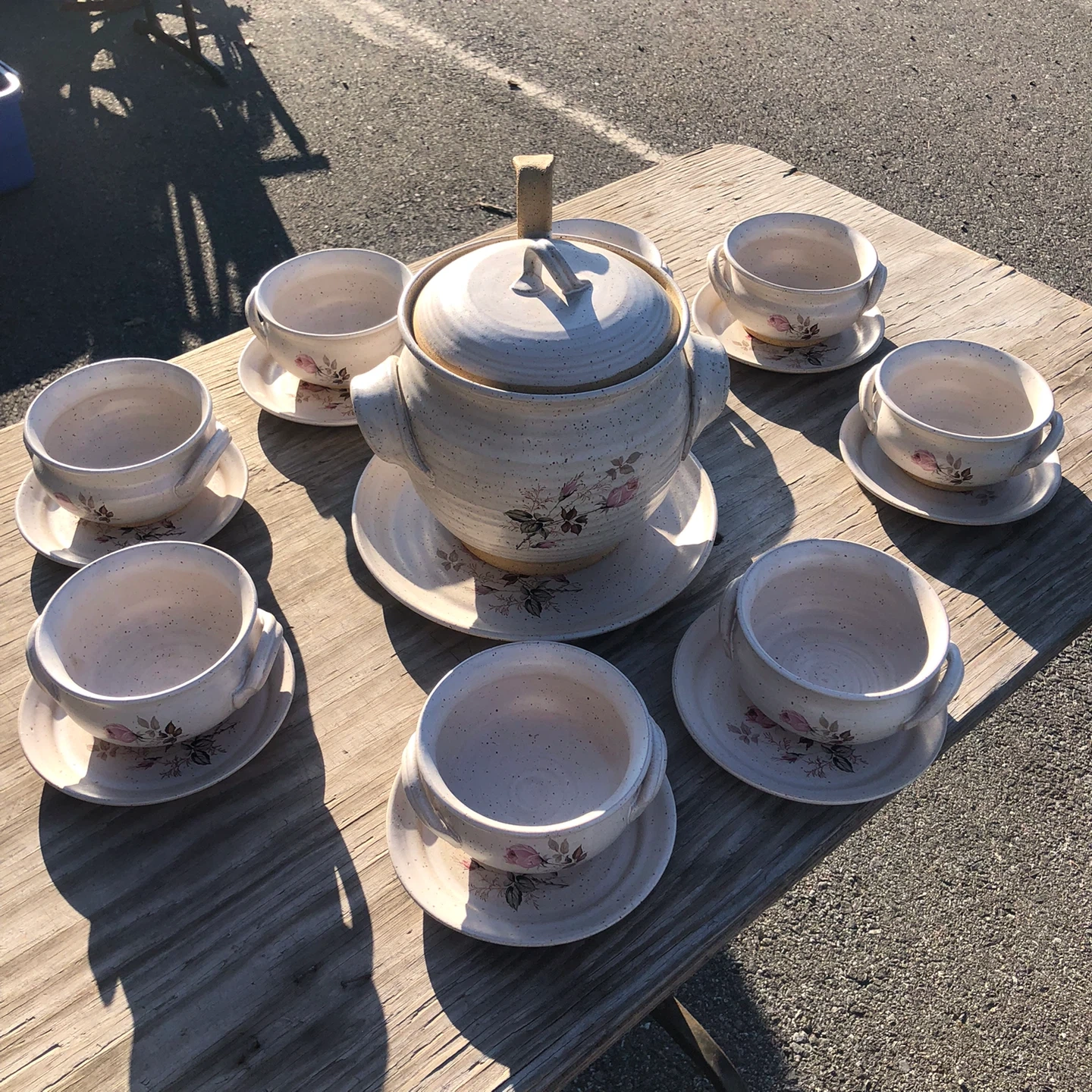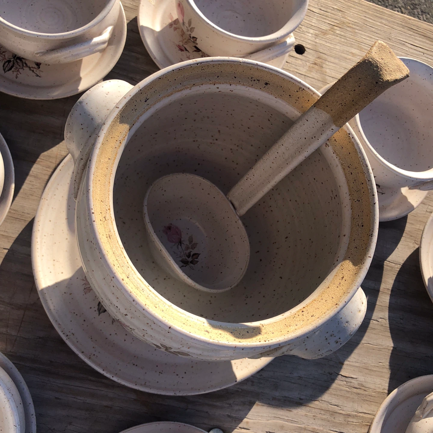 Set for 8 people. Selling a lovely hand-turned 20 piece ceramic soup tureen set by renowned Quebec pottery artist Pierre d’Aragon. It comes with a large tureen with big matching serving or under-plate, ladle, lid, as well as 8 matching bowls with saucers/plates. This really big set has a speckled finish and a delicate floral design. Perfect for cozy dinners and family celebrations!