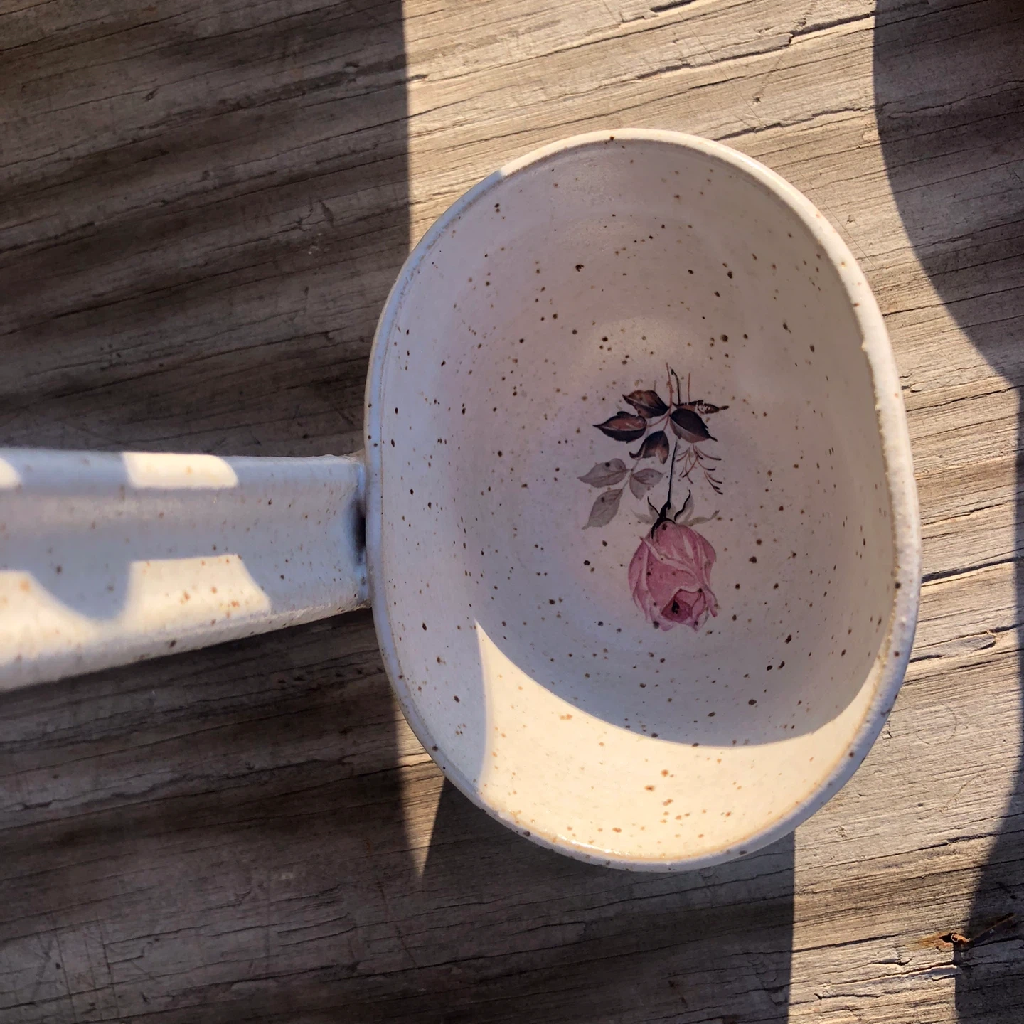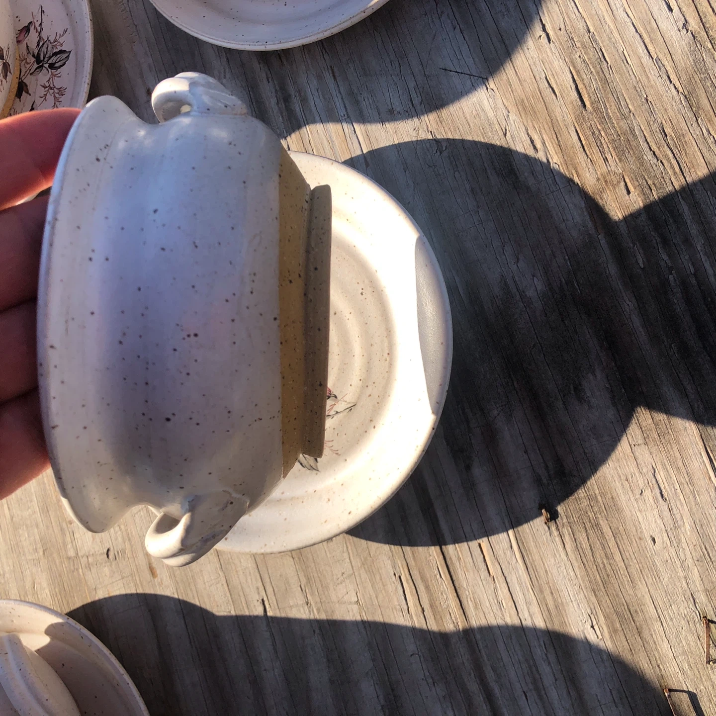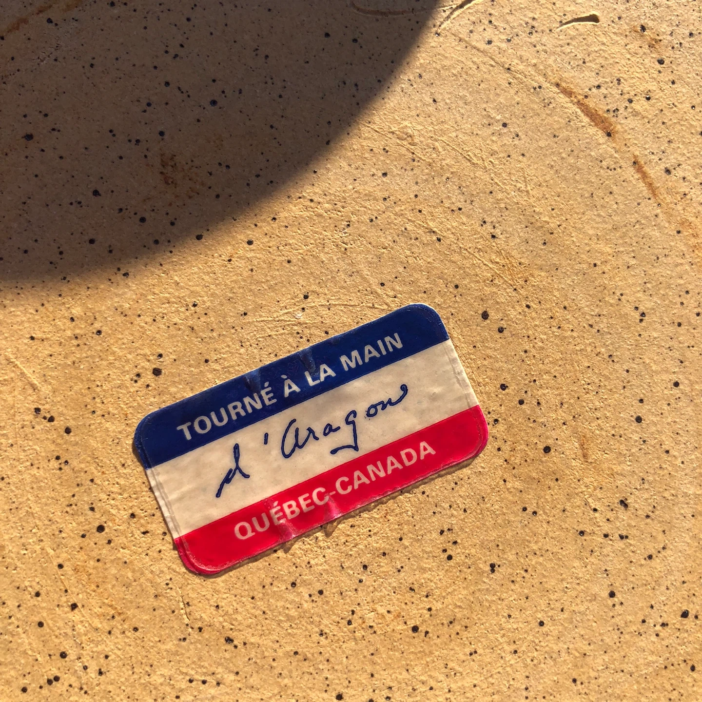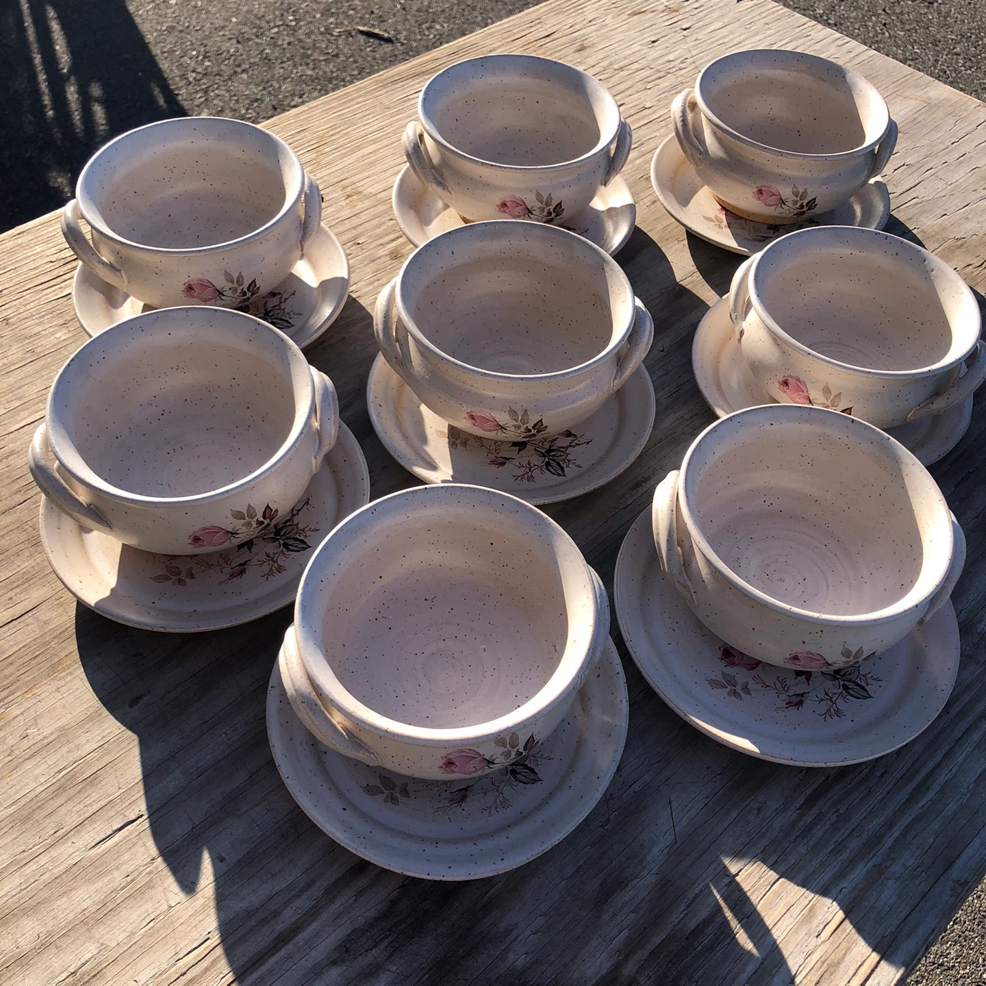 Set for 8 people. Selling a lovely hand-turned 20 piece ceramic soup tureen set by renowned Quebec pottery artist Pierre d’Aragon. It comes with a large tureen with big matching serving or under-plate, ladle, lid, as well as 8 matching bowls with saucers/plates. This really big set has a speckled finish and a delicate floral design. Perfect for cozy dinners and family celebrations!
