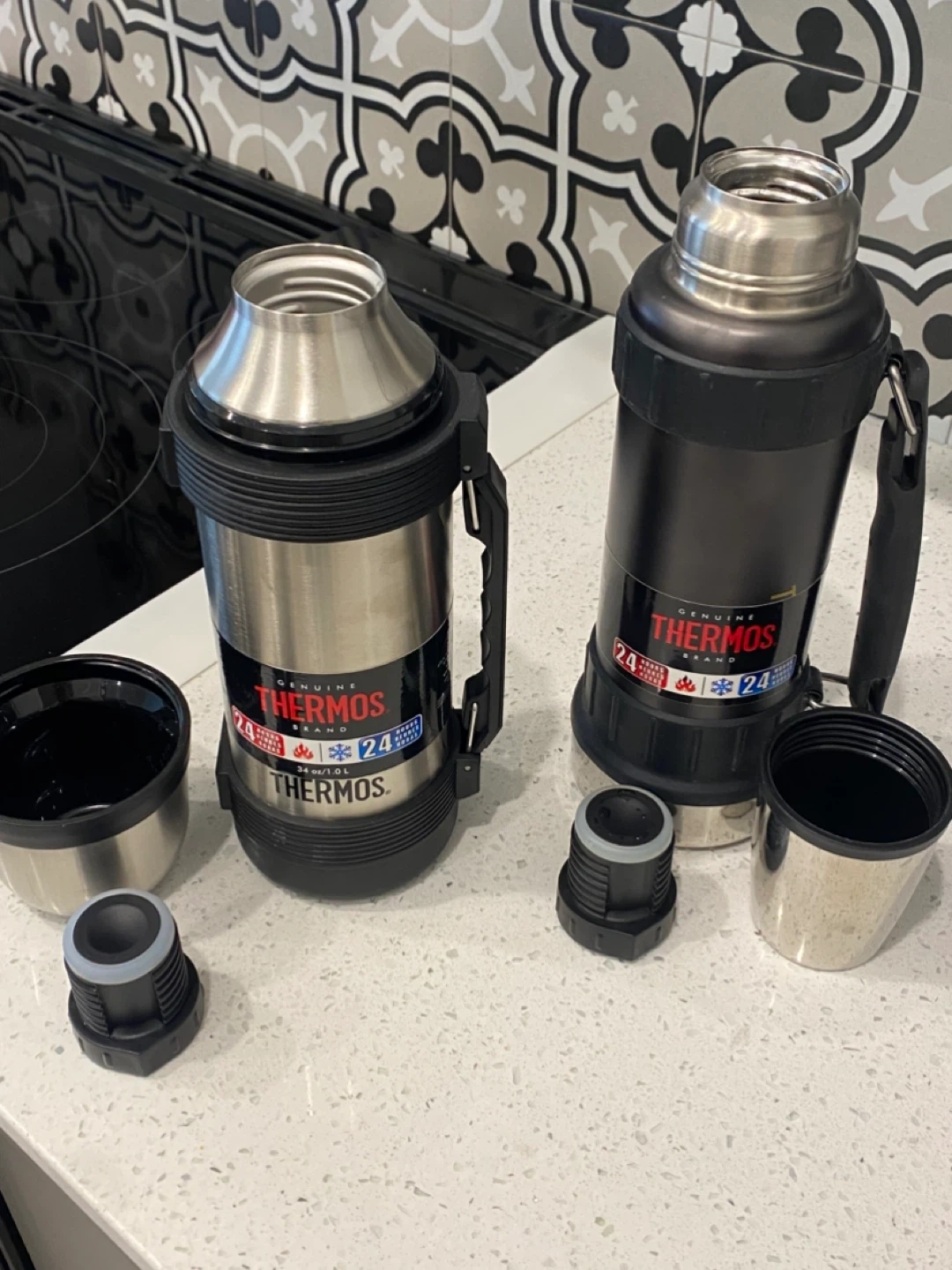 I'm selling these Thermos brand thermoses. They are 34 oz/1.0 L Genuine Thermos brand. They keep your drinks hot or cold for up to 24 hours. Great for camping or long days at work!