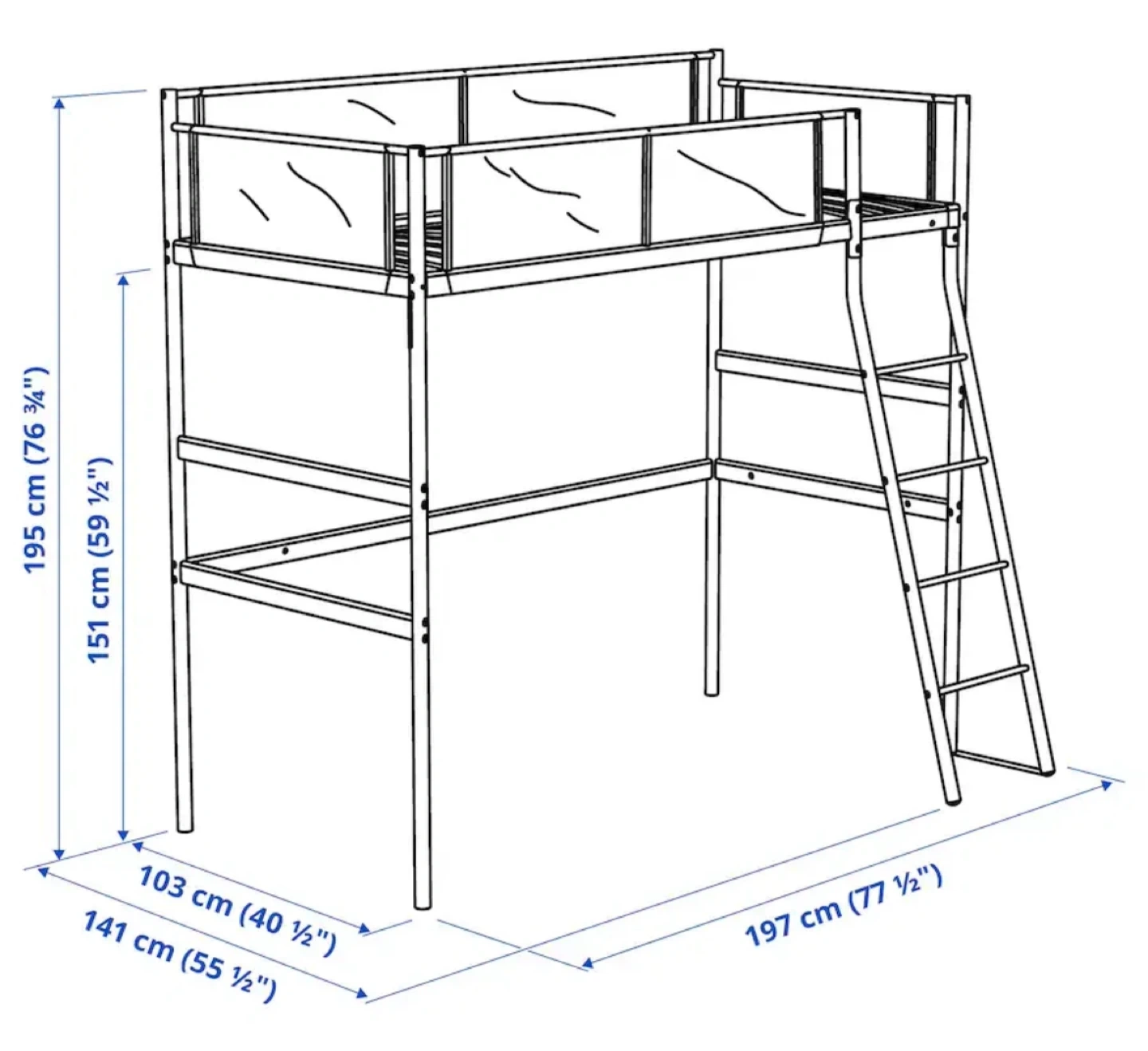 Selling an IKEA Småstad loft bed frame in white and grey. It's in great condition and perfect for maximizing space in a smaller room. The dimensions are approximately 197 cm x 141 cm x 195 cm.