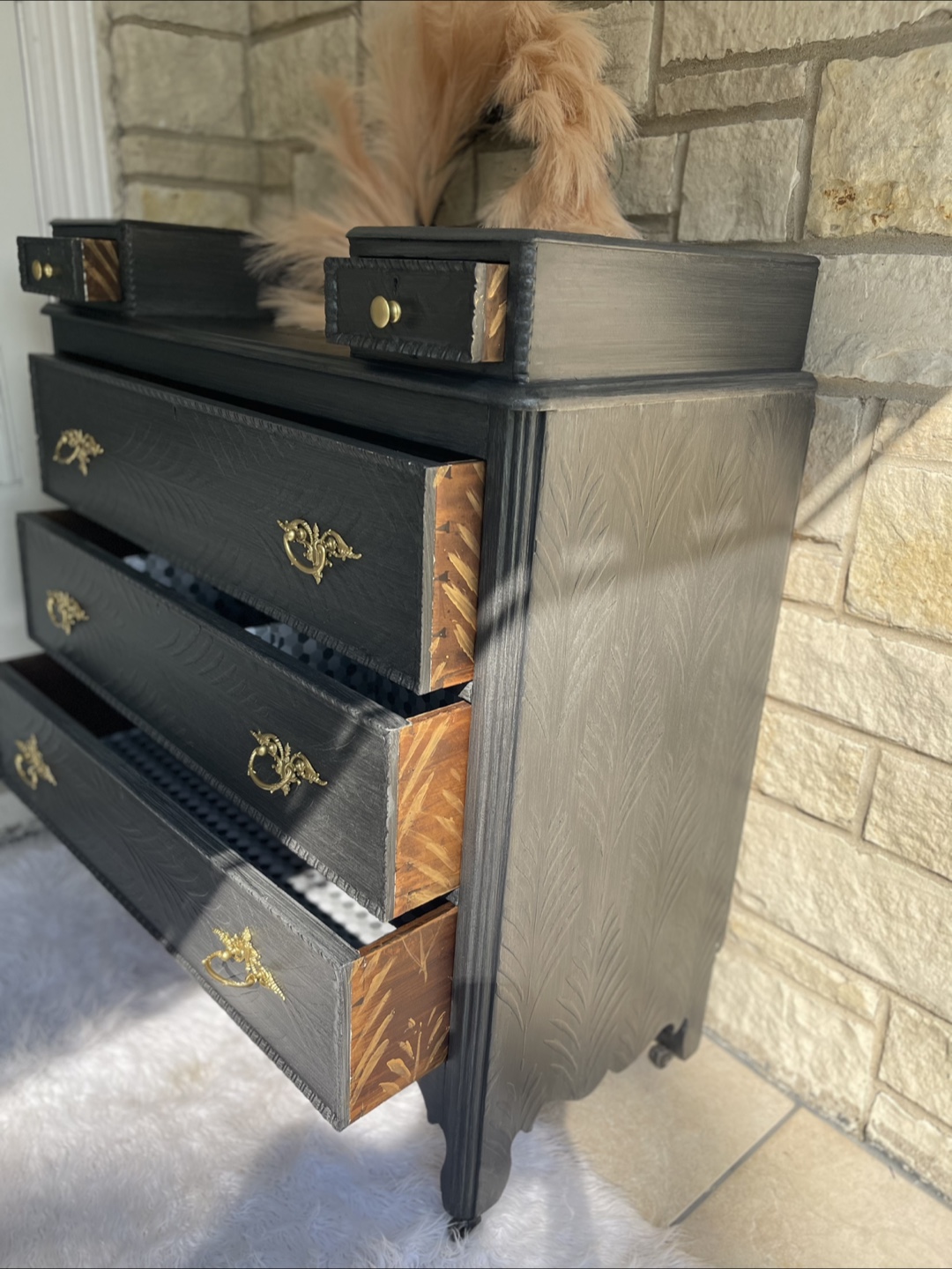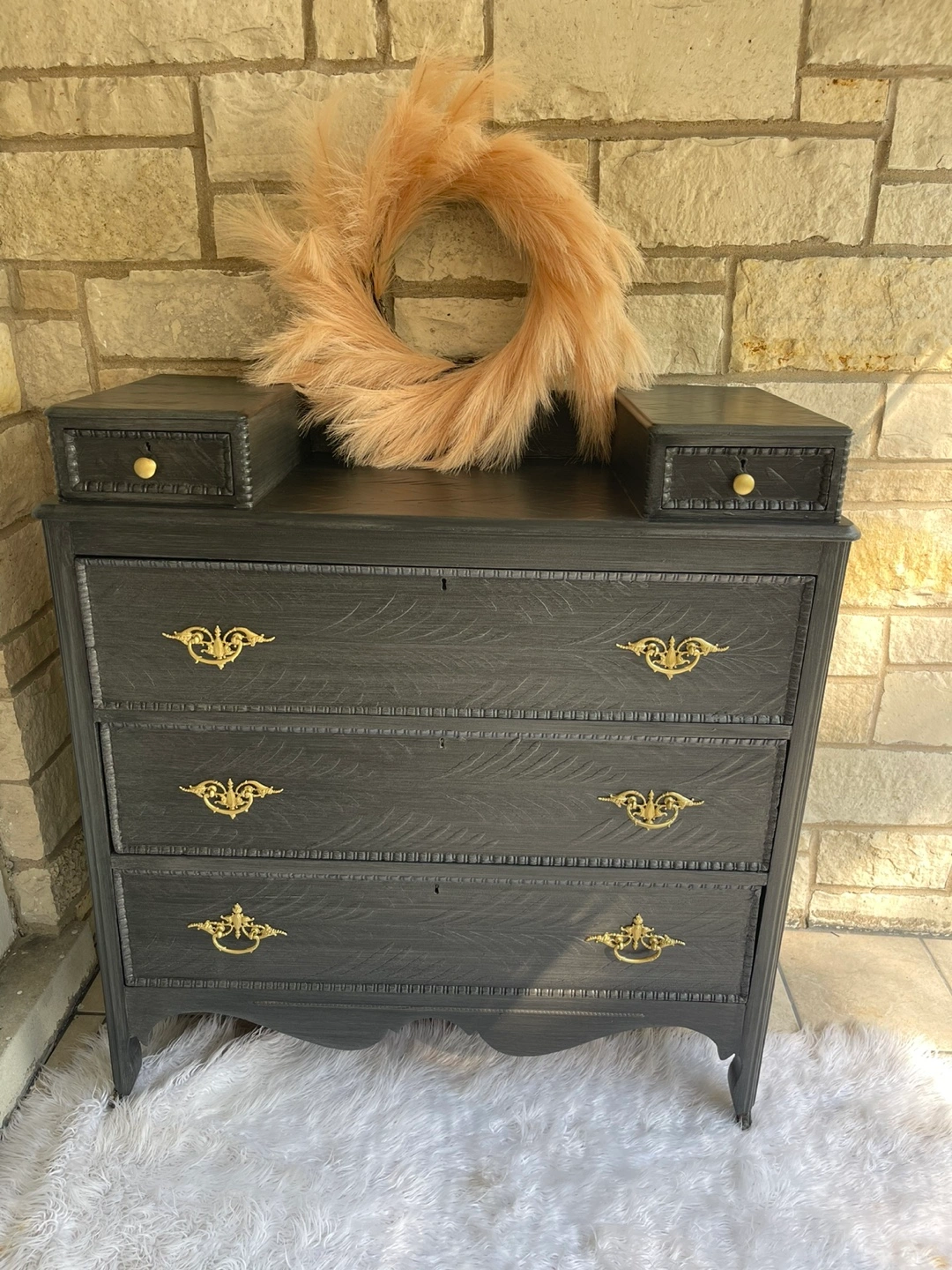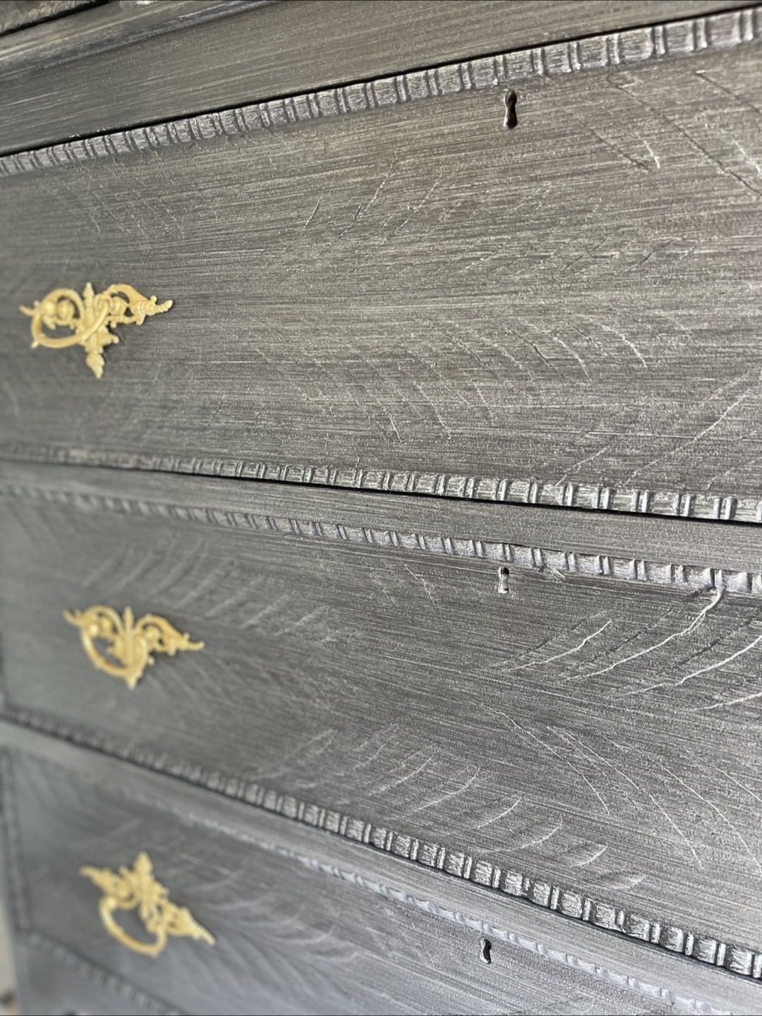 Beautiful and unique piece of Furniture-5 drawers Entrance Piece/ Vanity/Dresser redone in modern brushed gray color with raised stencil details. Featuring 2 coats of primer, 2 coats of paint, 3 layers of polycrylic for extra protection and durability.
