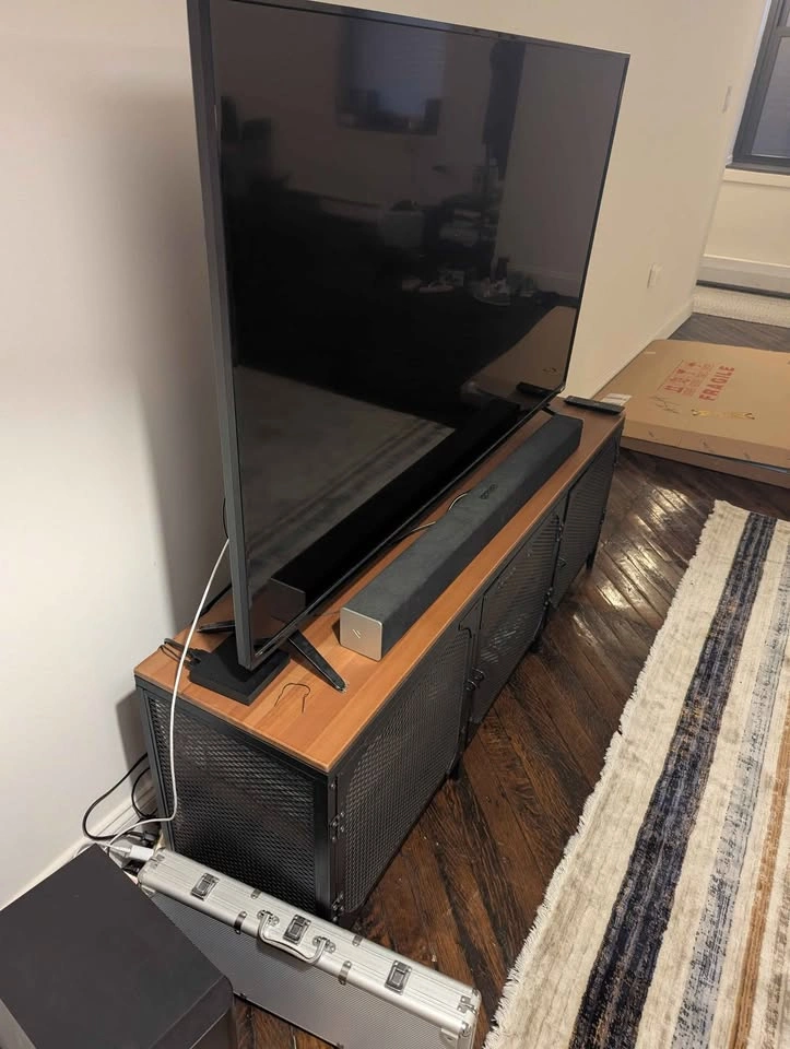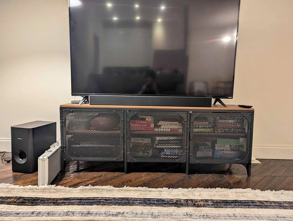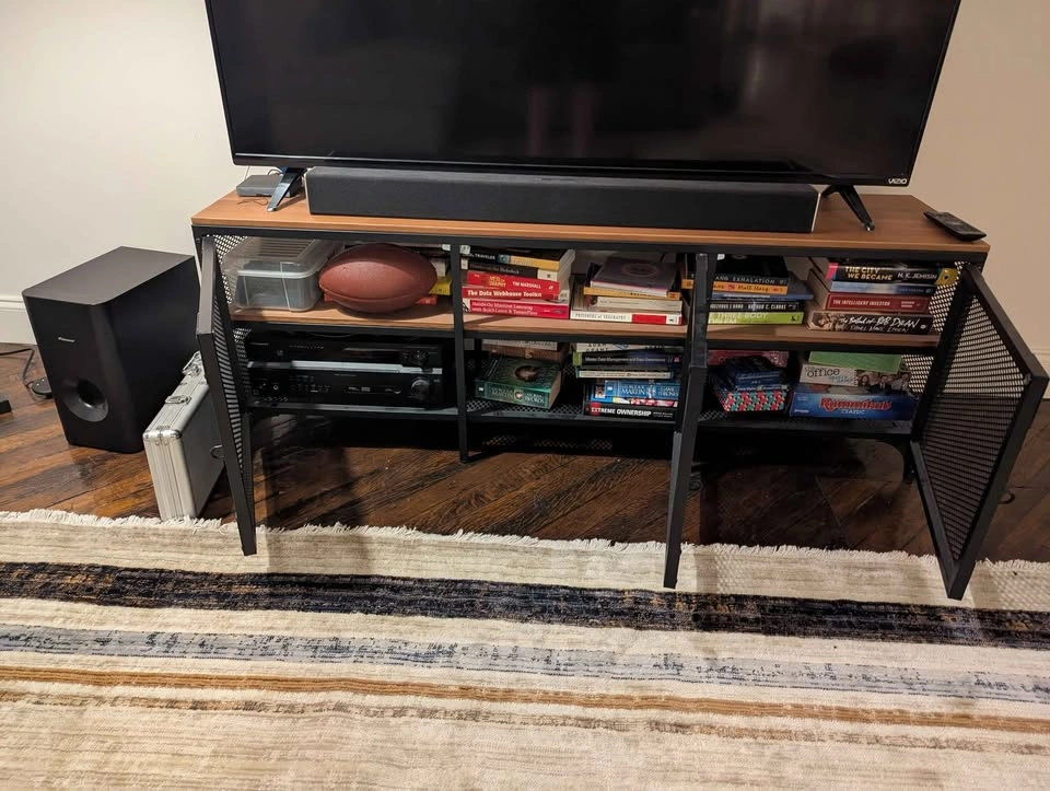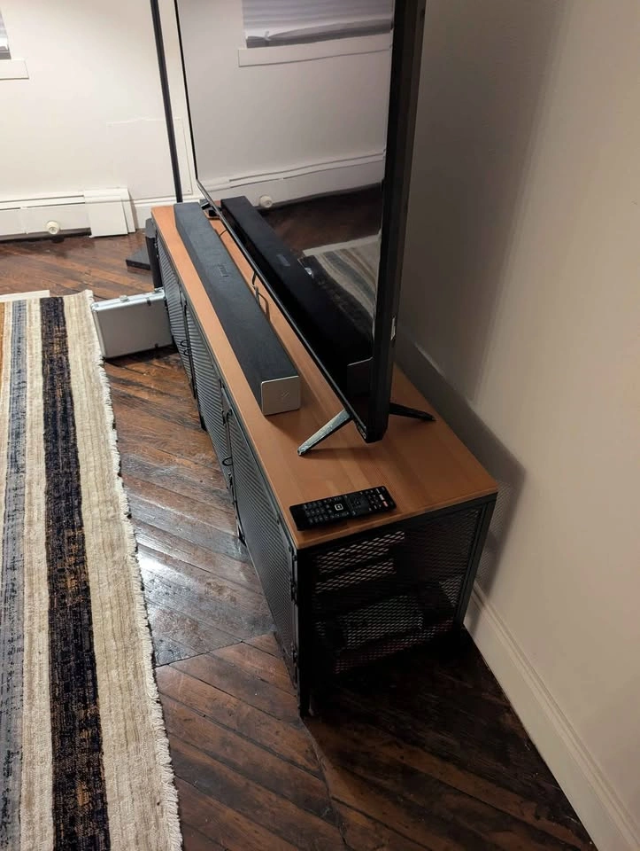 TV stand with storage. Wood surface with black painted metal shelves and doors. A few small dents on the top (pictured) from a previous move.