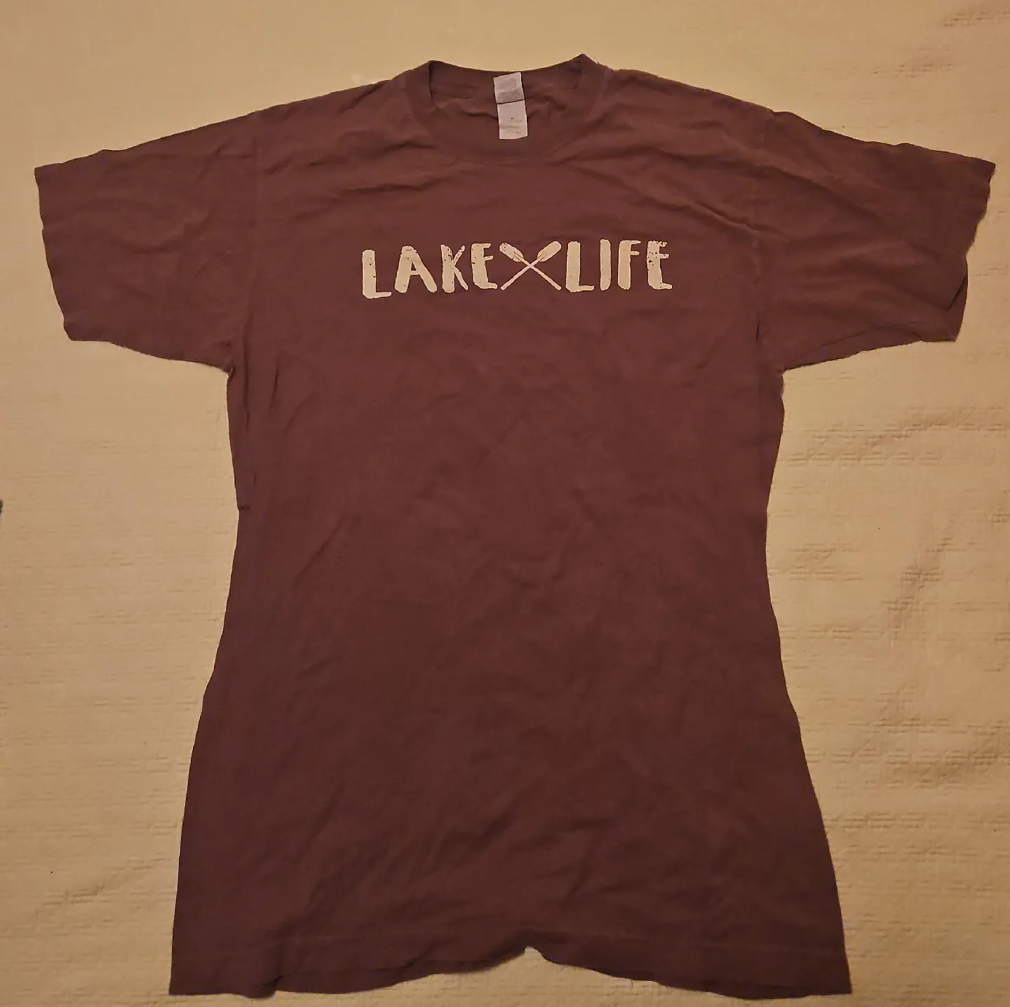 Lake Life t-shirt in size medium. The shirt is a pale purple with the words 'LAKE LIFE' printed on the front. It is made of 100% cotton. New without tags, never worn.