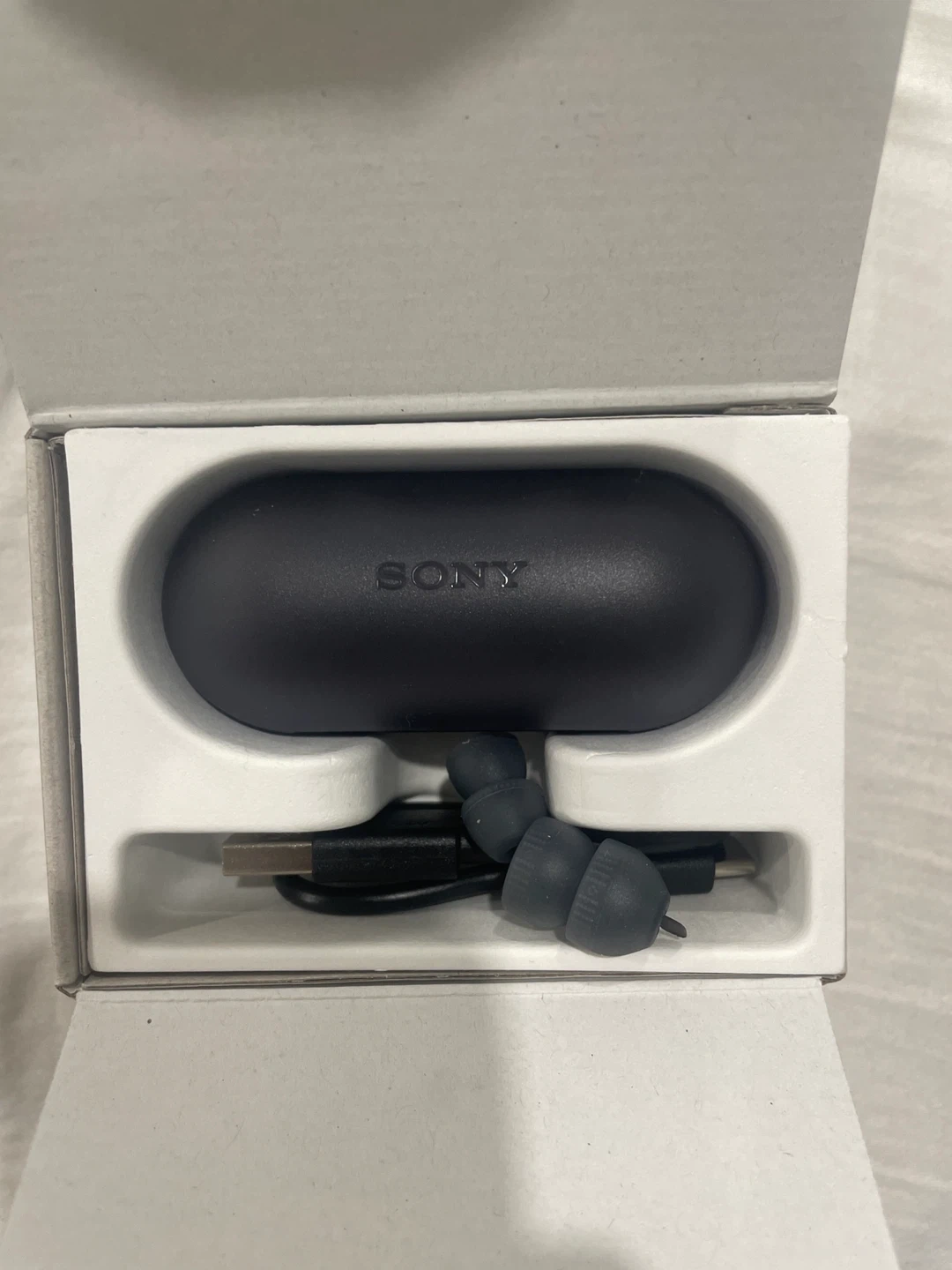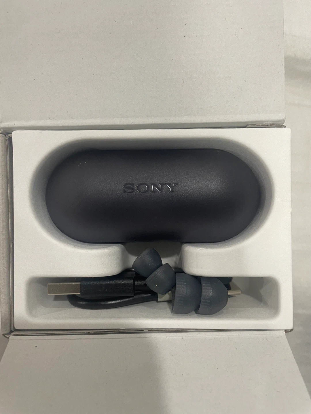 Brand new!!! Sony wireless noise-cancelling earbuds in black! They come with their original box and all included components like the charger and extra earbud tips. Great for listening to music or podcasts on the go! Bought but never used, still in complete packaging. Original 175.