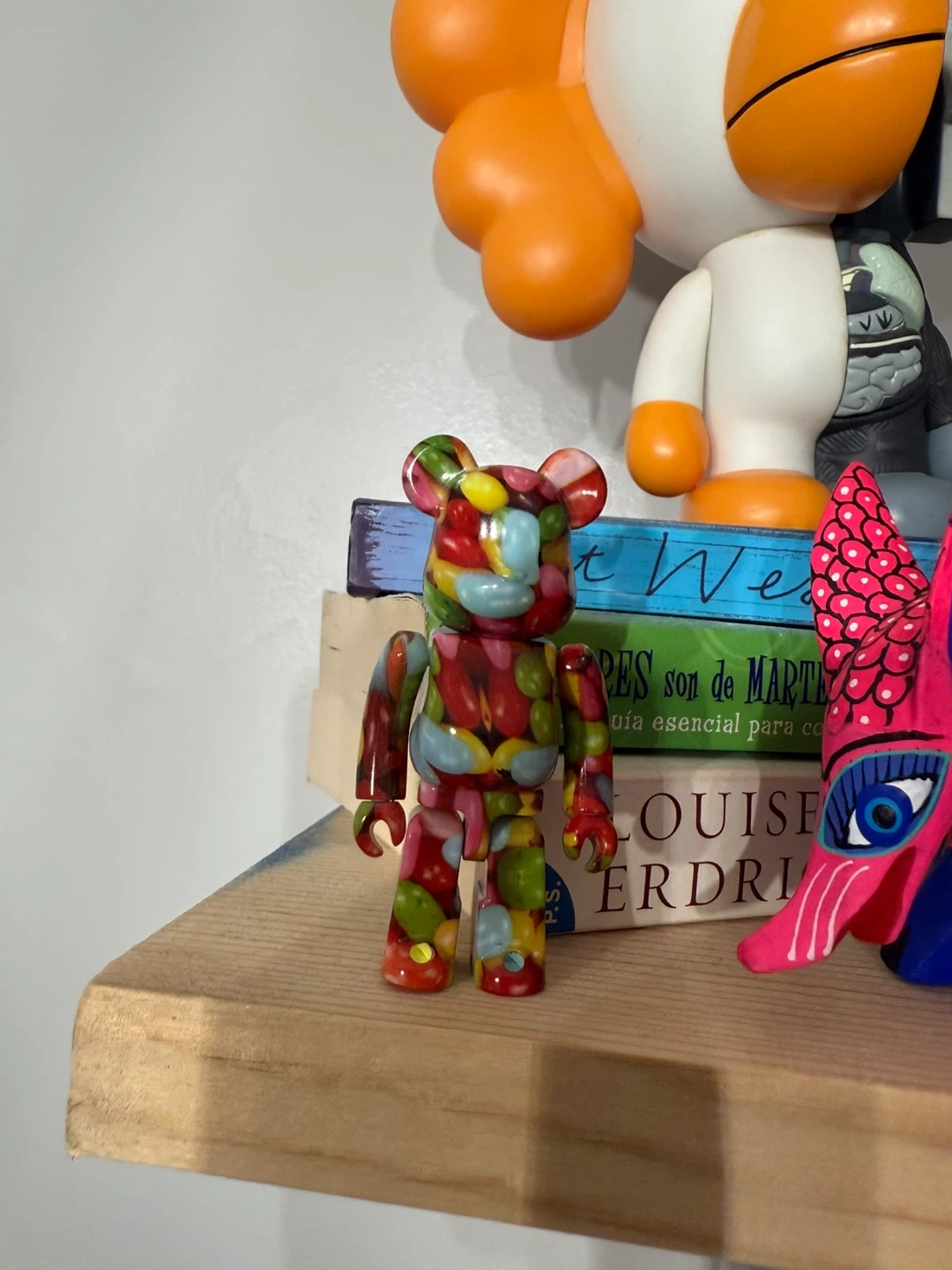 Here's a Bearbrick figure with a fun jelly bean design. It's a cool collectible piece that would look great on a shelf or desk. The figure has a colorful and unique pattern, making it a standout item!