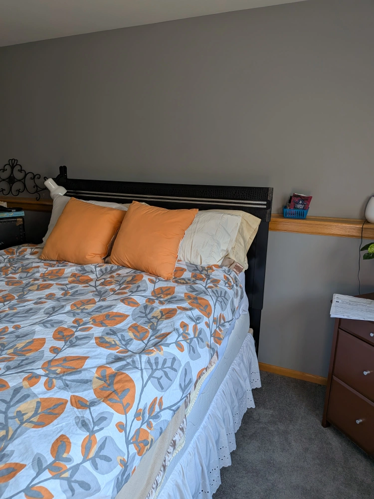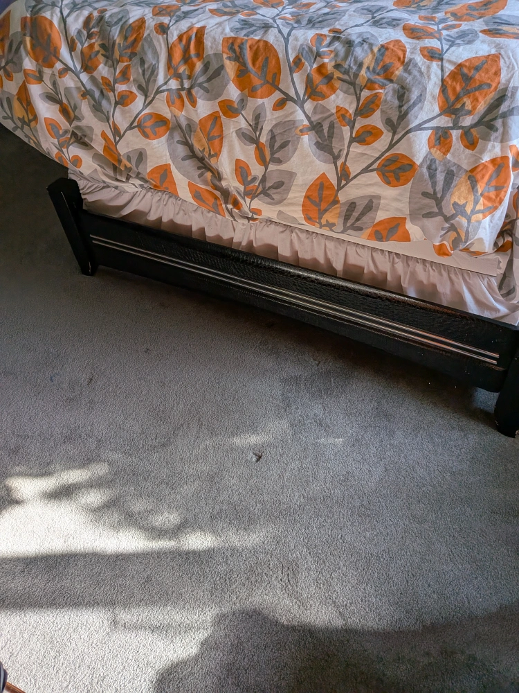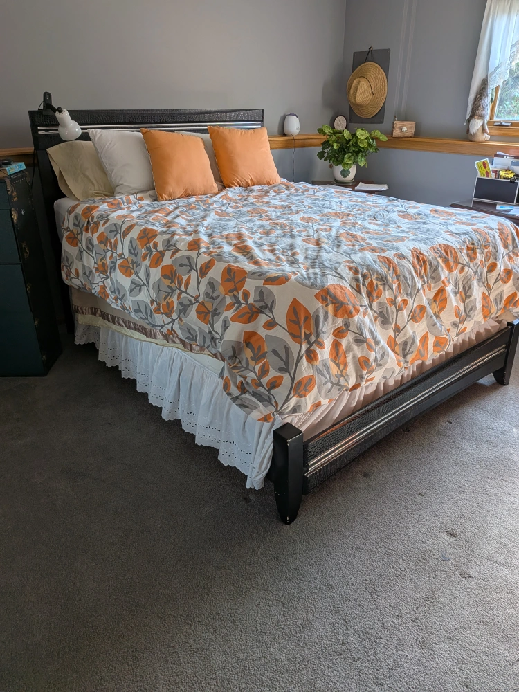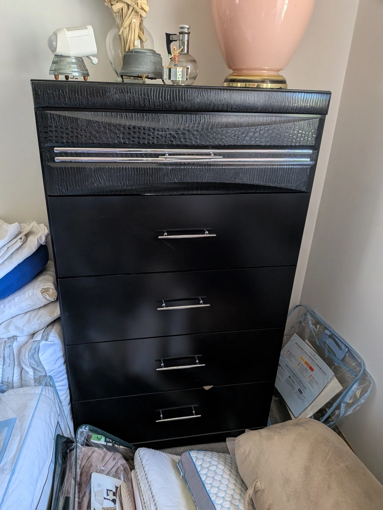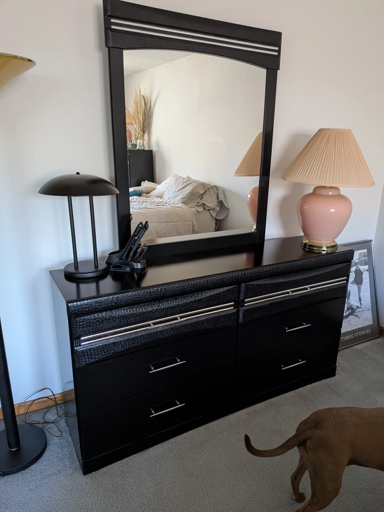 Selling a bedroom set that includes a bed frame, a tall chest of drawers, and a dresser with a mirror. The set is black and features a unique textured design on the headboard, top drawer of the chest, and top of the dresser. It's a stylish set that could really complete a bedroom!