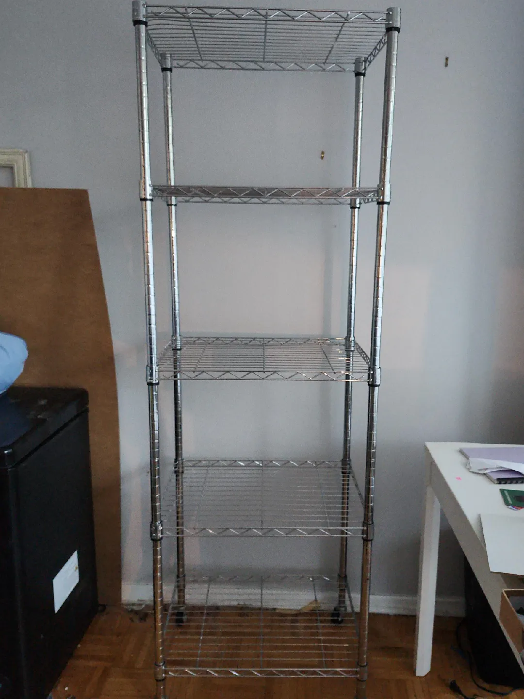 Selling a handy chrome wire shelving unit! It has 5 tiers, perfect for organizing your space. Great for the kitchen, garage, or anywhere you need extra storage. It's in good condition and ready for a new home