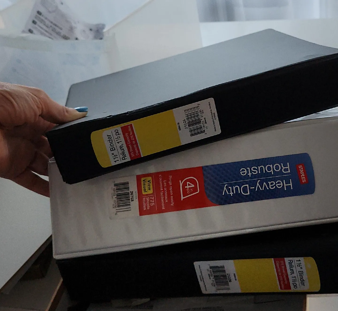 Selling some Staples 1 1/2" binders! One is a heavy-duty robuste binder that can hold up to 775 sheets. The other can hold 275 sheets. Perfect for school or office use