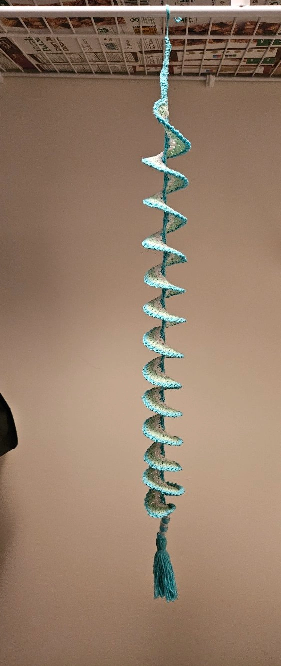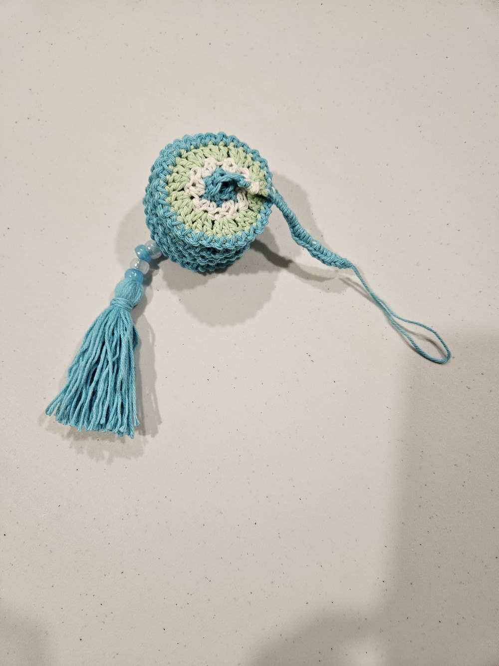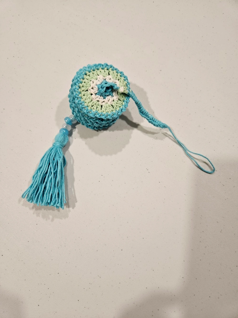 This is a handmade crochet windspinner. It's a unique piece that would look great in any room or outside. The colours are light blue, white and green. It has a tassel at the bottom with beads. It's in great condition as it's new!