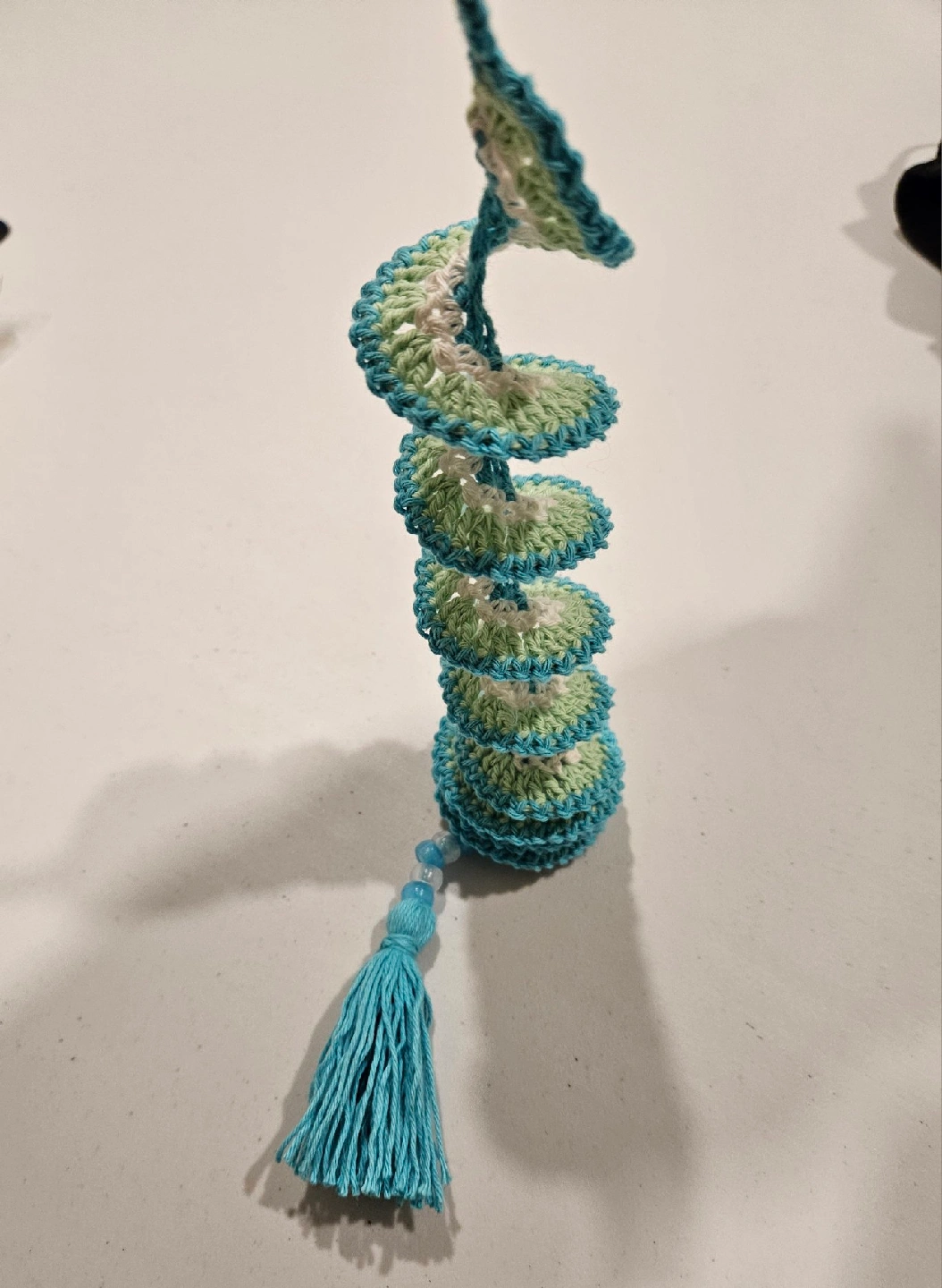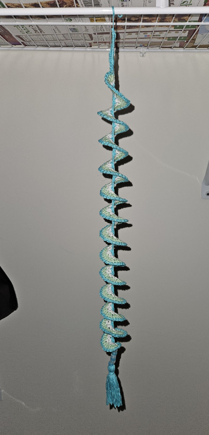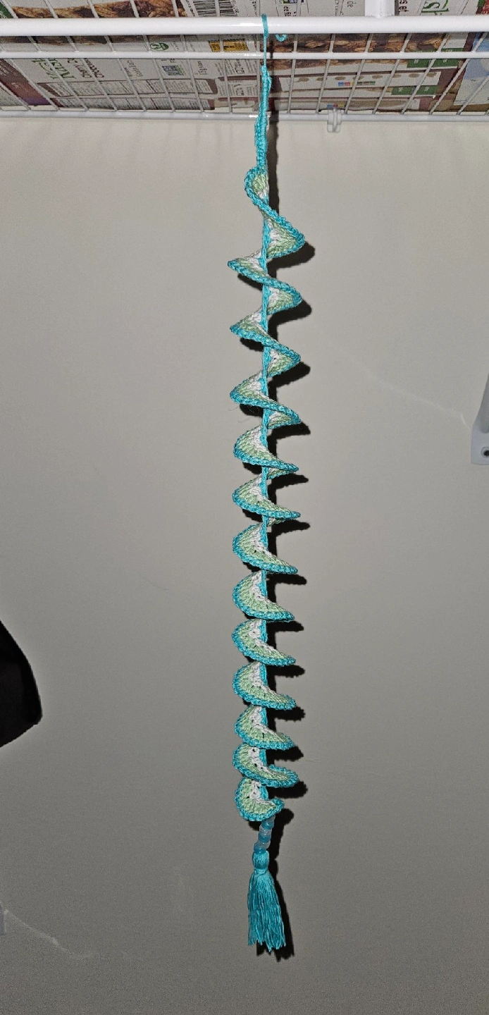 This is a handmade crochet windspinner. It's a unique piece that would look great in any room or outside. The colours are light blue, white and green. It has a tassel at the bottom with beads. It's in great condition as it's new!