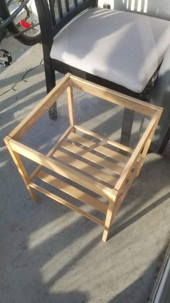 Selling a cute wooden side table with a glass top! It's perfect for a small space or as an accent piece. The table has a simple, clean design and is in good condition. The glass is slightly dirty but can be cleaned easily