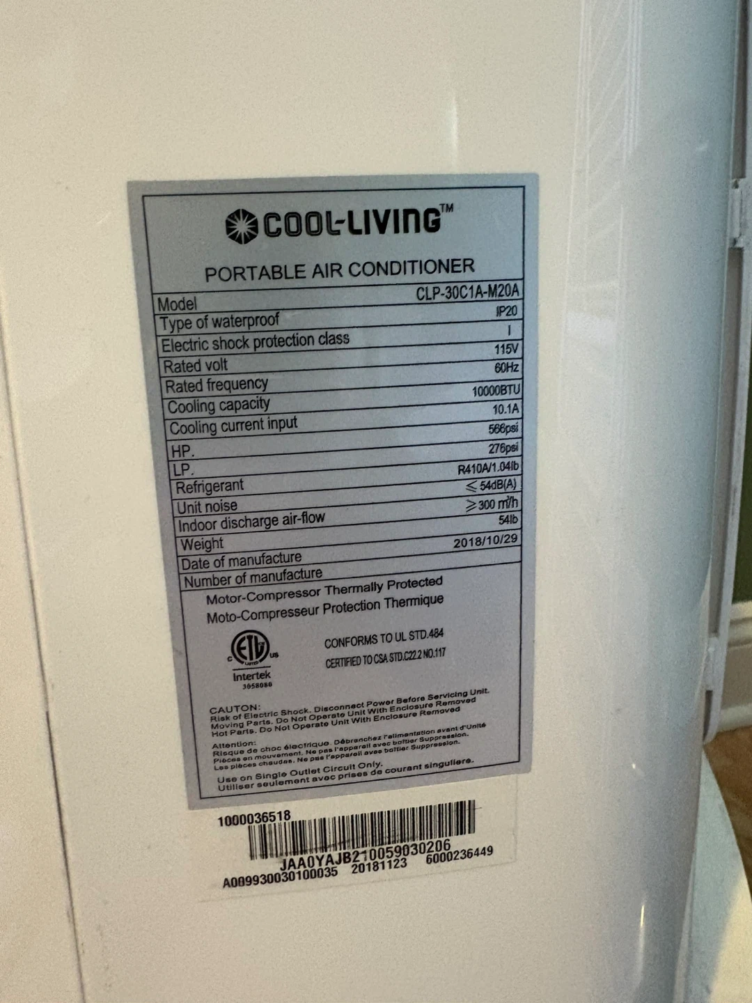 Selling a Cool-Living portable air conditioner, model CLP-30C1A-M20A. It has a cooling capacity of 10000BTU. The date of manufacture is 2018 October 29