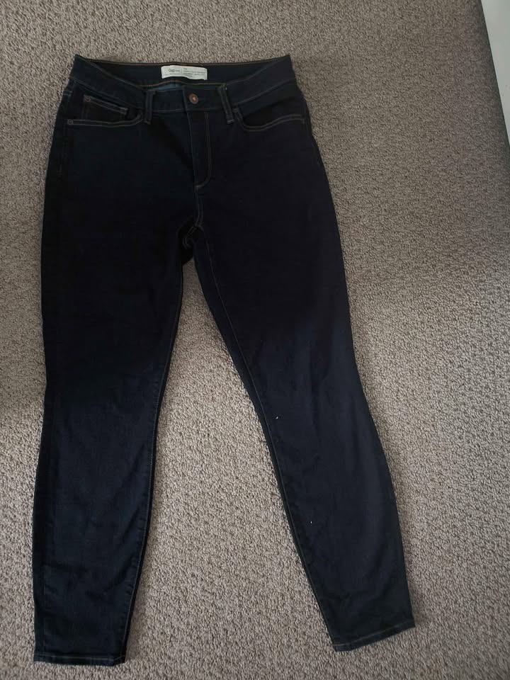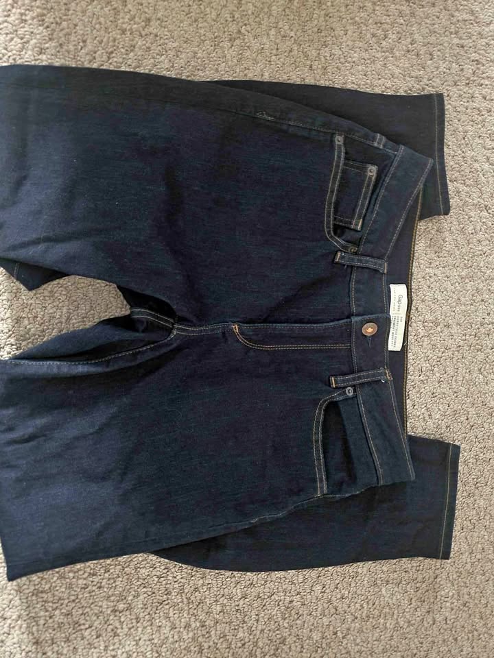 Never worn Old Navy 30r jeans. Fit a little baggy. Super comfortable. Orange stitching and copper colored button-great contrast with dark wash.