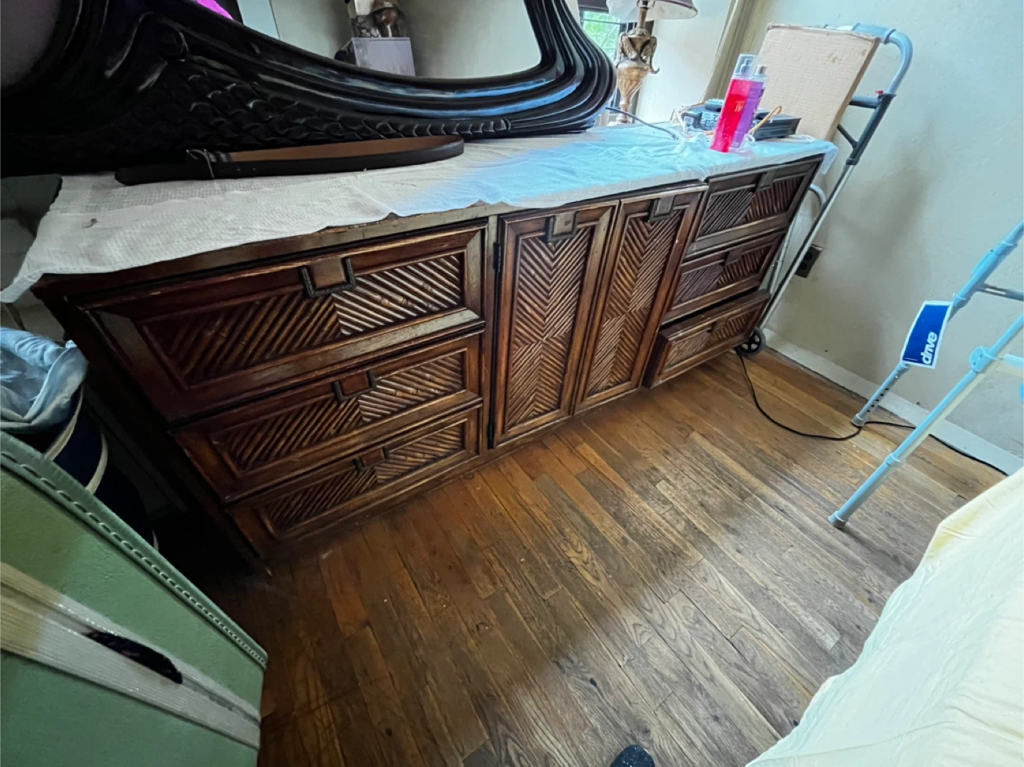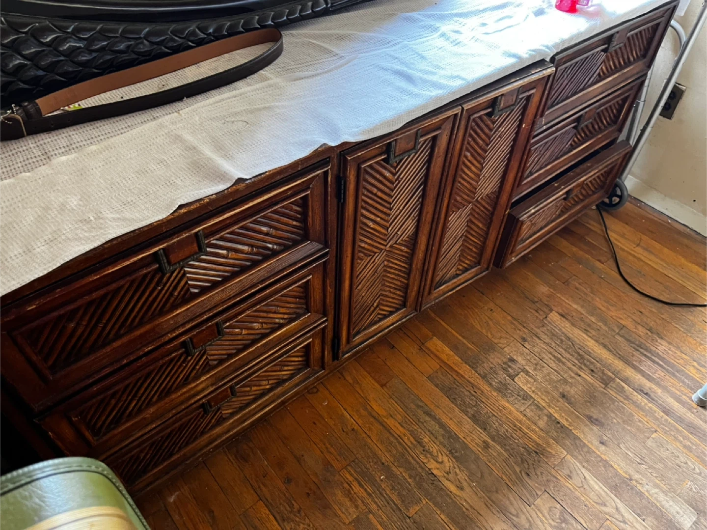 Selling a vintage wood dresser with a unique design. It features multiple drawers and doors, offering ample storage space. The dresser has a distinctive woven pattern on the front panels. It shows some signs of wear, which adds to its vintage charm