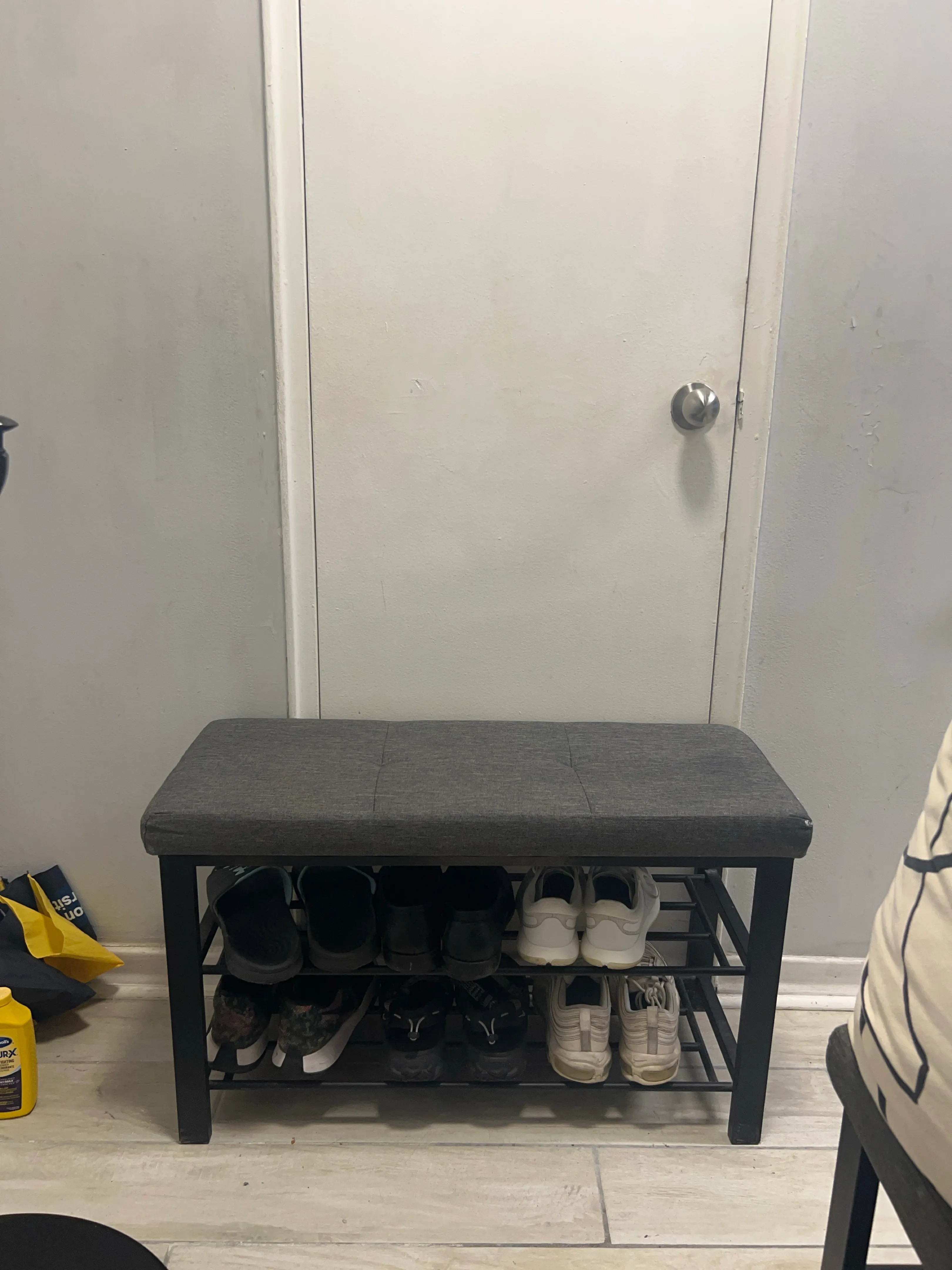 Selling a grey upholstered shoe rack bench. It has a metal frame and can hold multiple pairs of shoes. It's in good condition and would be perfect for an entryway or closet!