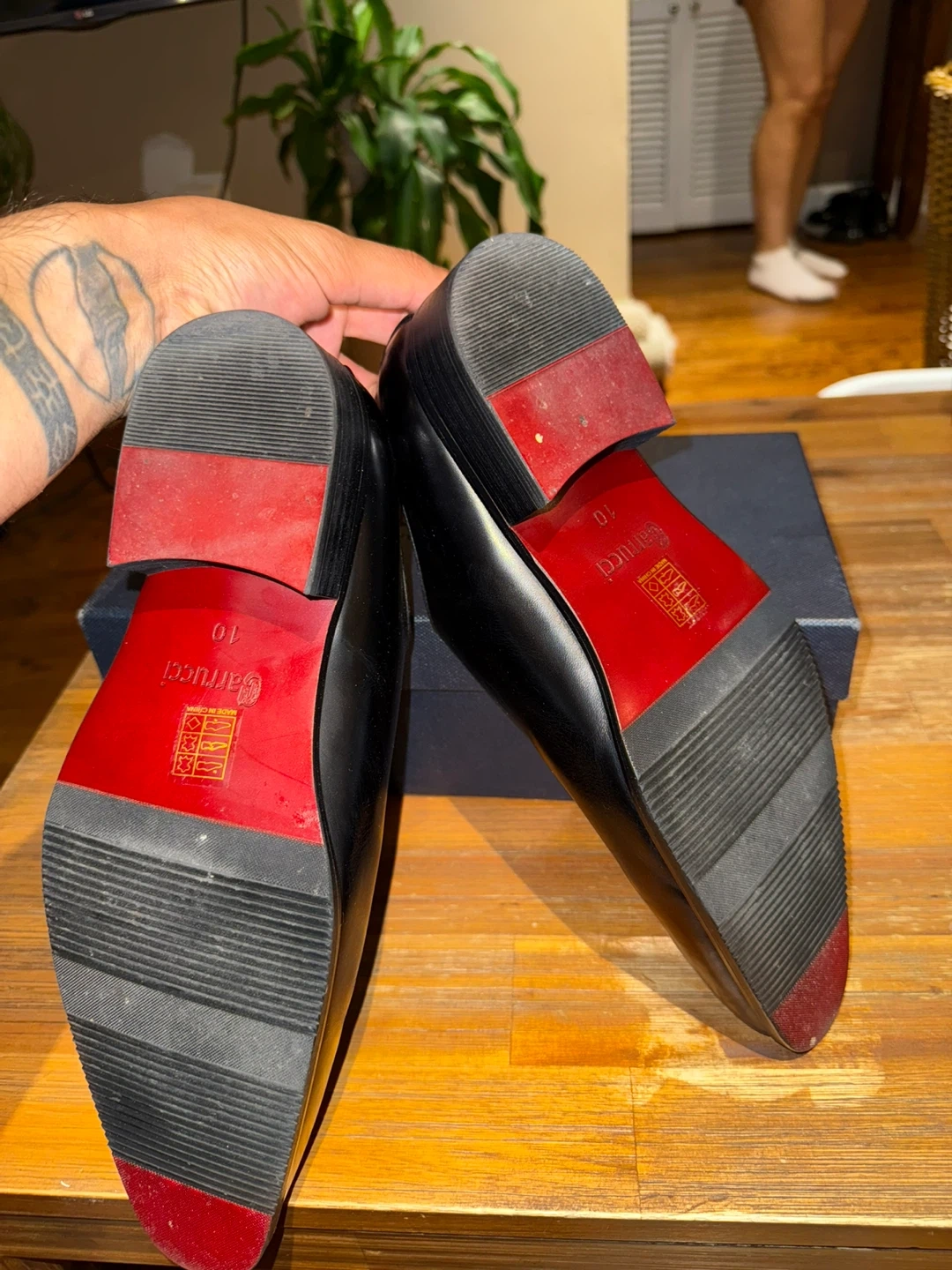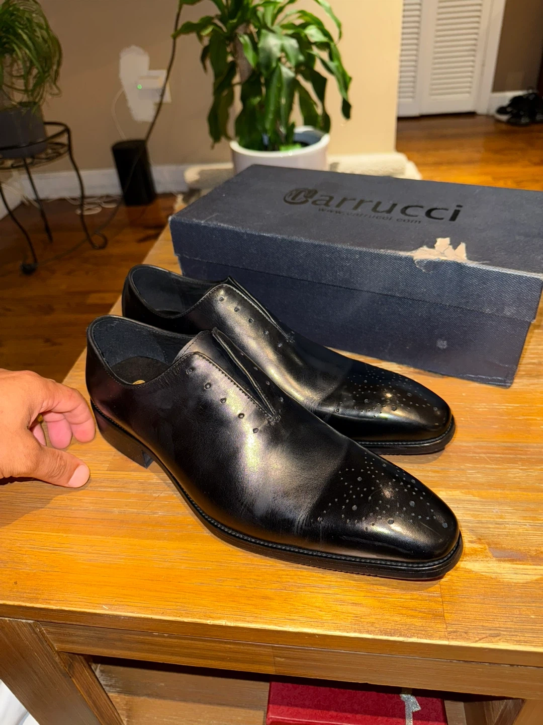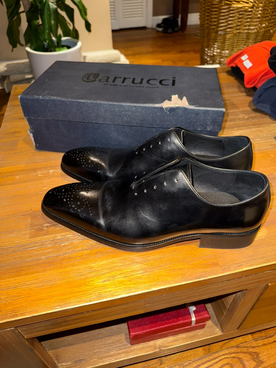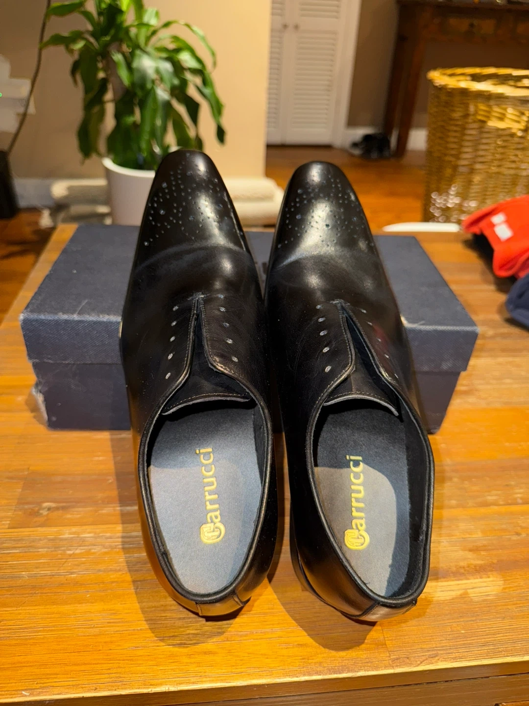 Selling a pair of Carrucci dress shoes in black leather. They are a size 10 and come with the original box. The soles have a red accent color.