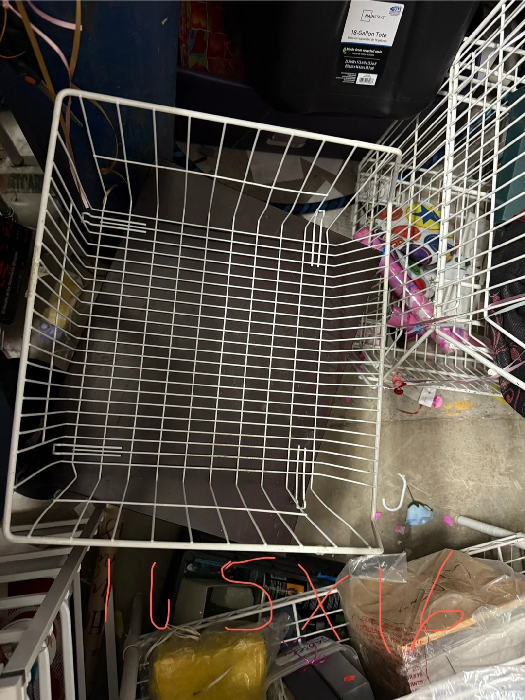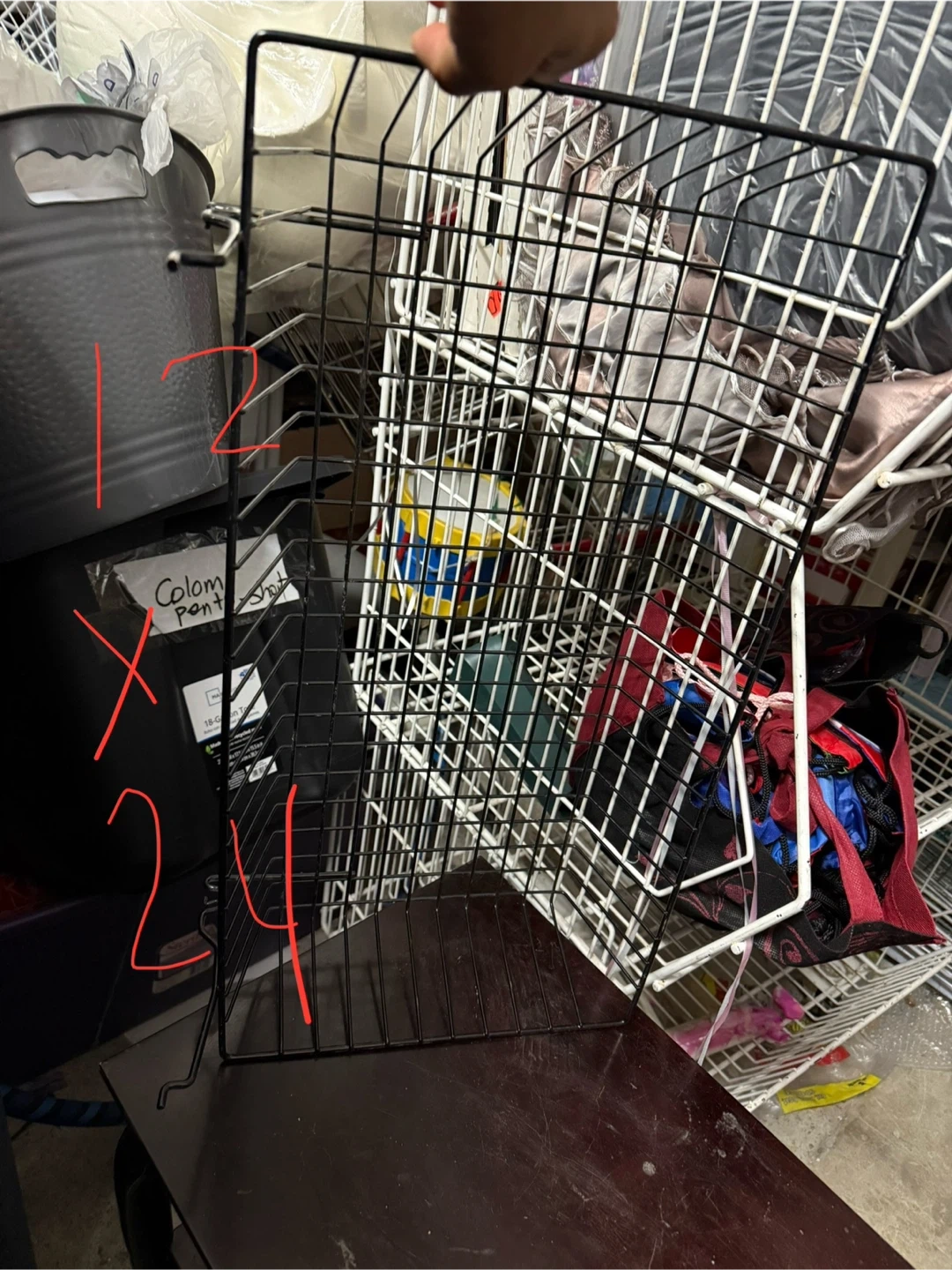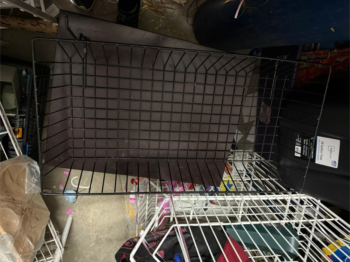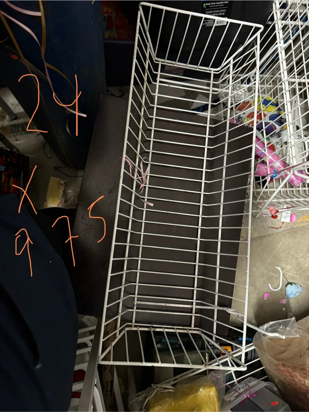 Here are some wire storage baskets, a mix of black and white. They're great for organizing your space and keeping things tidy! Perfect for closets, pantries, or any room that needs a little extra storage
