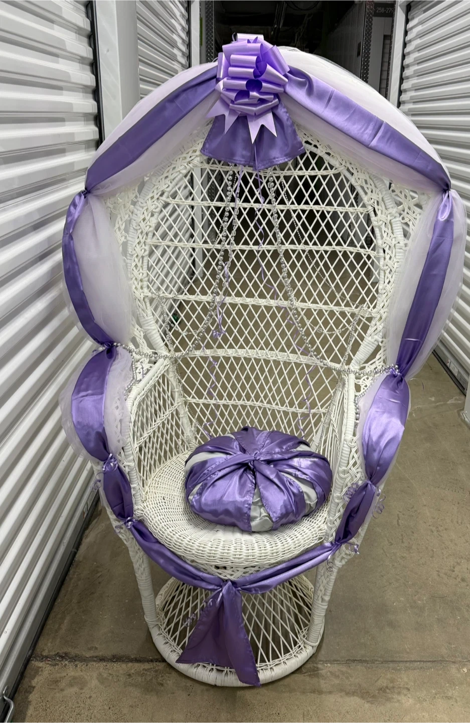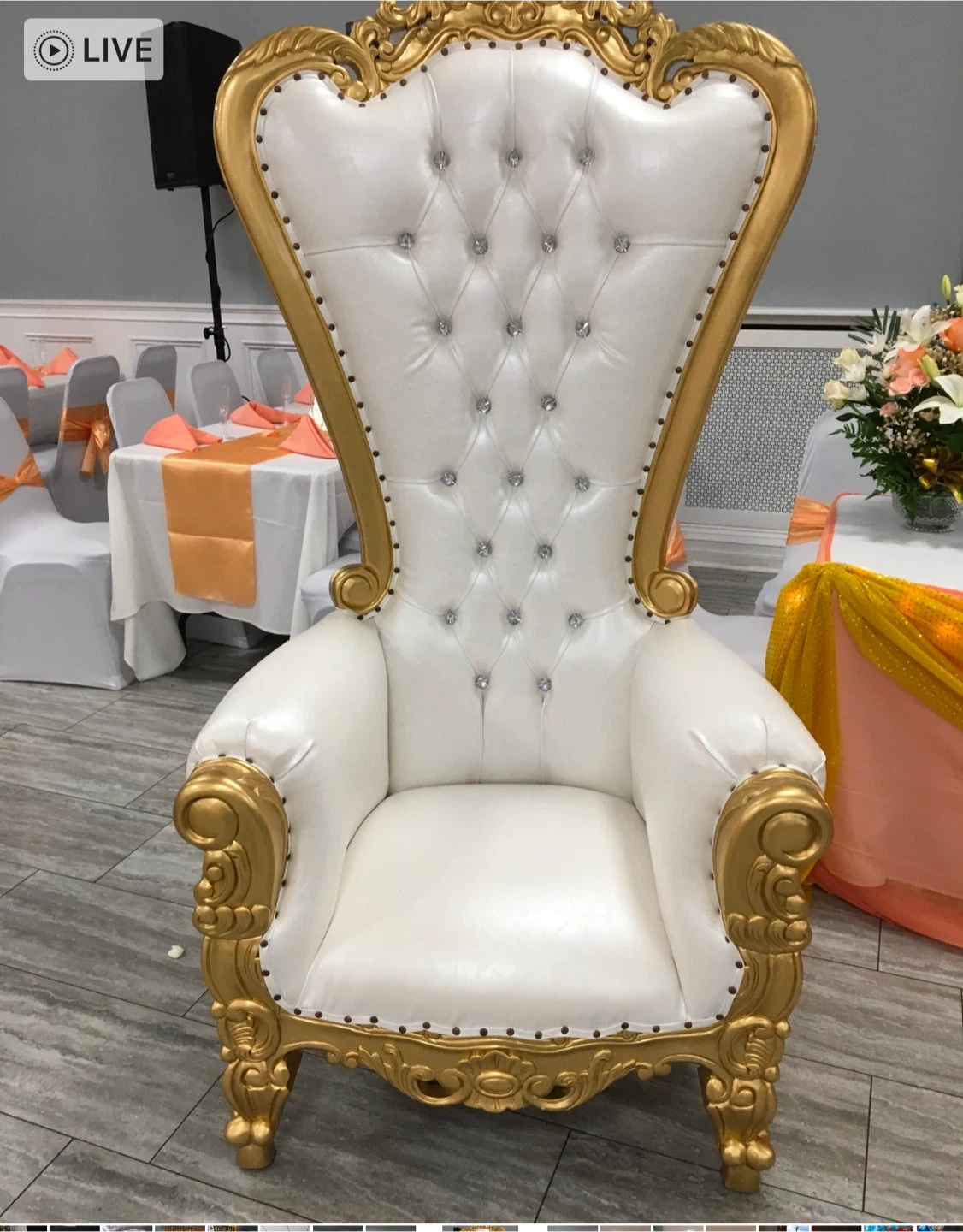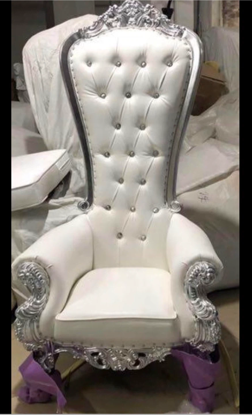 Rent a unique ornate chair! It would make a great accent piece for any room. The chair has a distinctive design with button tufting and decorative trim. It is in good condition and ready to find a new home